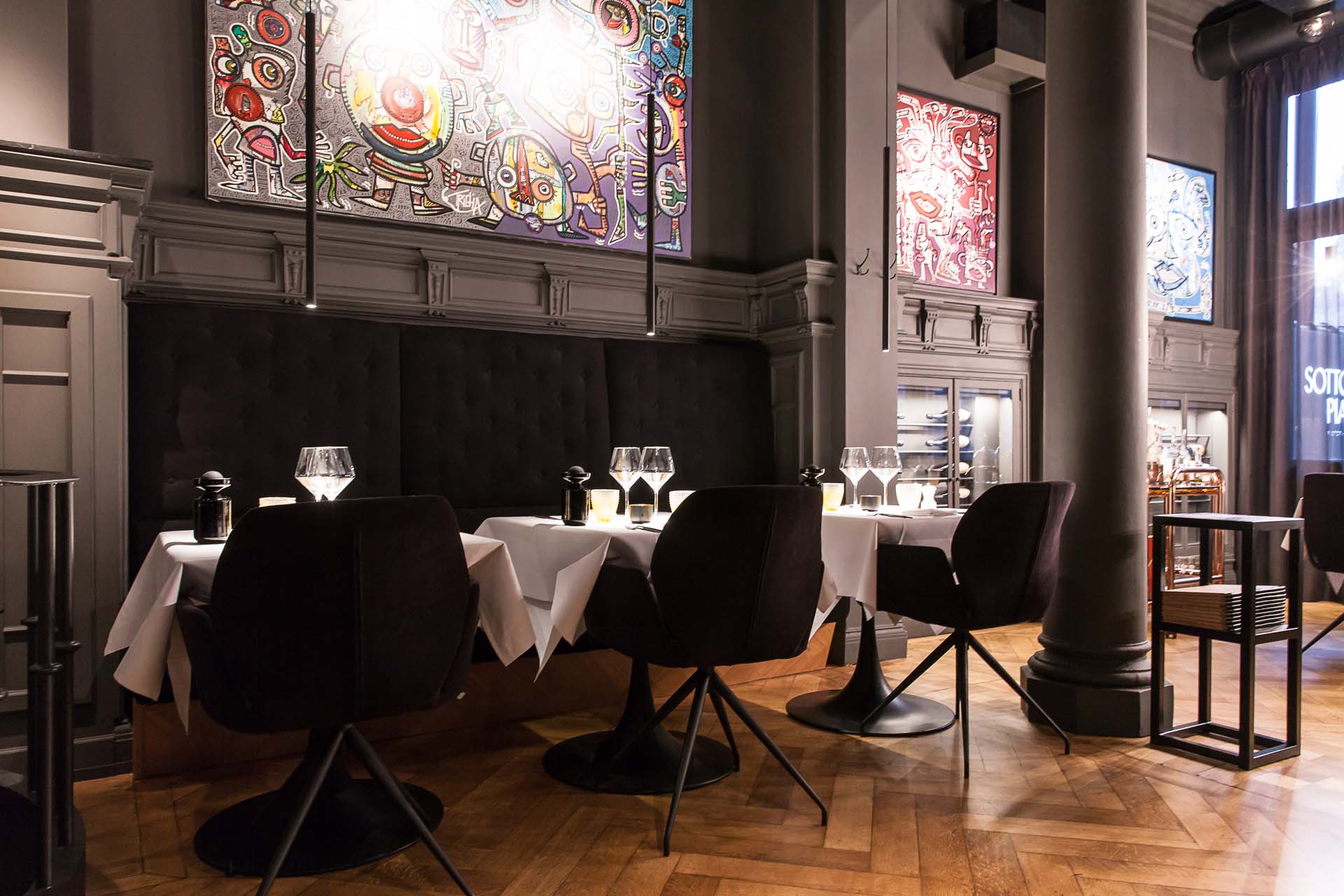 Au SOTTOPIANO, nous avons utilisé la suspension MISS en finition noir mat https://www.davidegroppi.com/lamp/miss/ pour éclairer tout en force et en douceur chaque table du restaurant. La source lumineuse étant en retrait, le flux n’est jamais éblouissant malgré sa puissance.