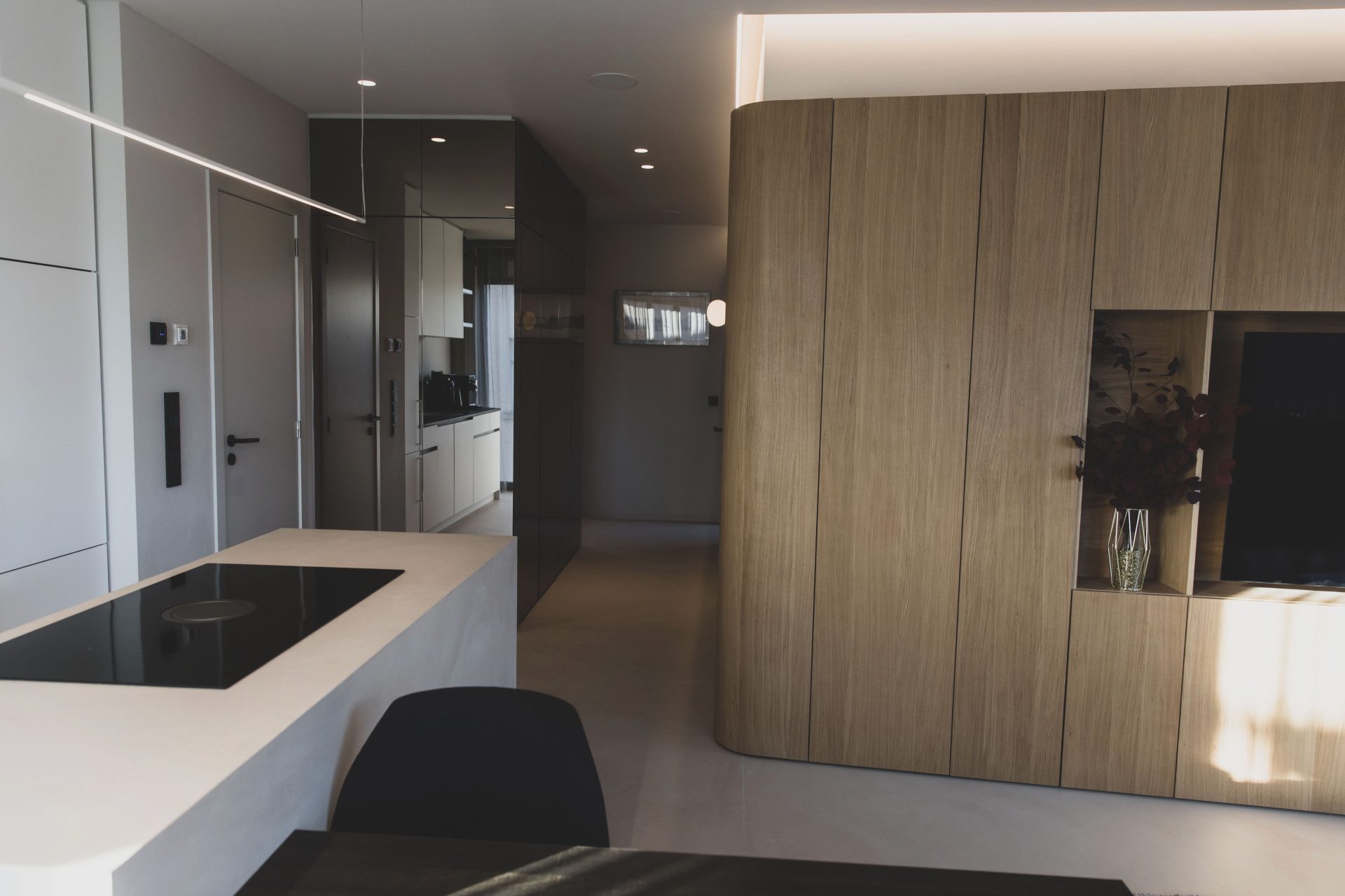 Le sol et l’ilot cuisine sont habillés d’un mortex beige, apportant de la douceur et une certaine zénitude.
