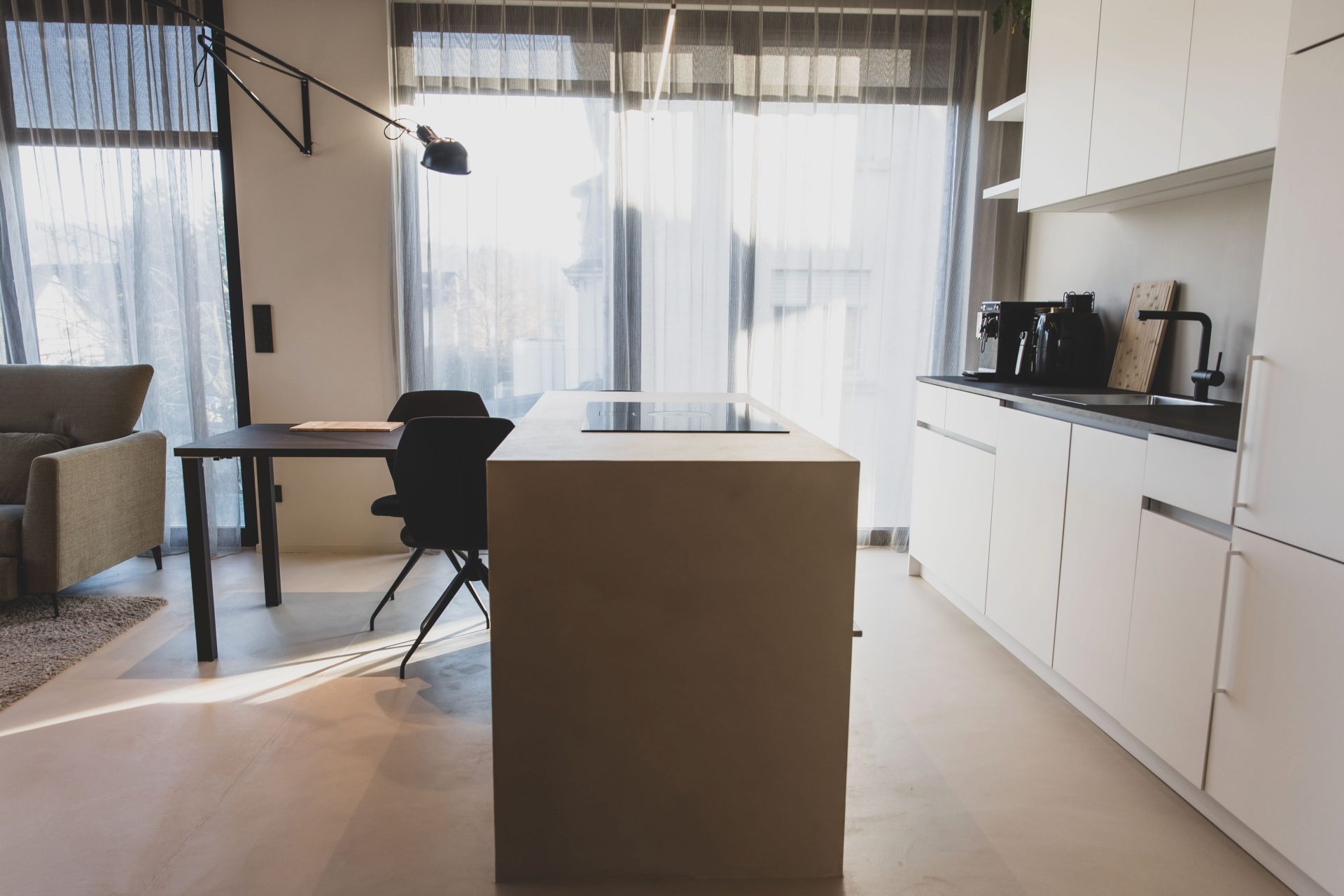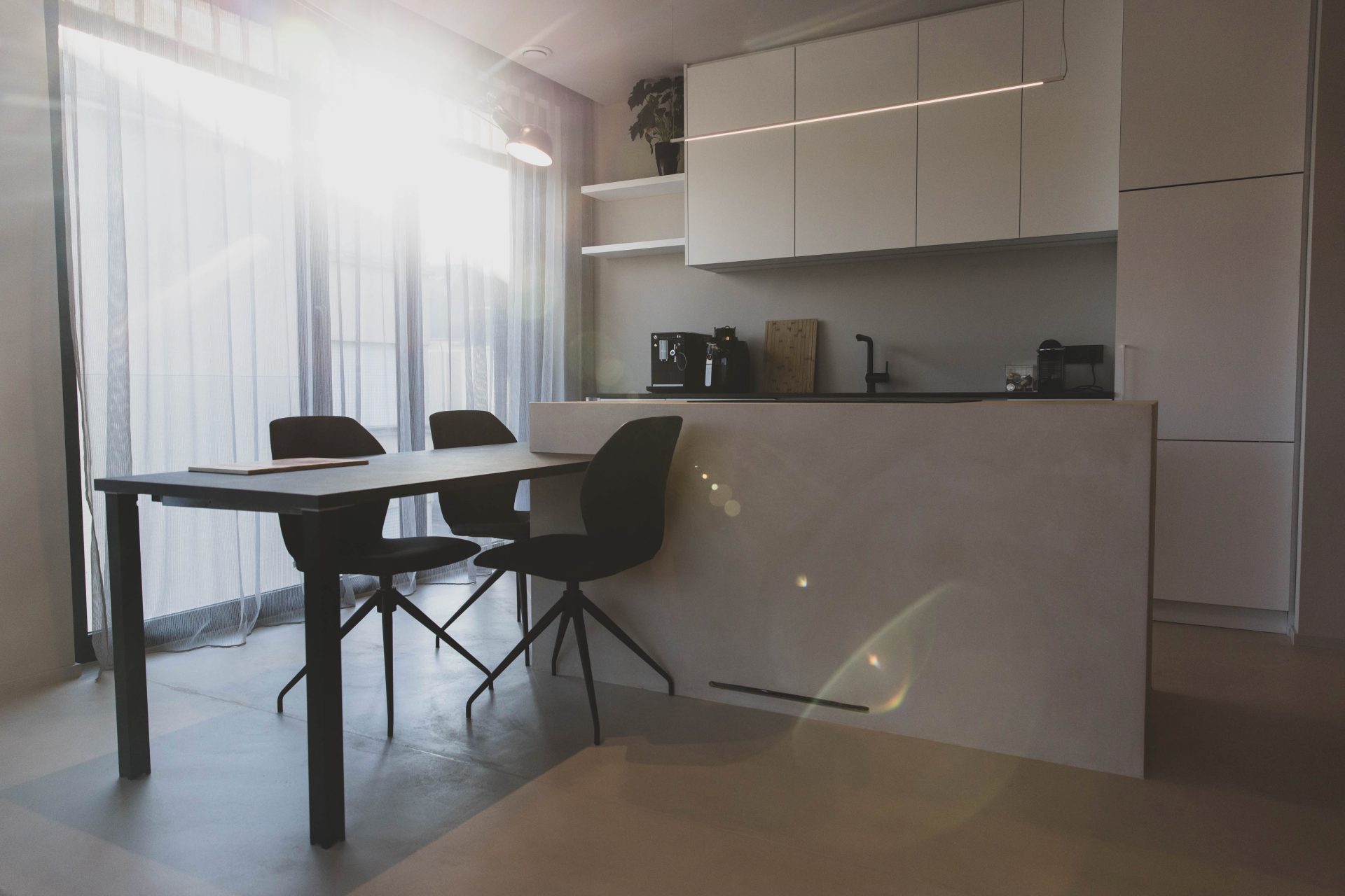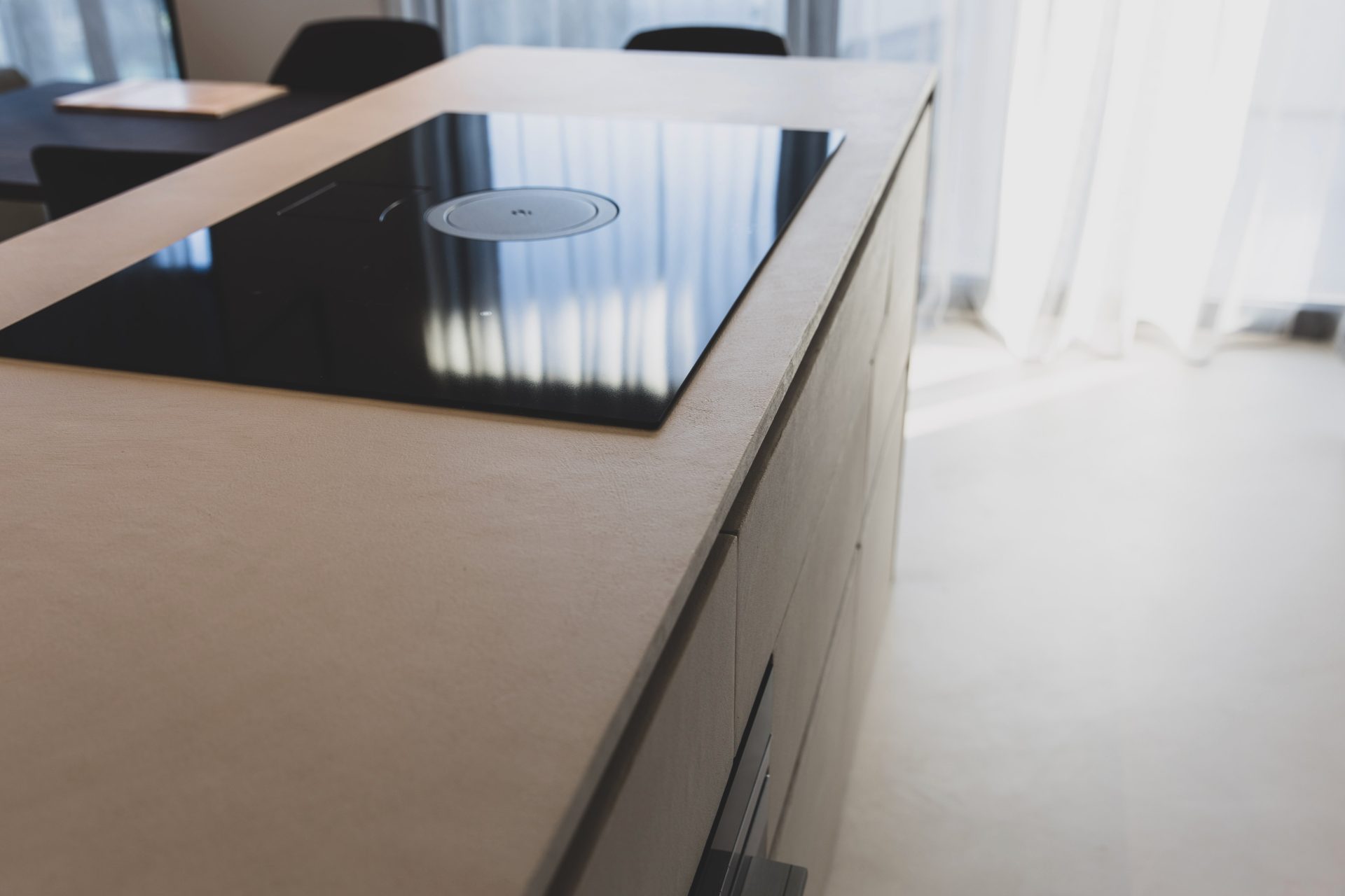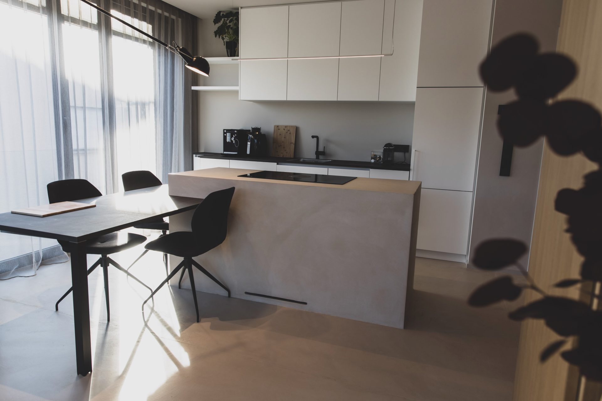 Le sol et l’ilot cuisine sont habillés d’un mortex beige, apportant de la douceur et une certaine zénitude.