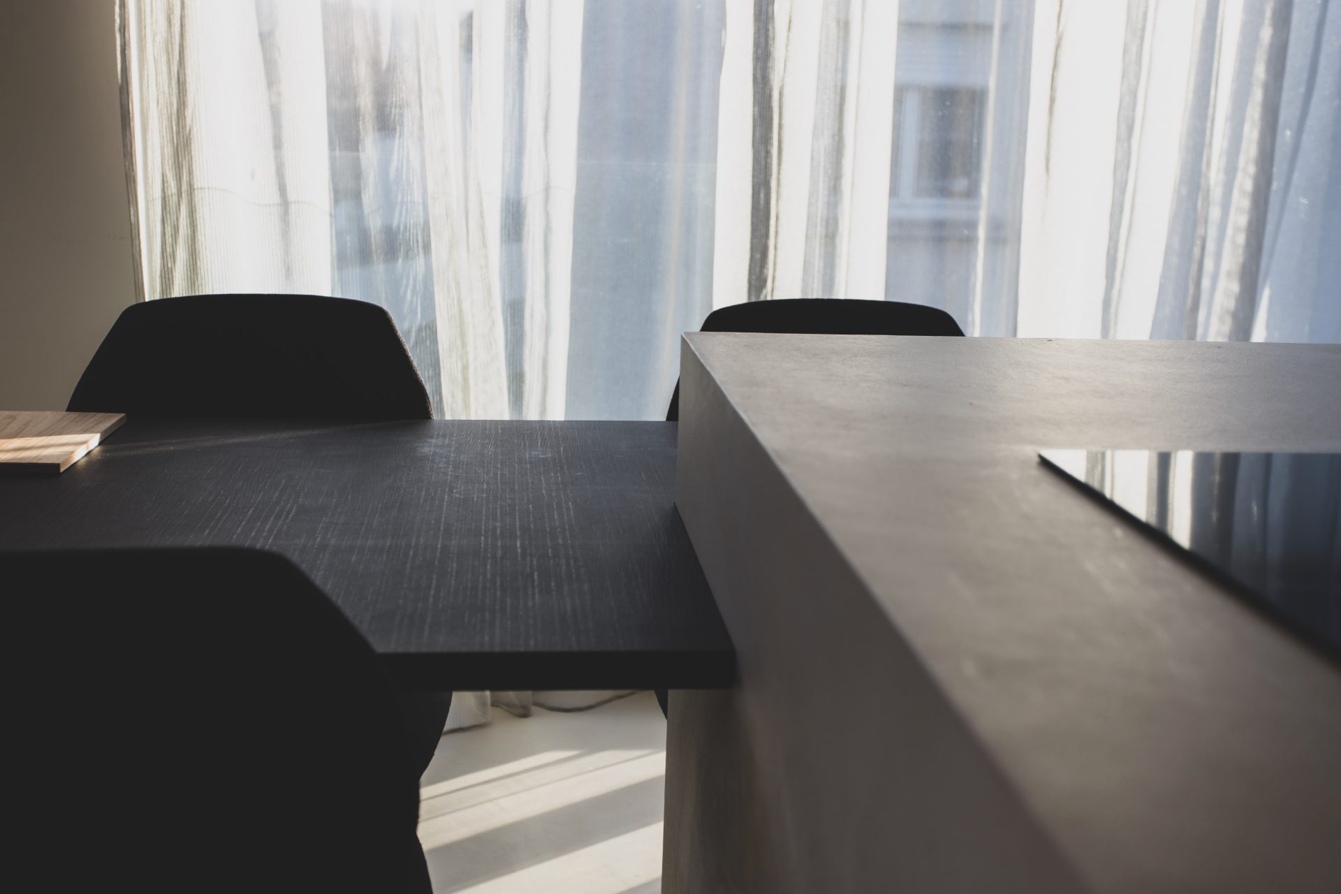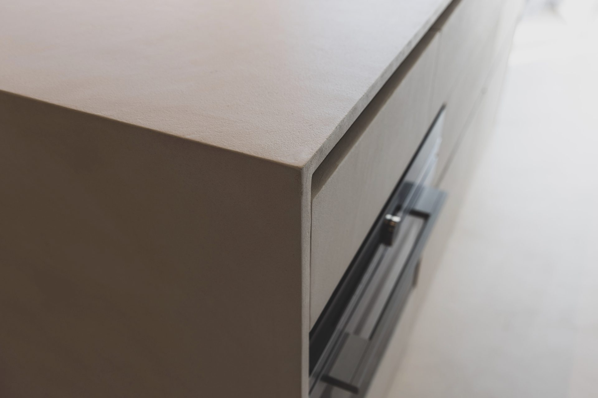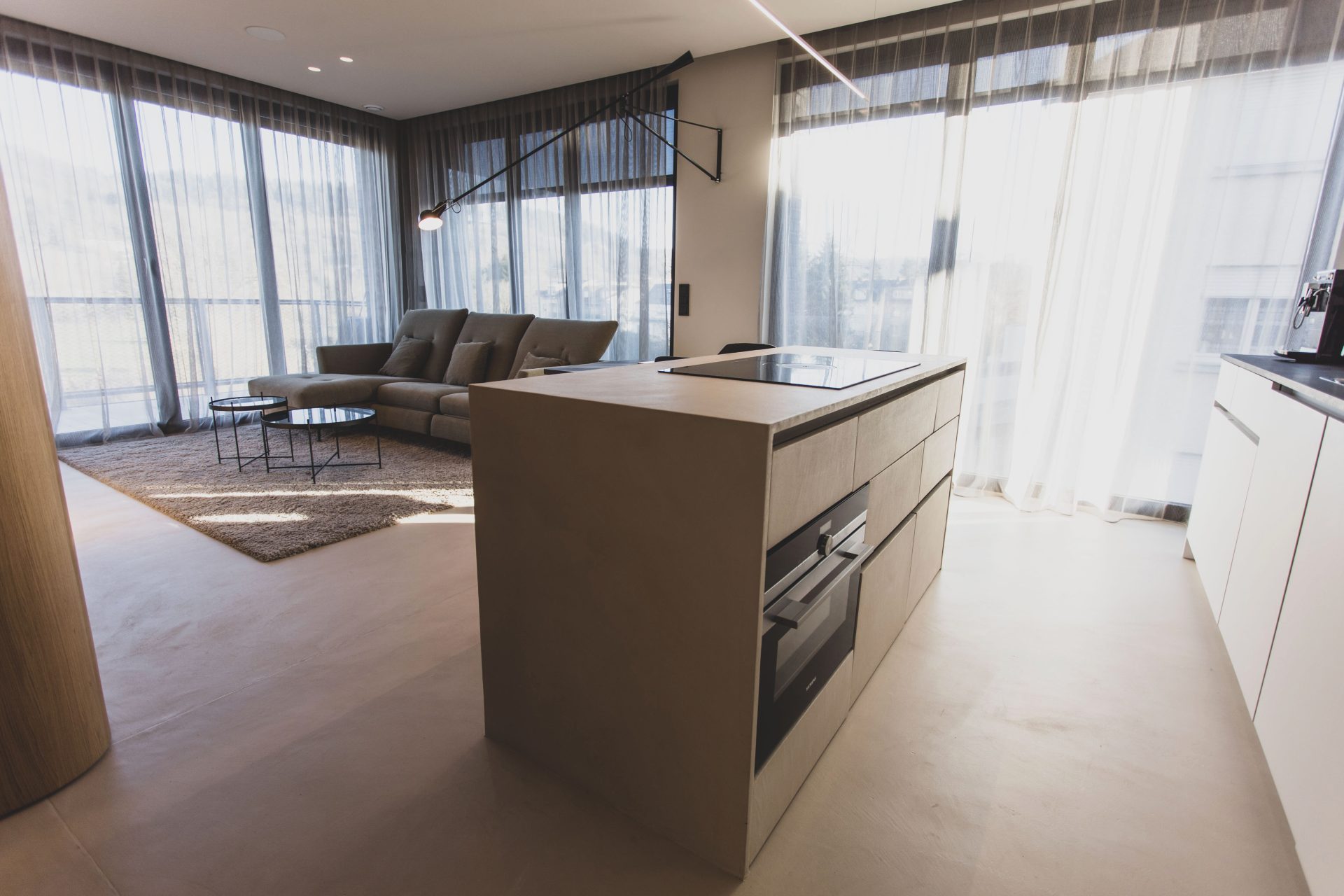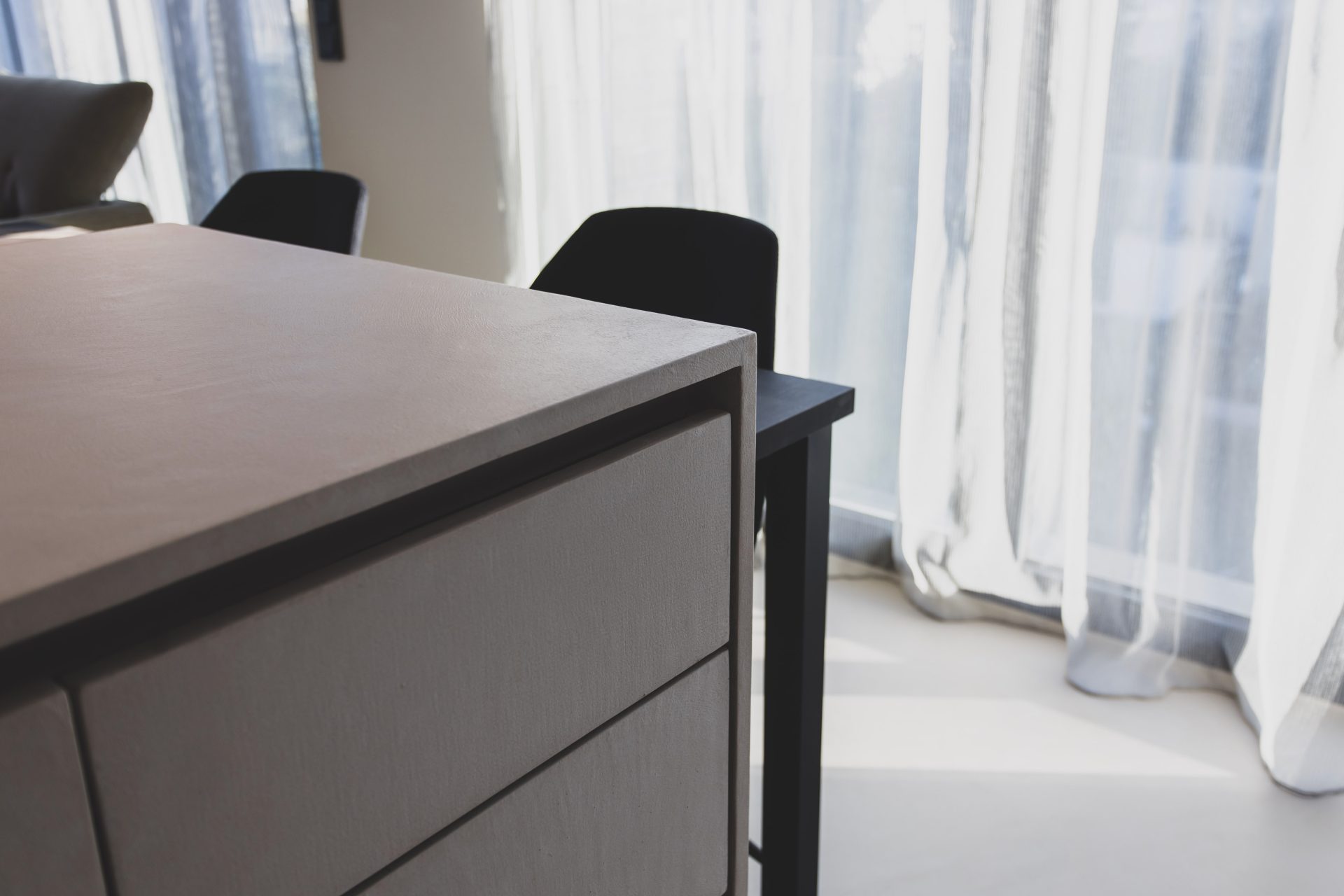 Le sol et l’ilot cuisine sont habillés d’un mortex beige, apportant de la douceur et une certaine zénitude.