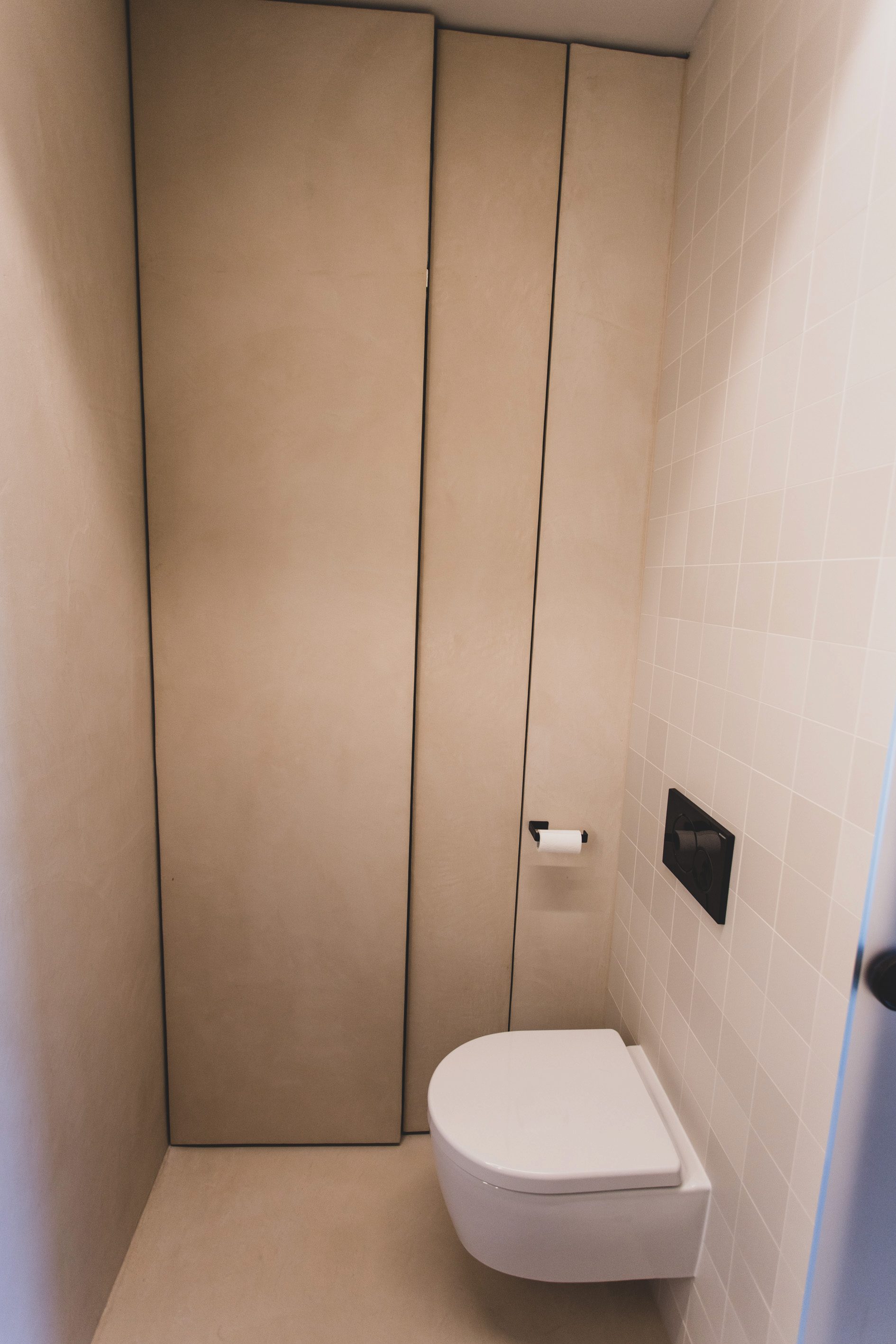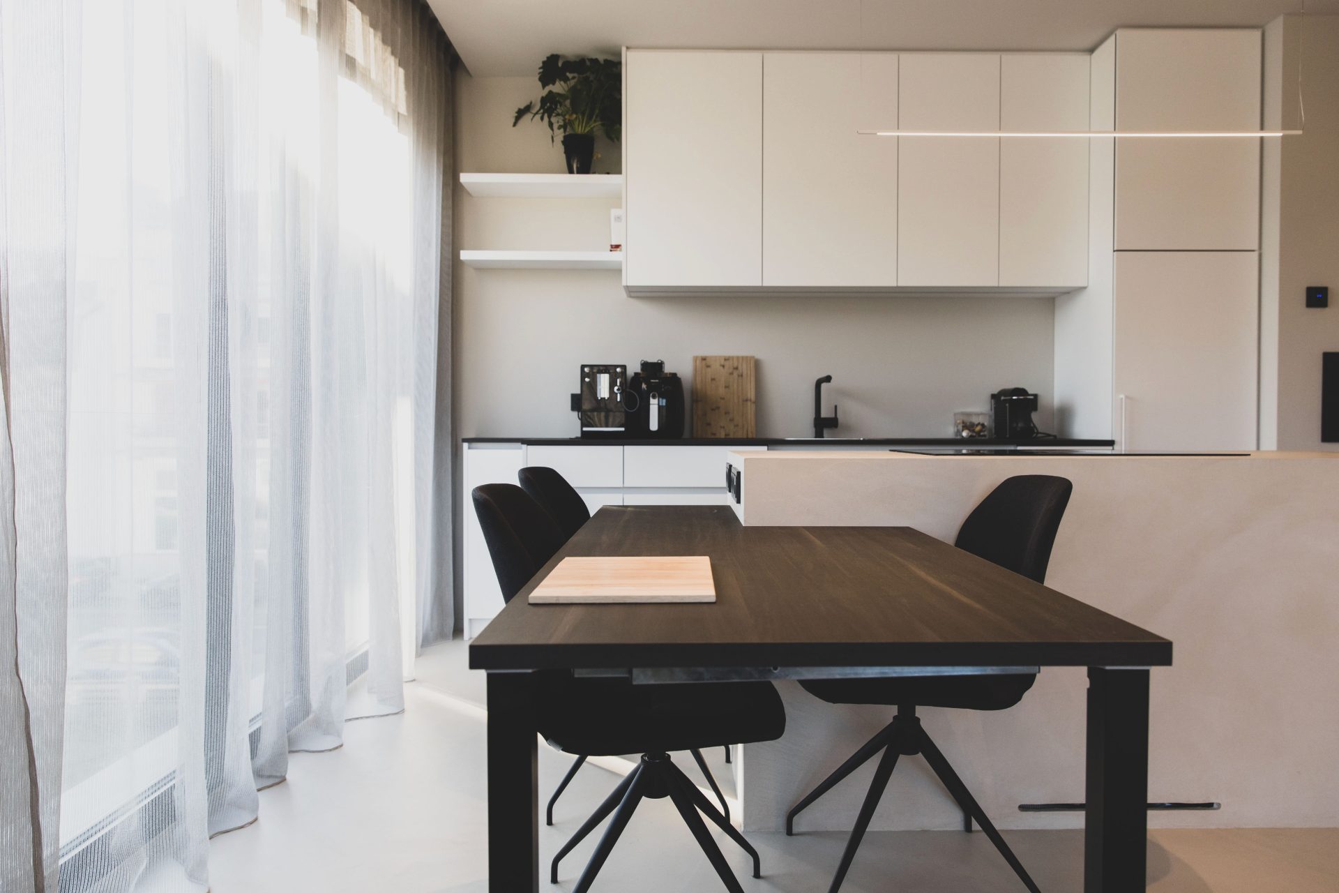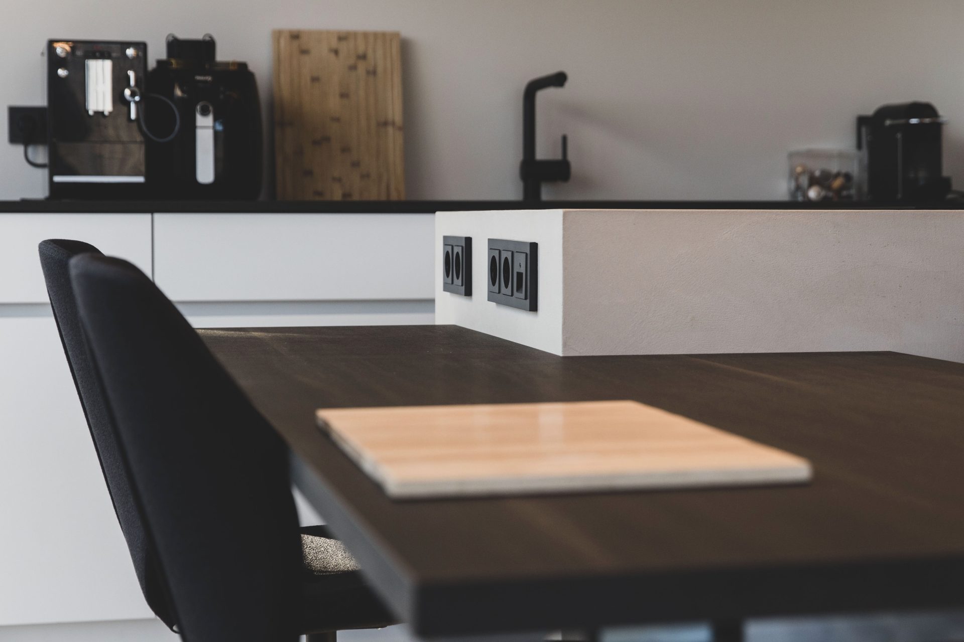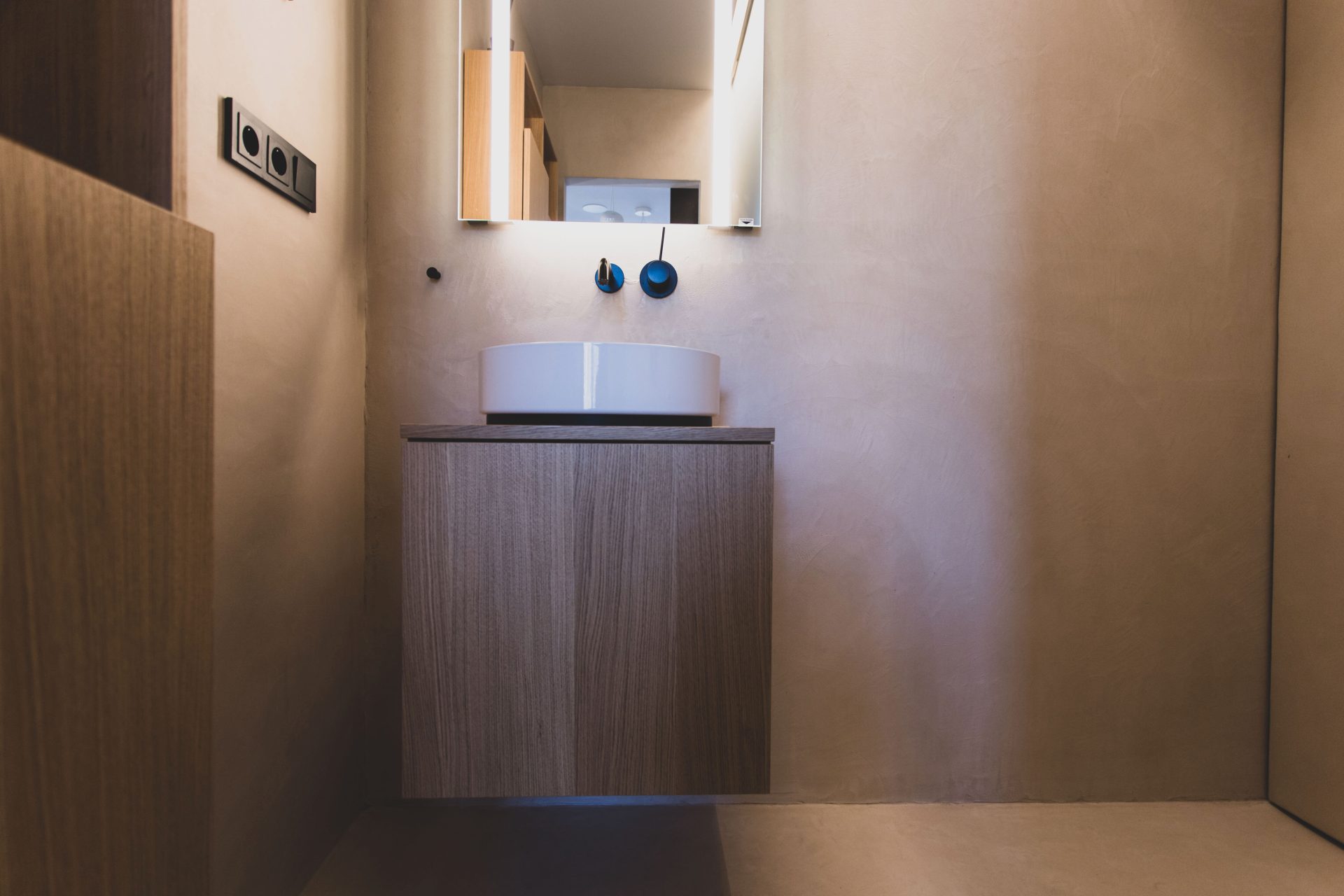 Le sol et l’ilot cuisine sont habillés d’un mortex beige, apportant de la douceur et une certaine zénitude.