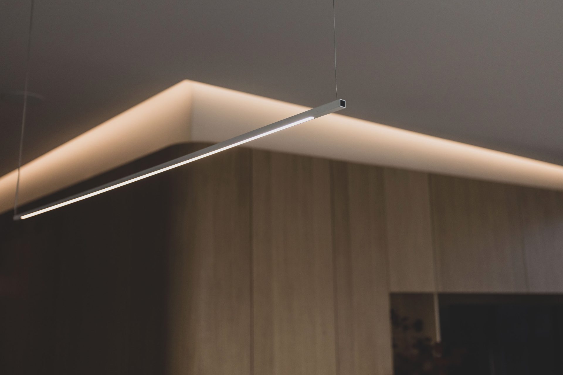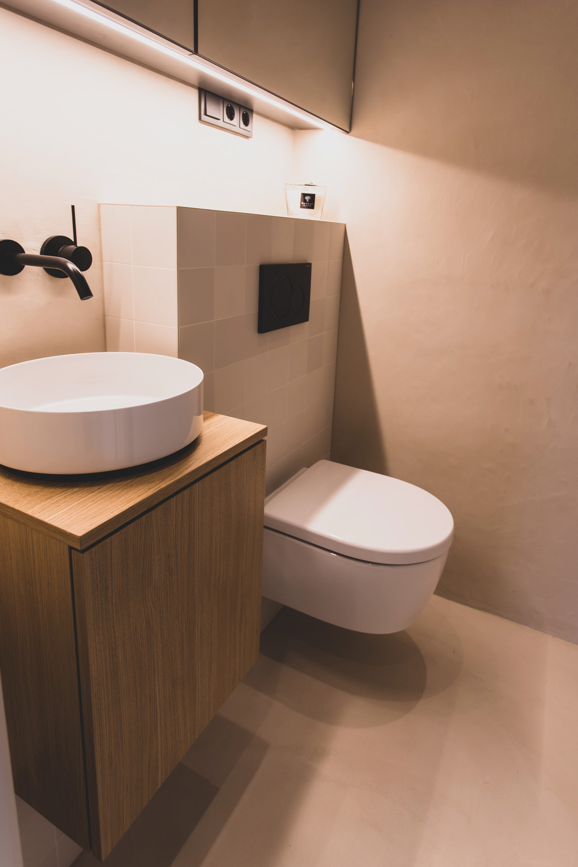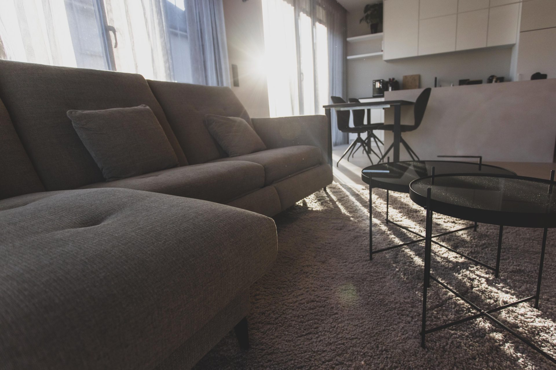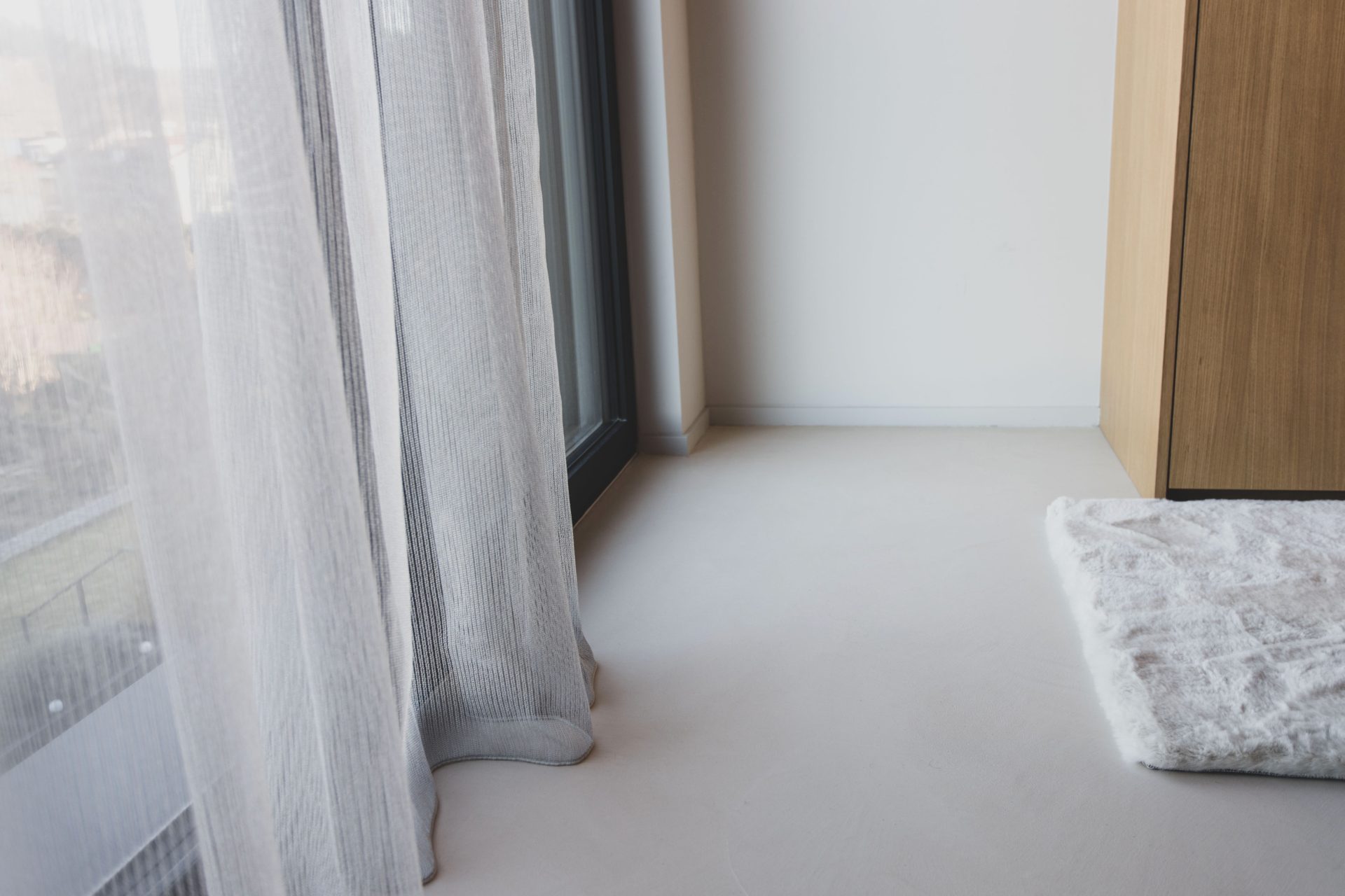 Le sol et l’ilot cuisine sont habillés d’un mortex beige, apportant de la douceur et une certaine zénitude.