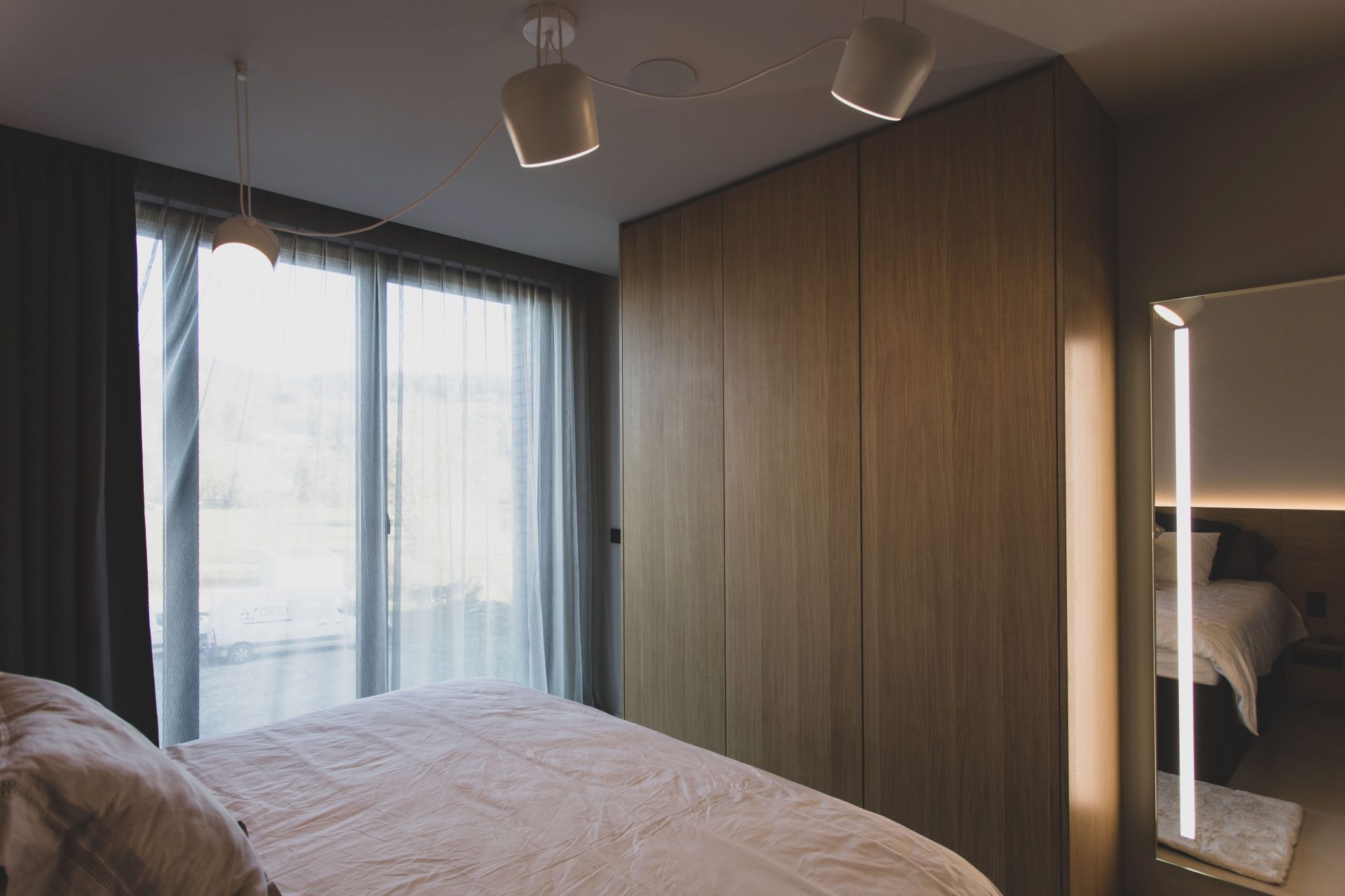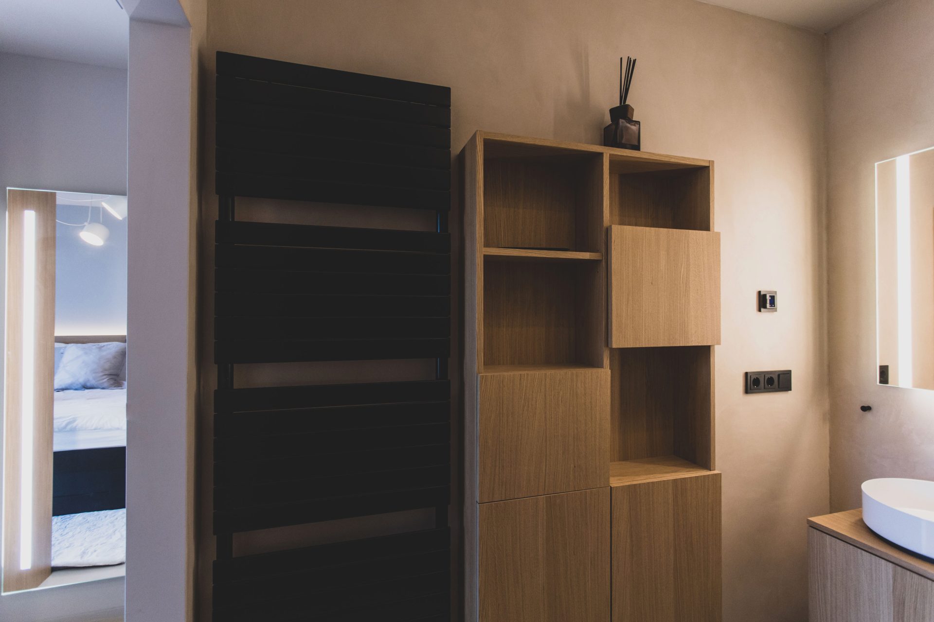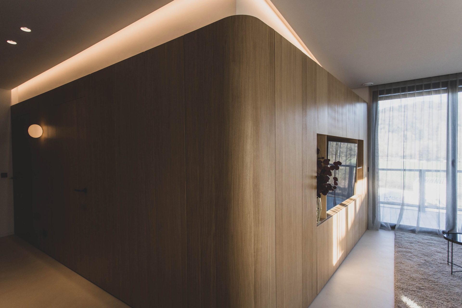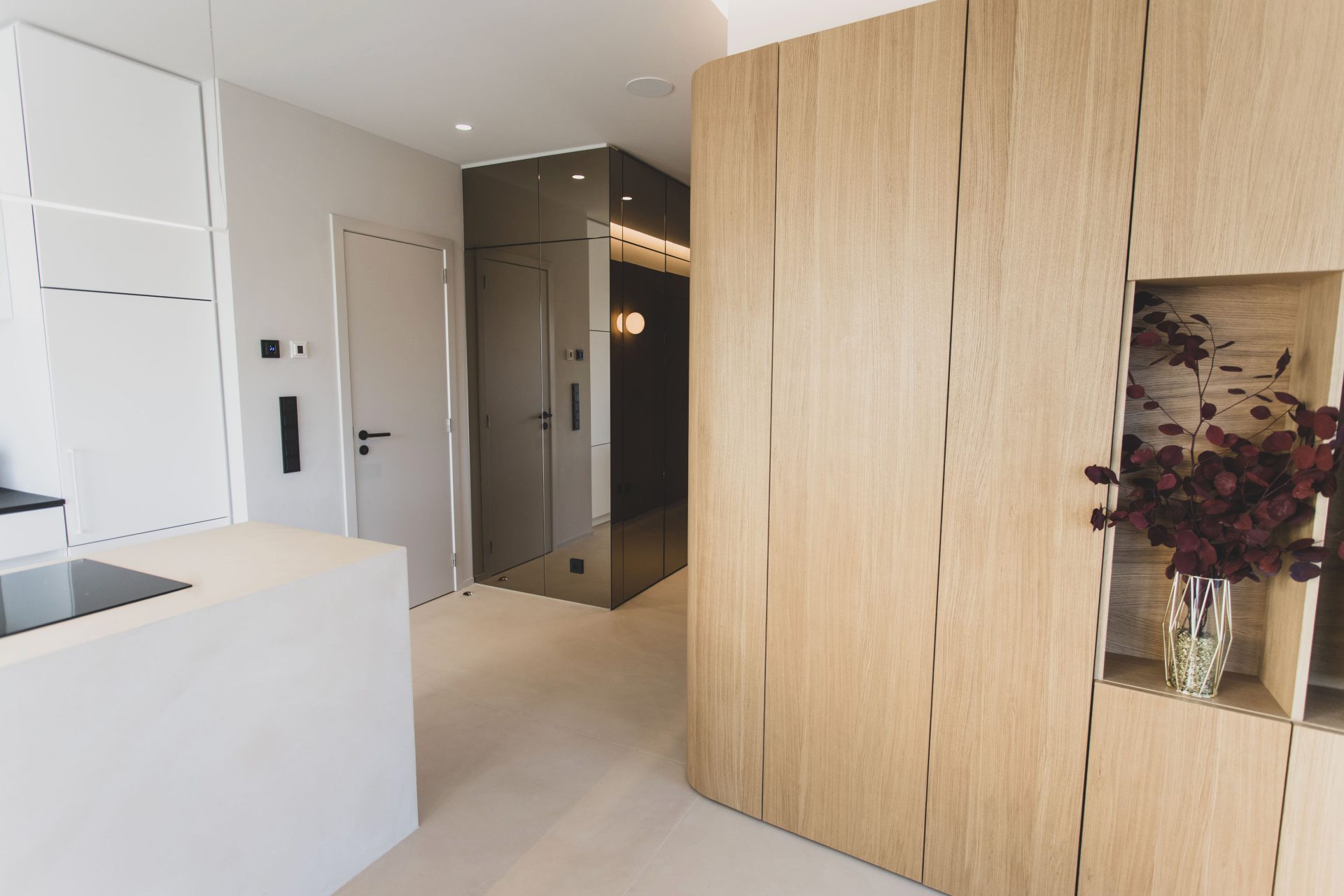 Une cuisine ouverte avec ilot, une espace living sobre avec des rangements intégrés sur tout un pan de mur, deux chambres doubles et deux salles de bains composent l’aménagement