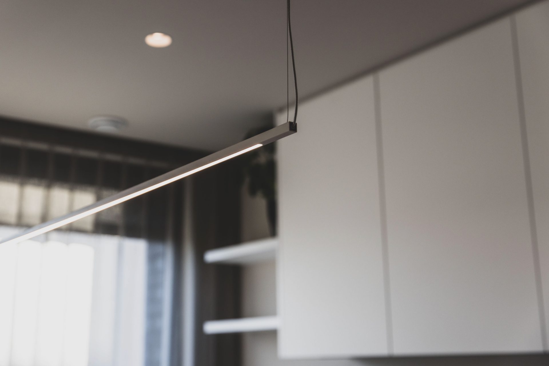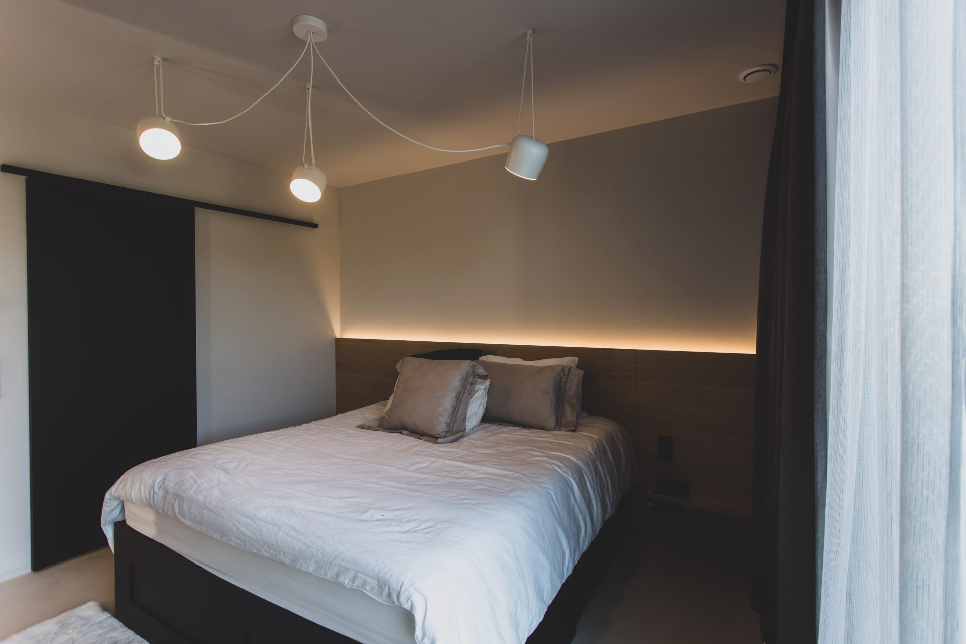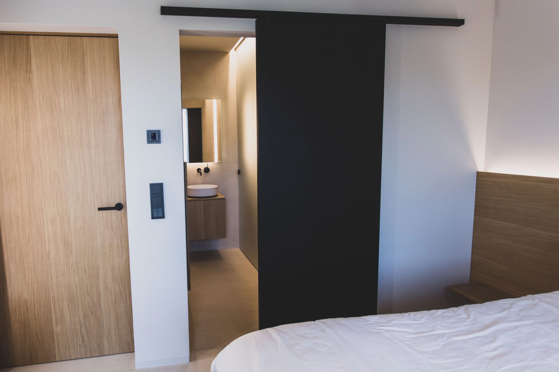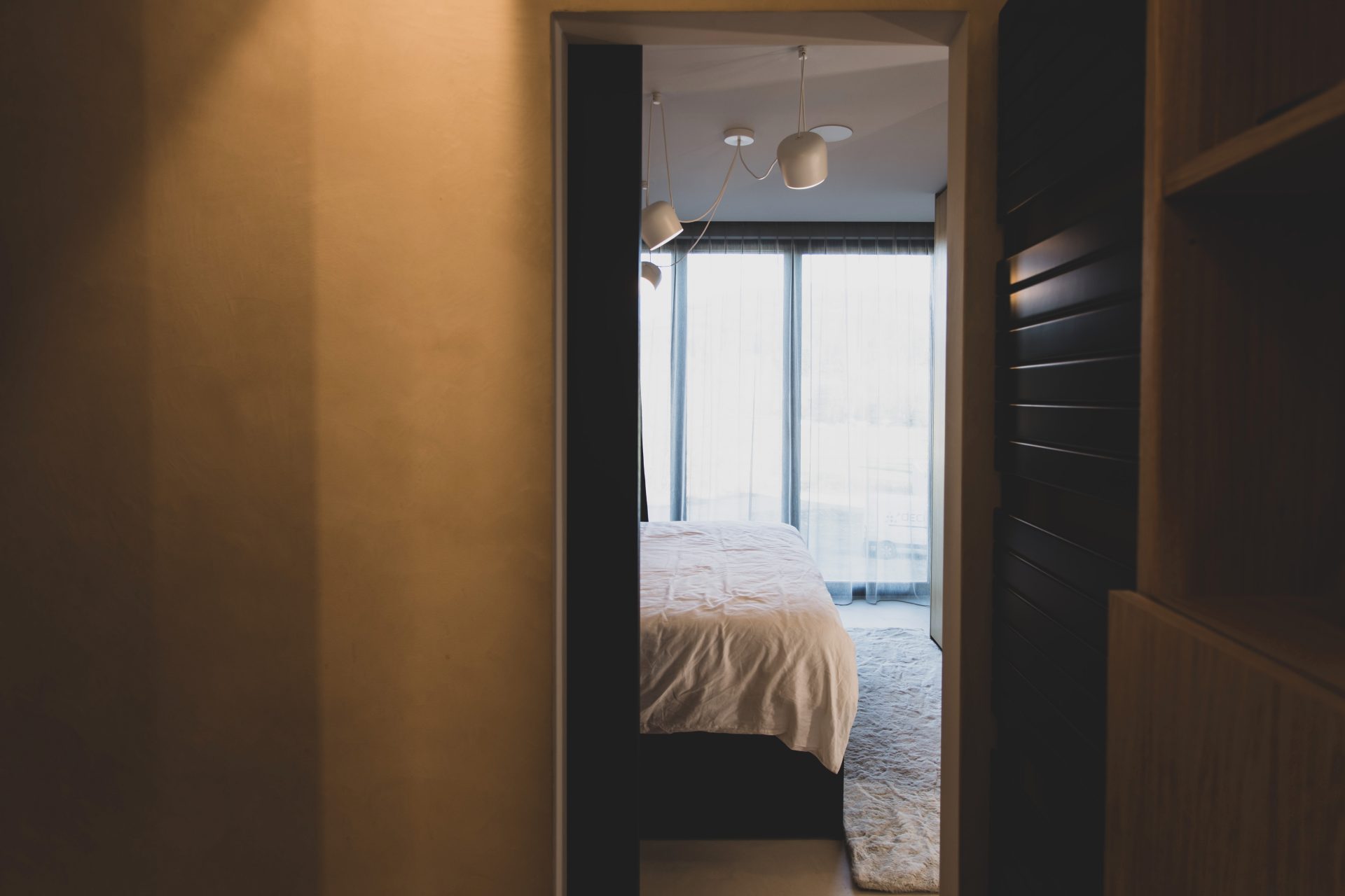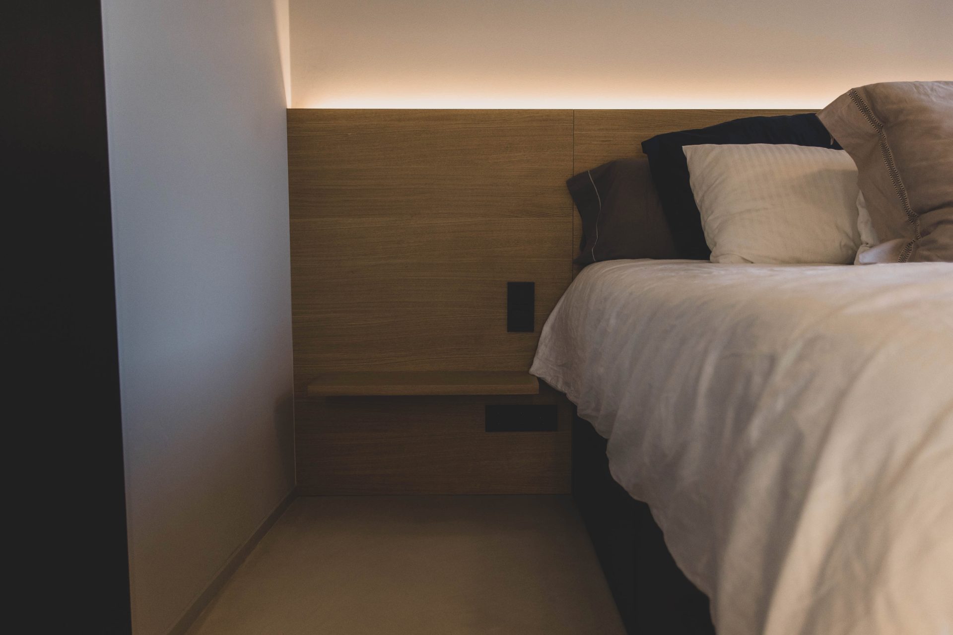 Une cuisine ouverte avec ilot, une espace living sobre avec des rangements intégrés sur tout un pan de mur, deux chambres doubles et deux salles de bains composent l’aménagement