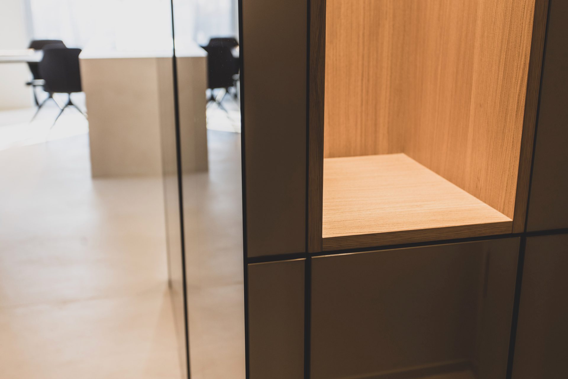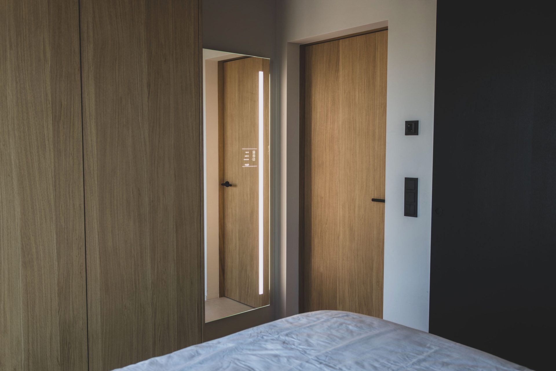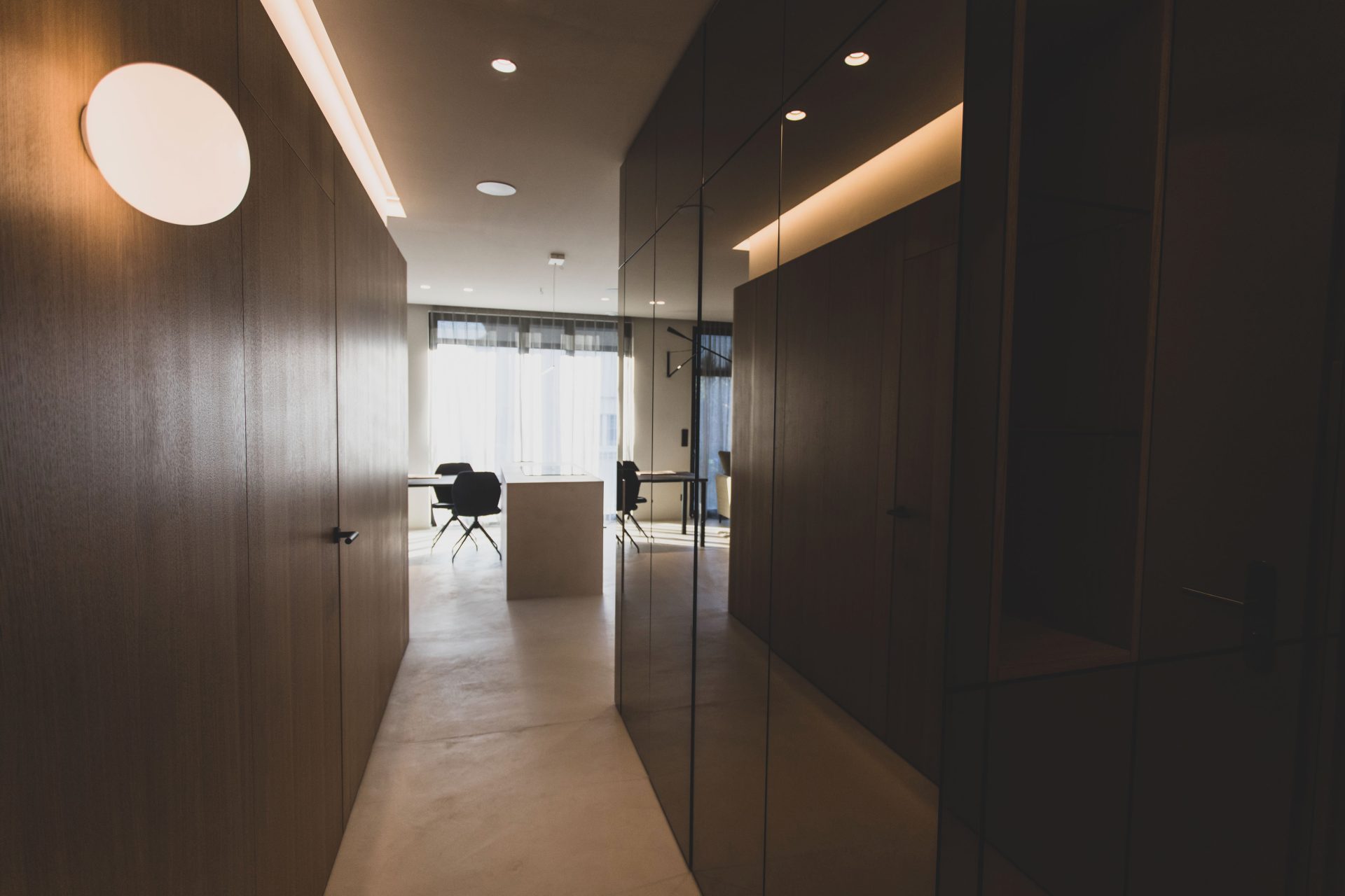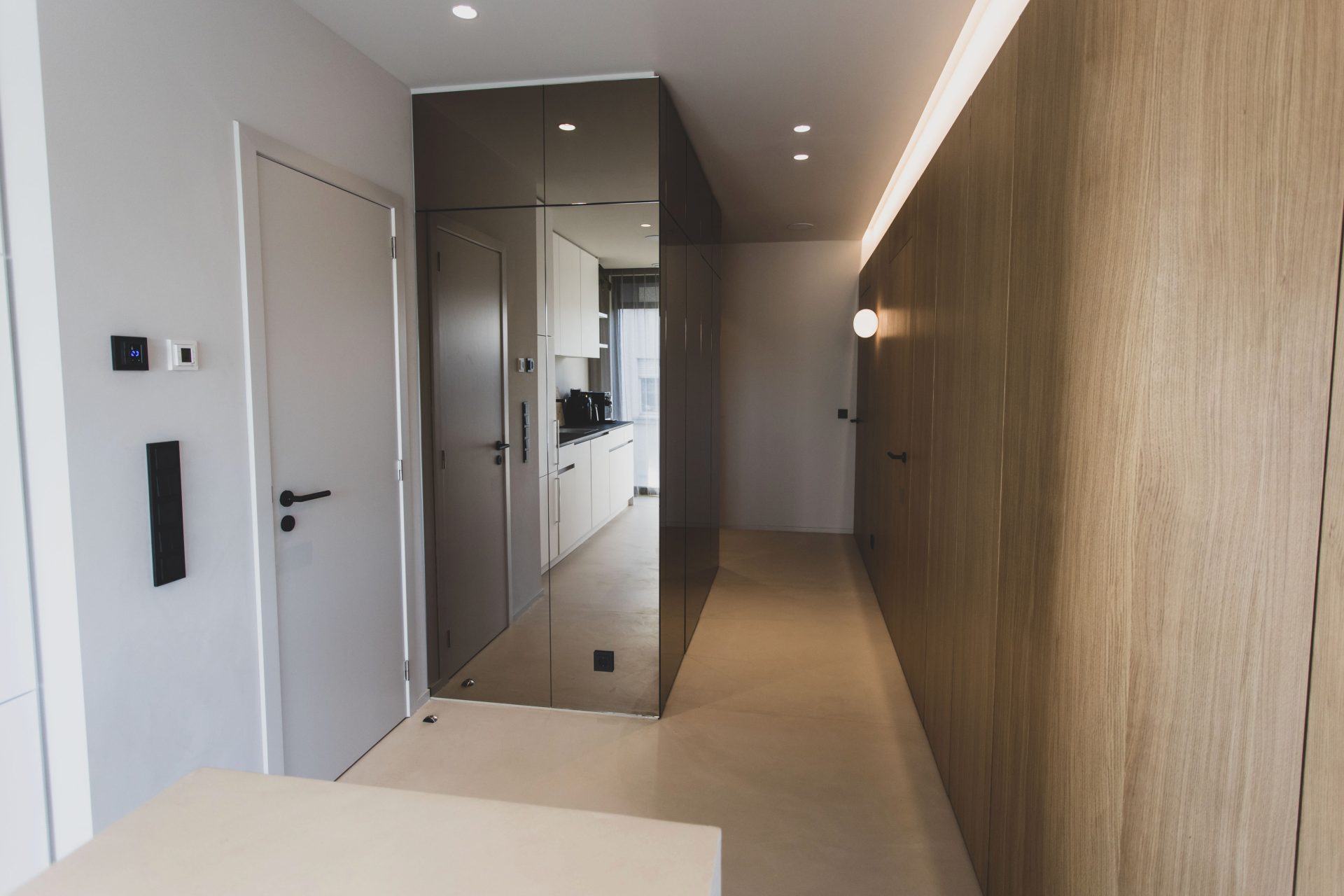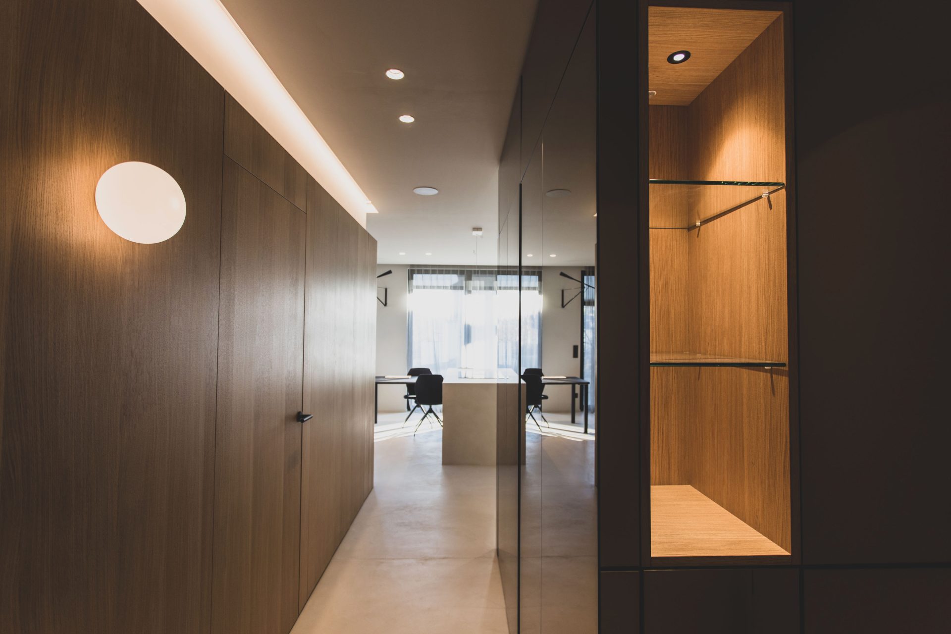 Dès l’entrée, un grand vestiaire — habillé de miroirs fumés — crée de belles perspectives.