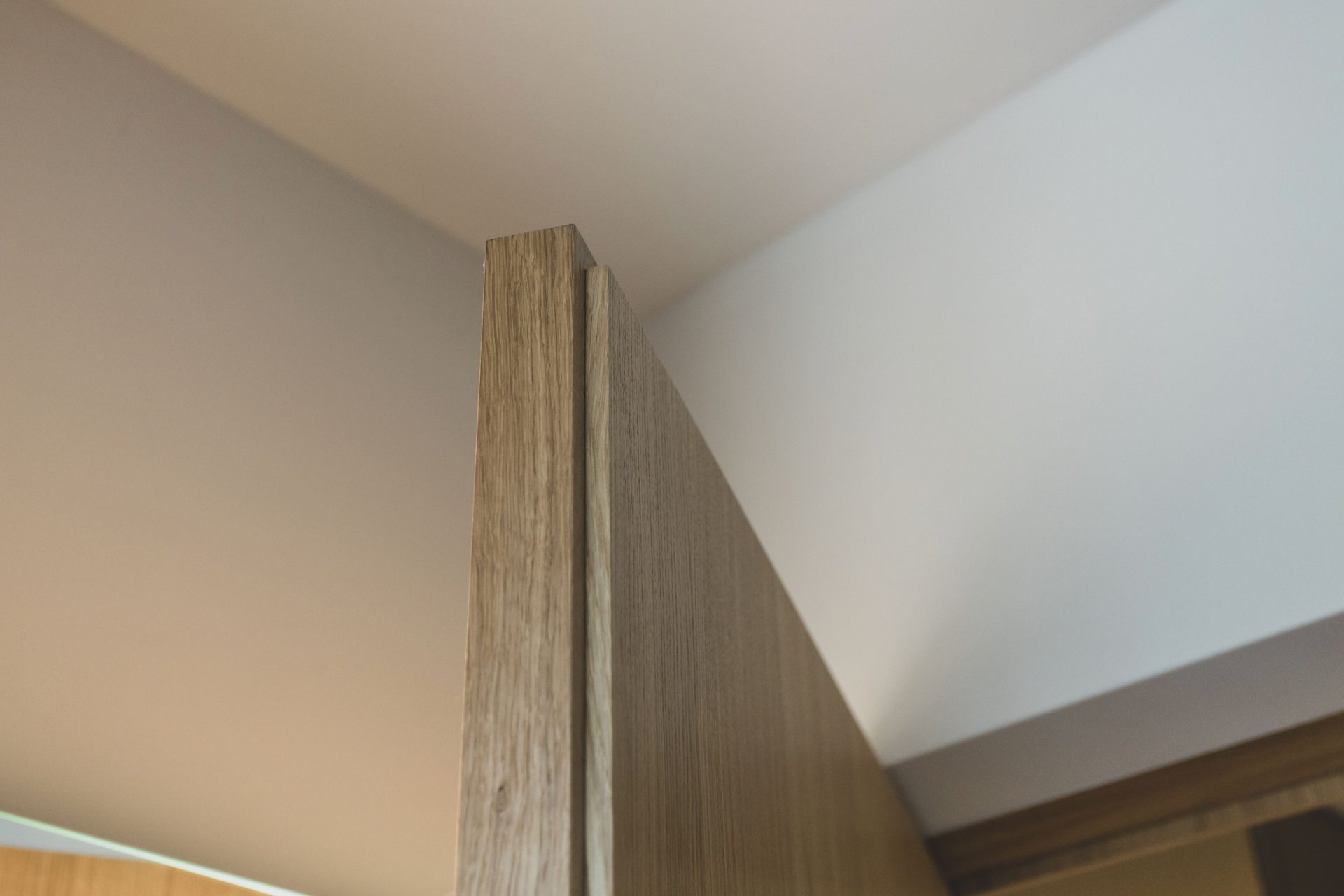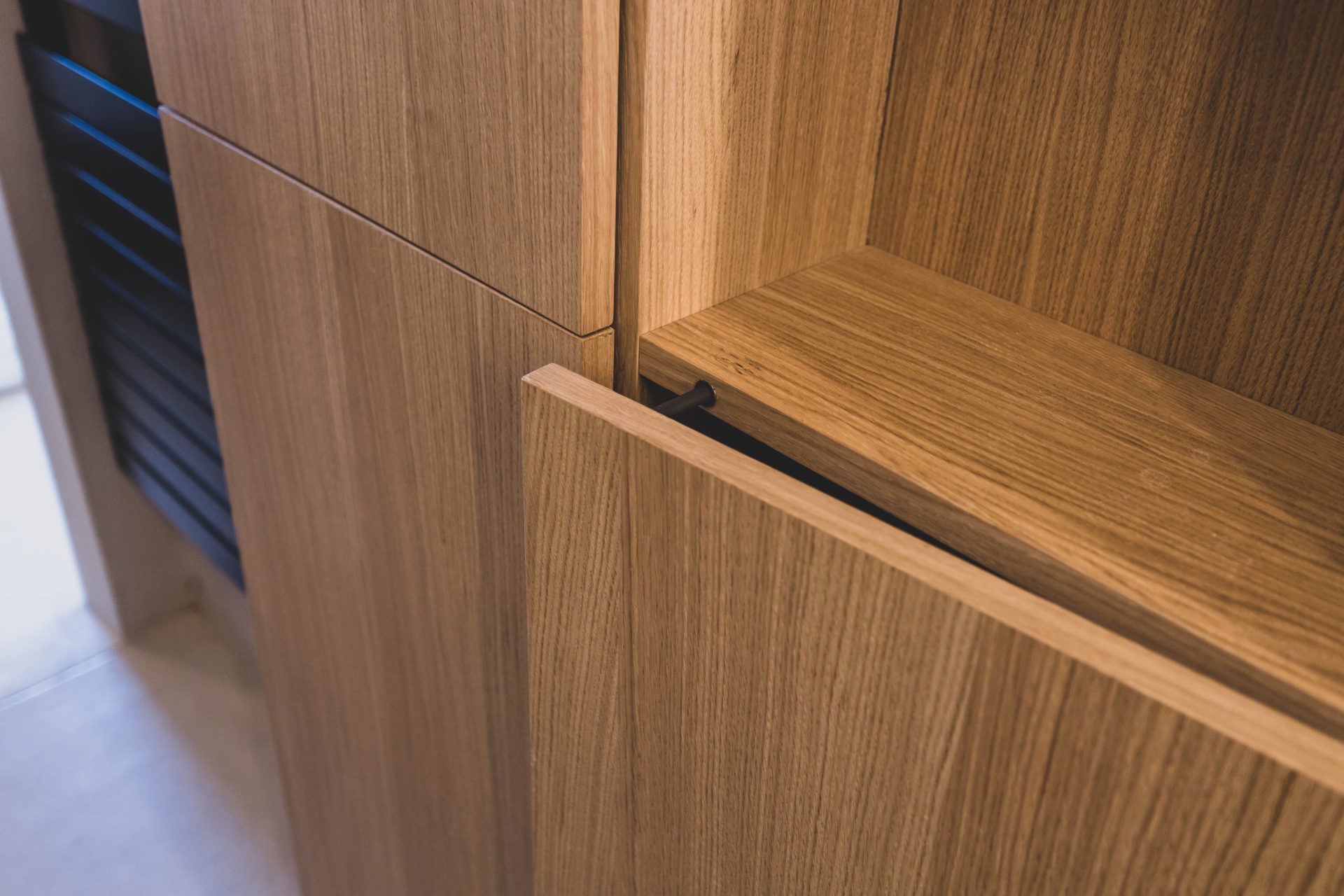L’ensemble du mobilier (en chêne clair et en stratifié blanc et ébène) a été réalisé sur mesure.