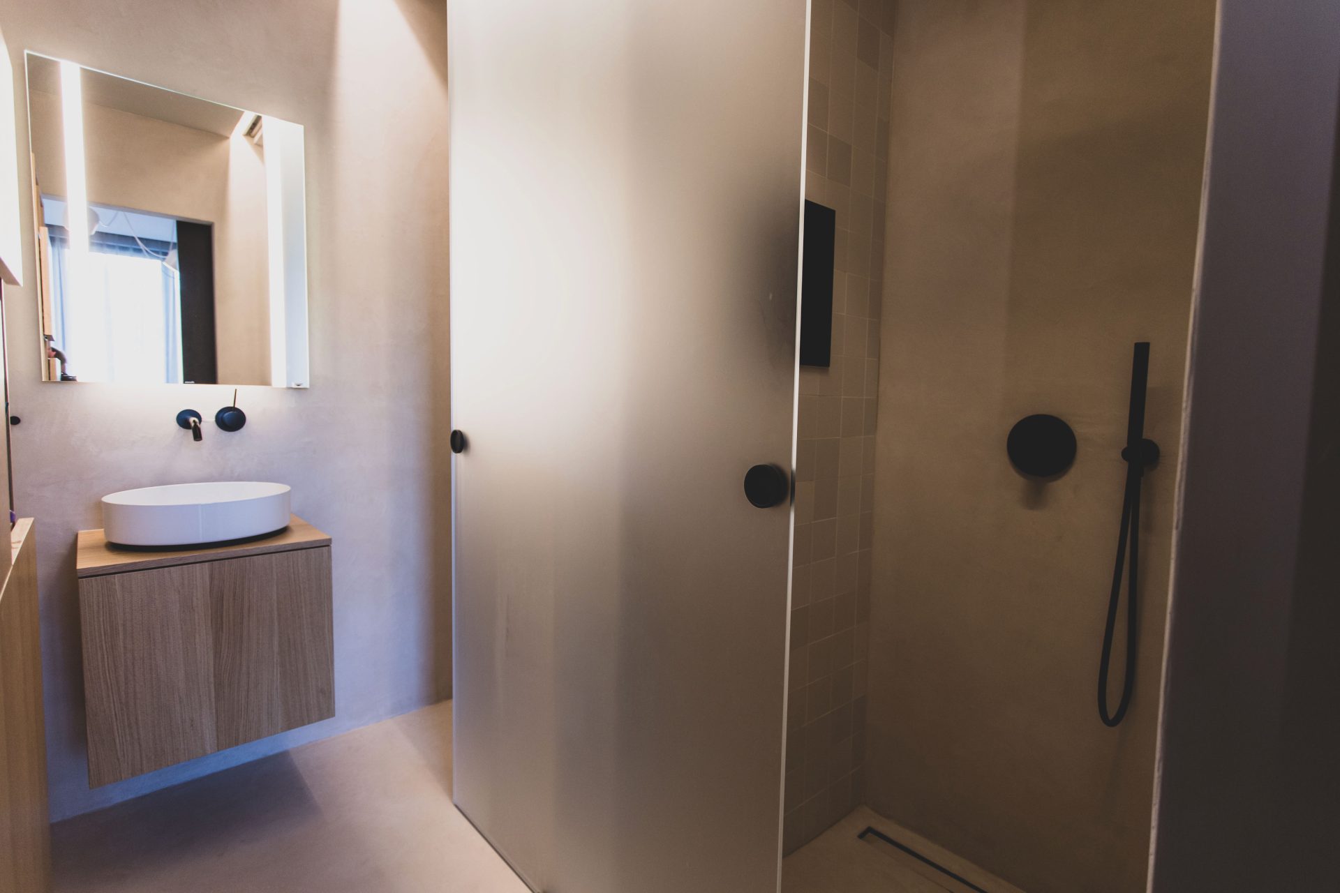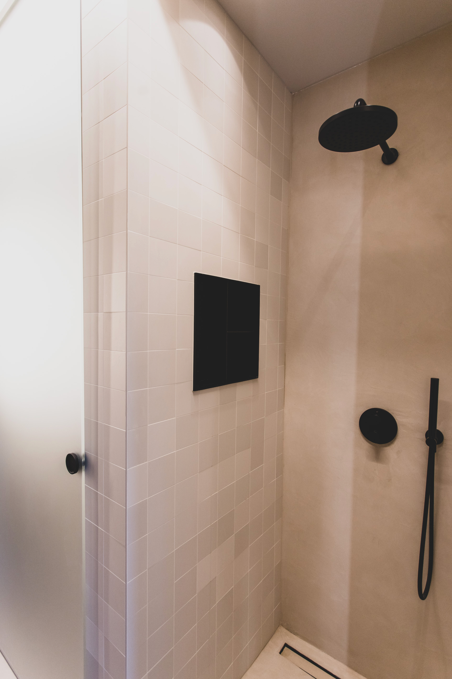 A souligner : les douches habillées de mortex et de carrelage Mews de La Mutina, format 11 x 11 cm.