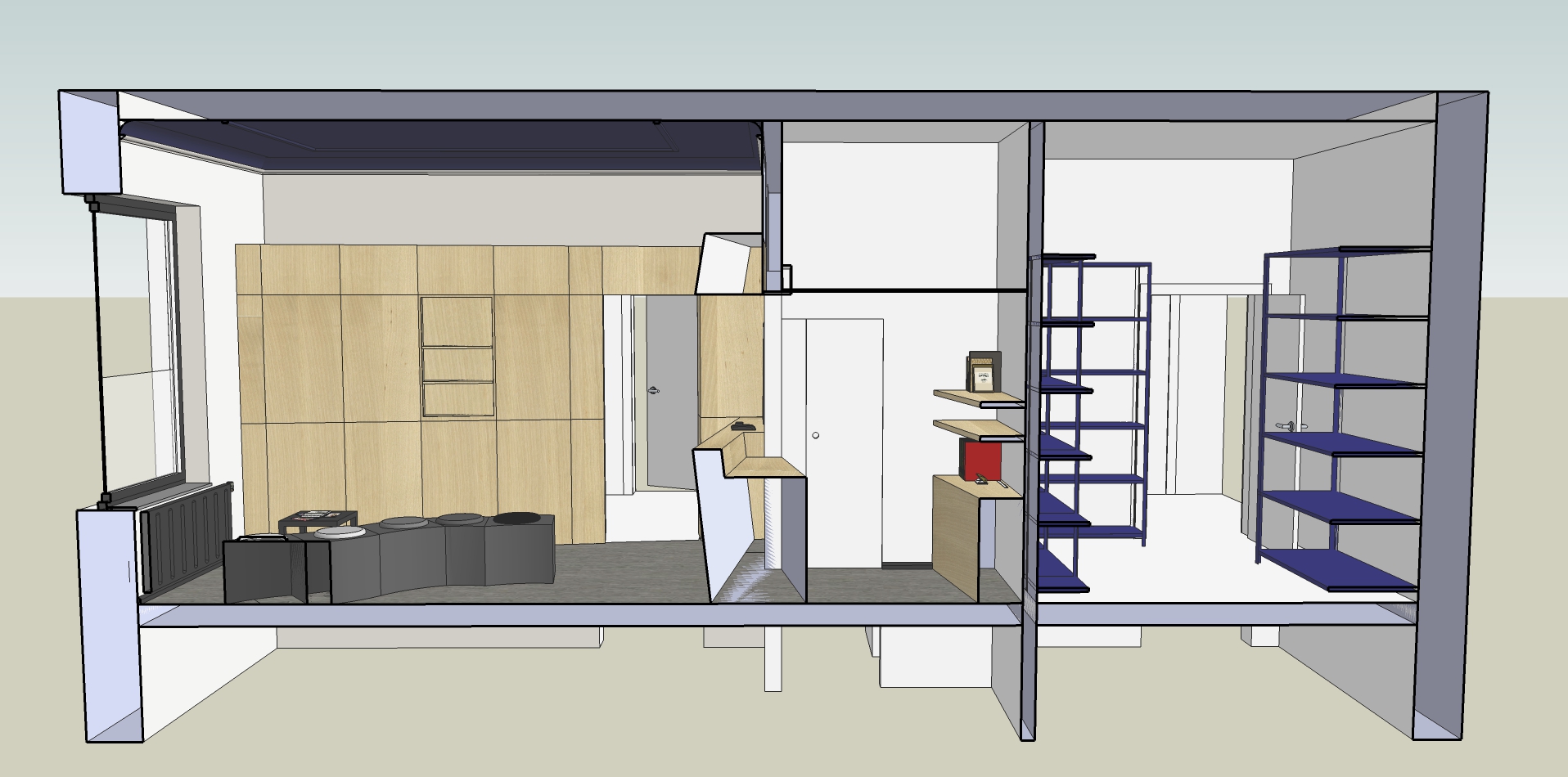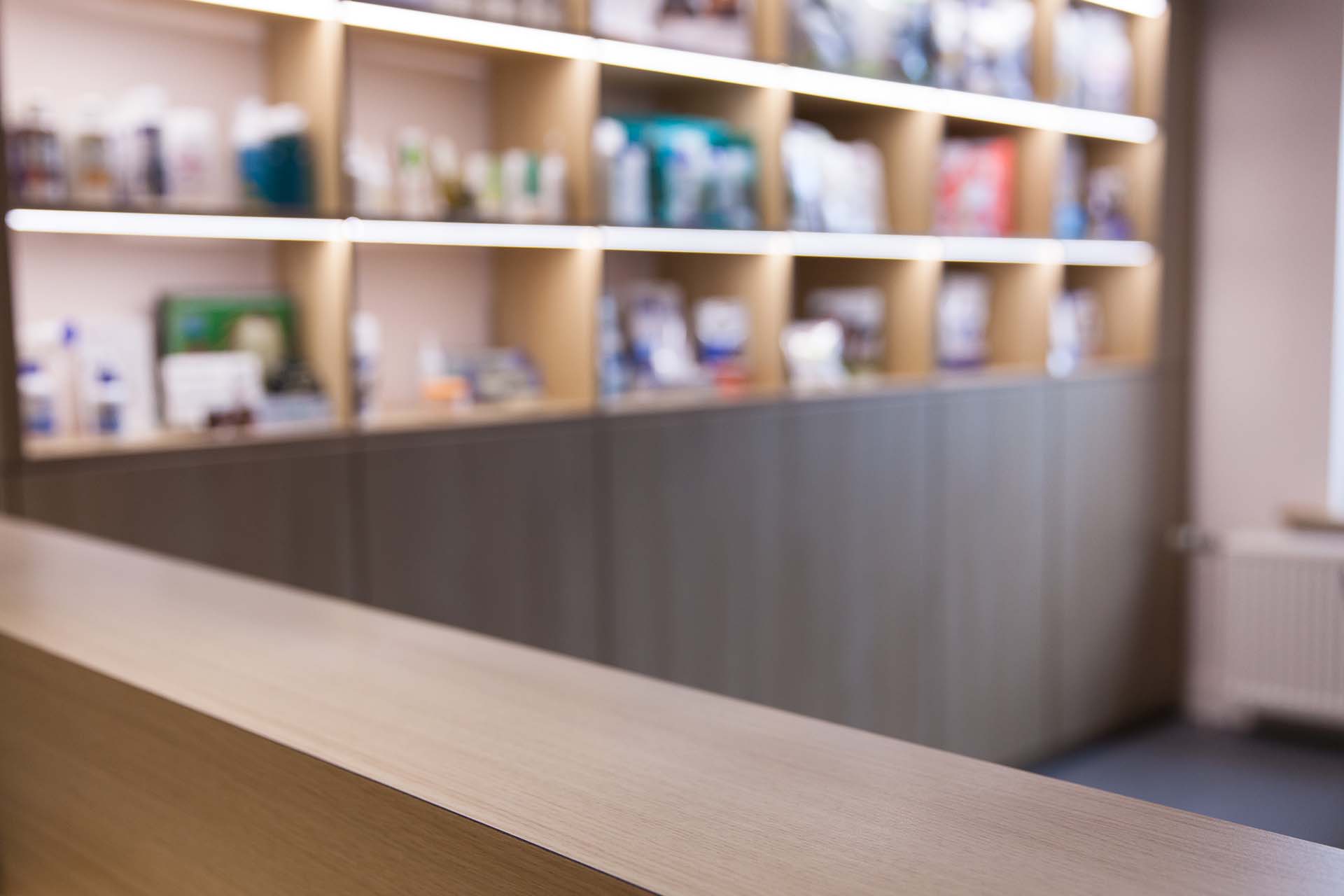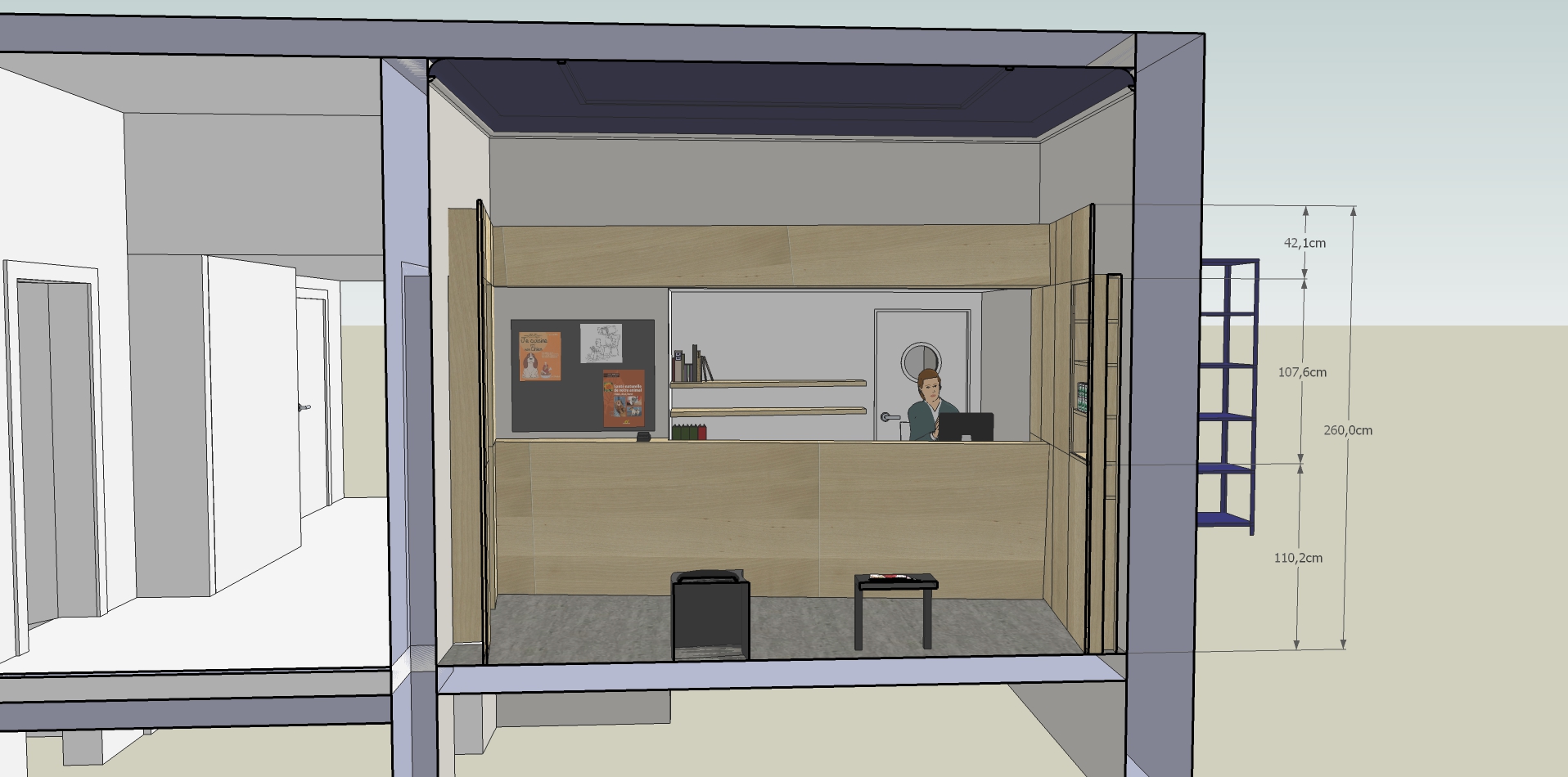 Nous avons également aménagé dans le prolongement de ce desk, un mobilier de présentation et de rangement, pratique et efficace.