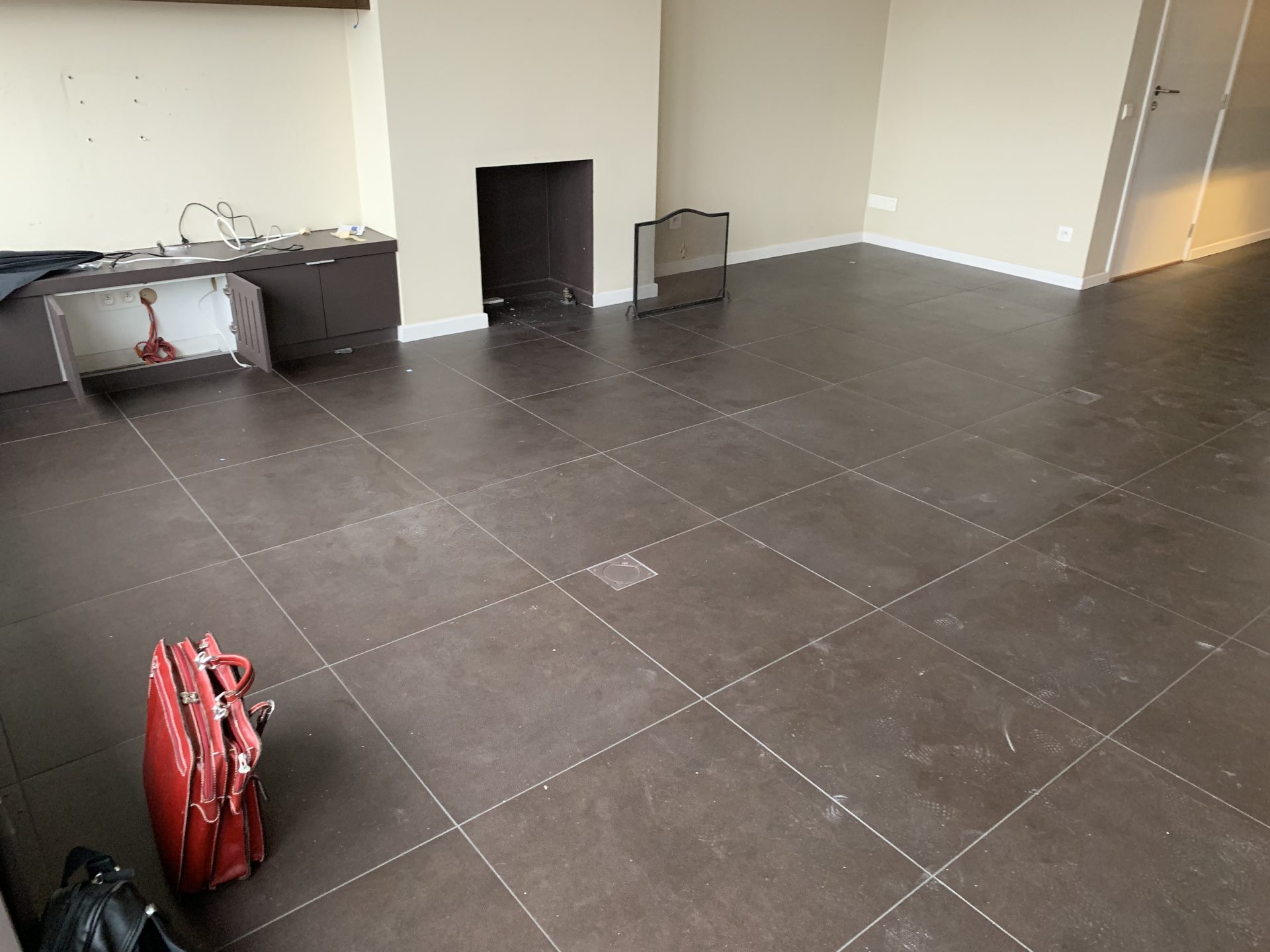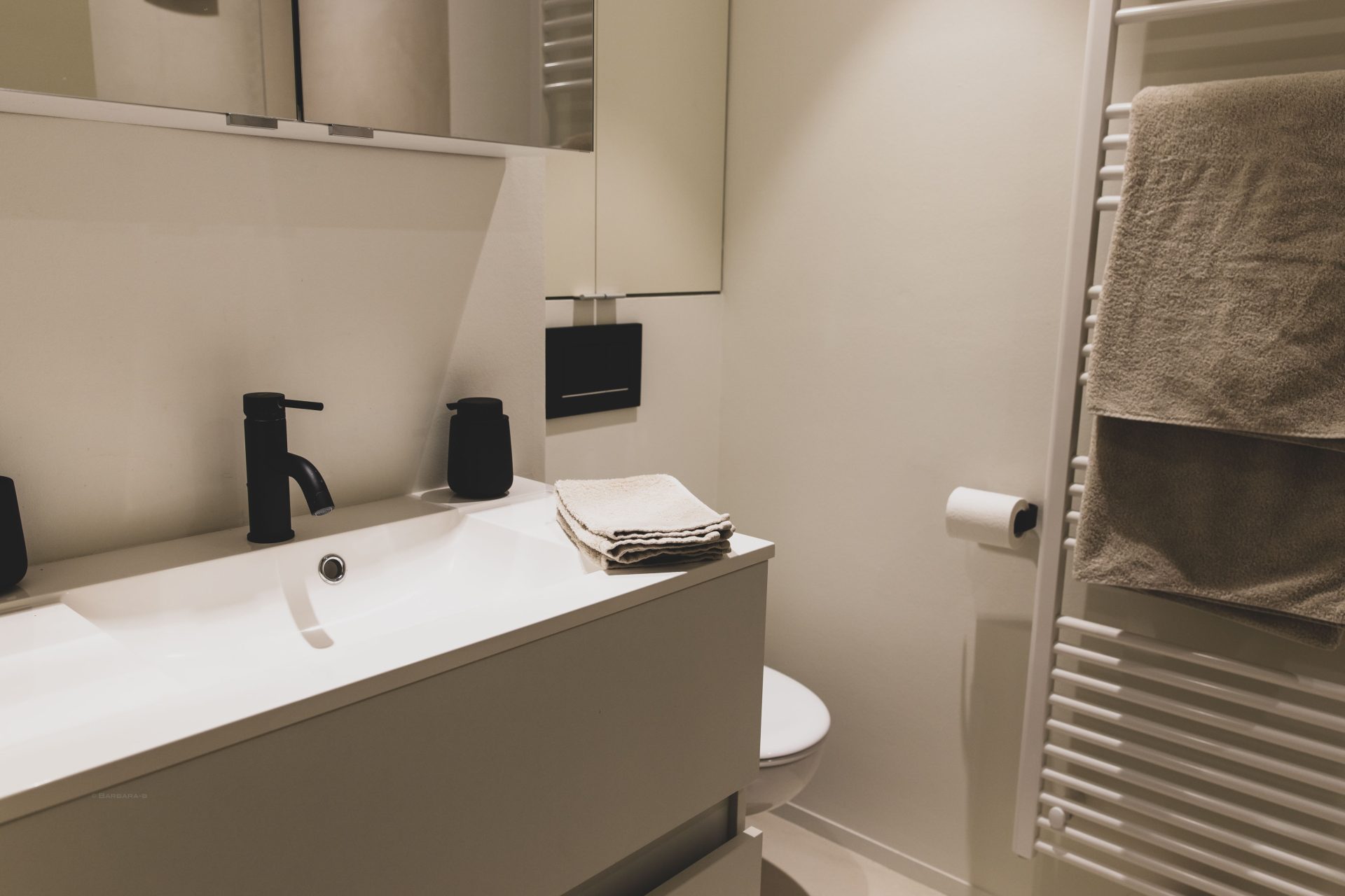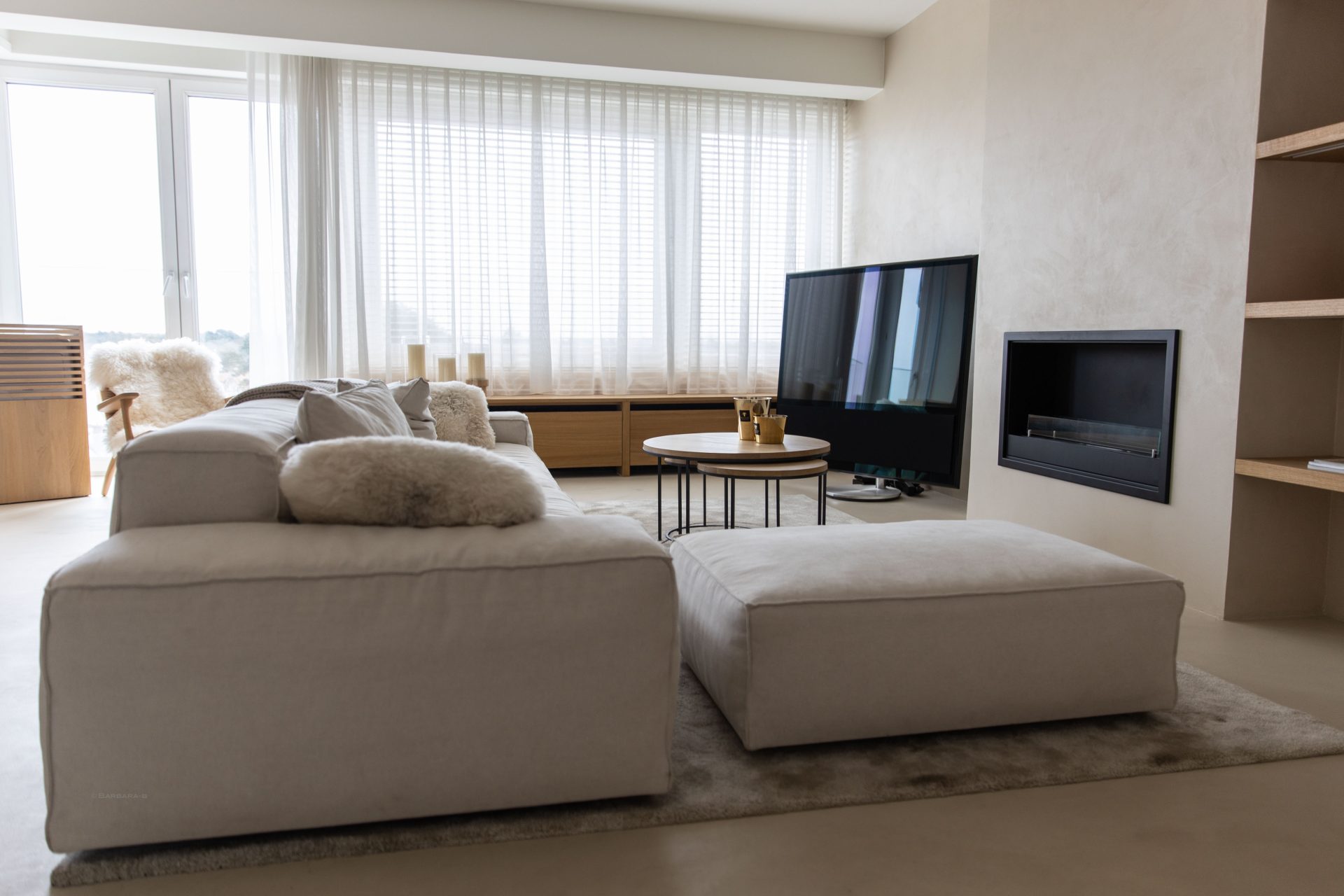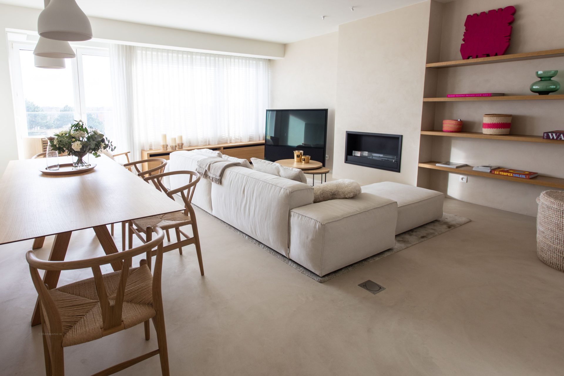 Le revêtement de sol de LiquidFloors© composé d’un enduit minéral y contribue particulièrement : le Socrete travaillé au sol sur les 93 m2 de l’appartement mais également posé sur un mur du living et dans les 2 salles de douche renforce ce sentiment de pureté, de simplicité et de délicatesse.