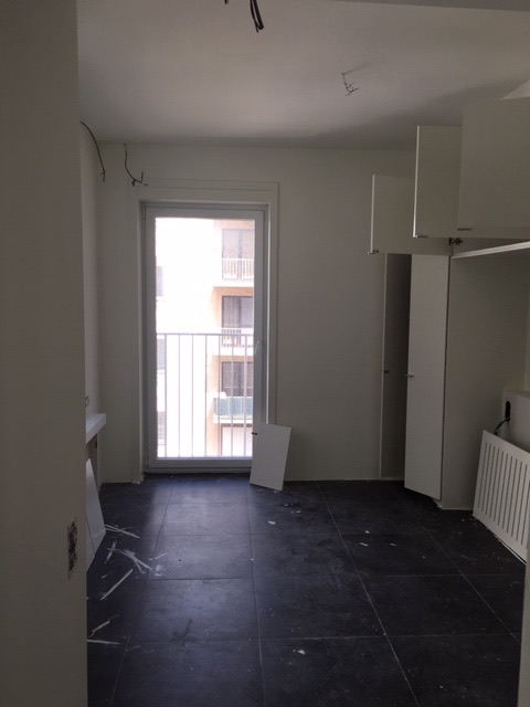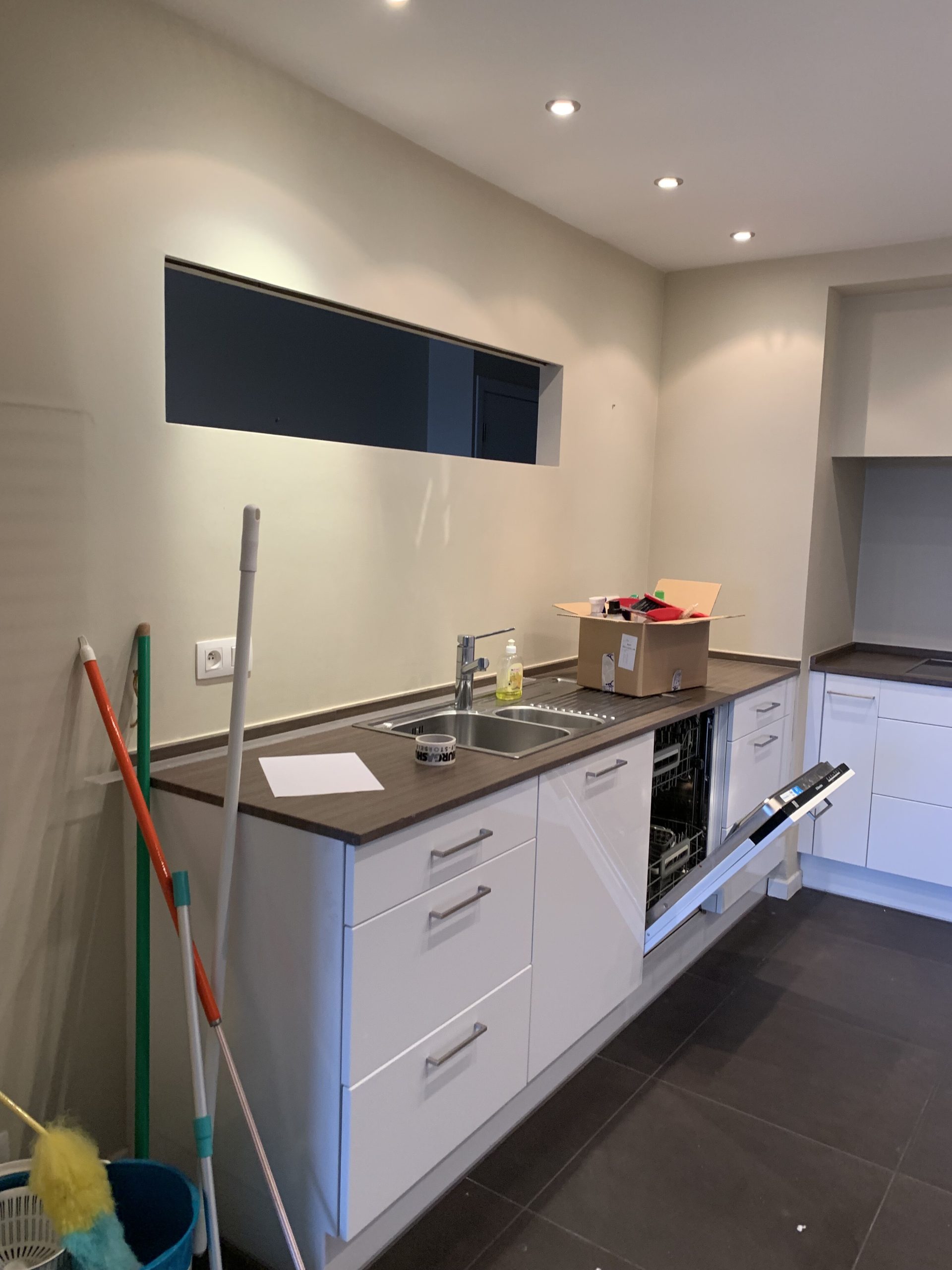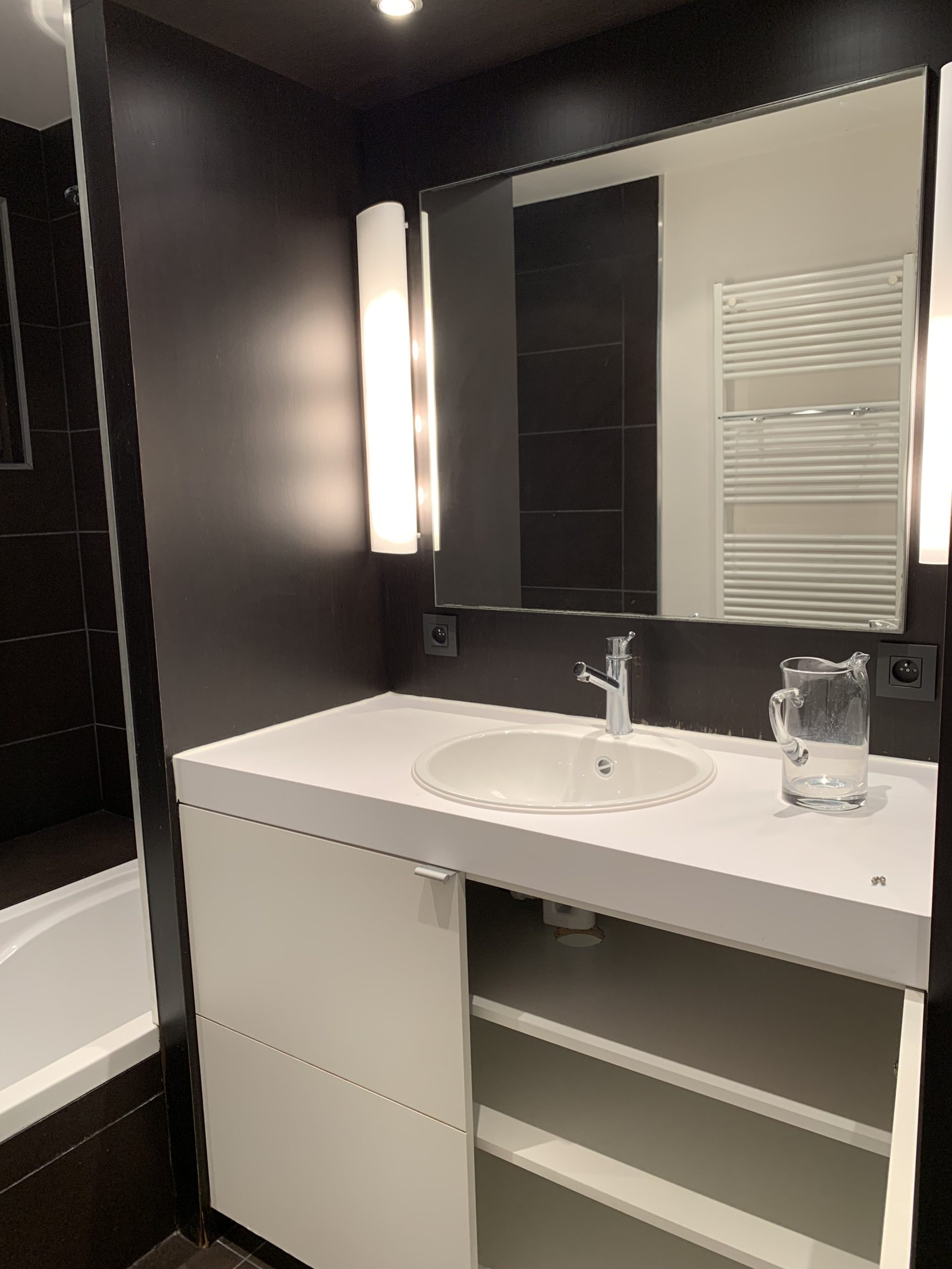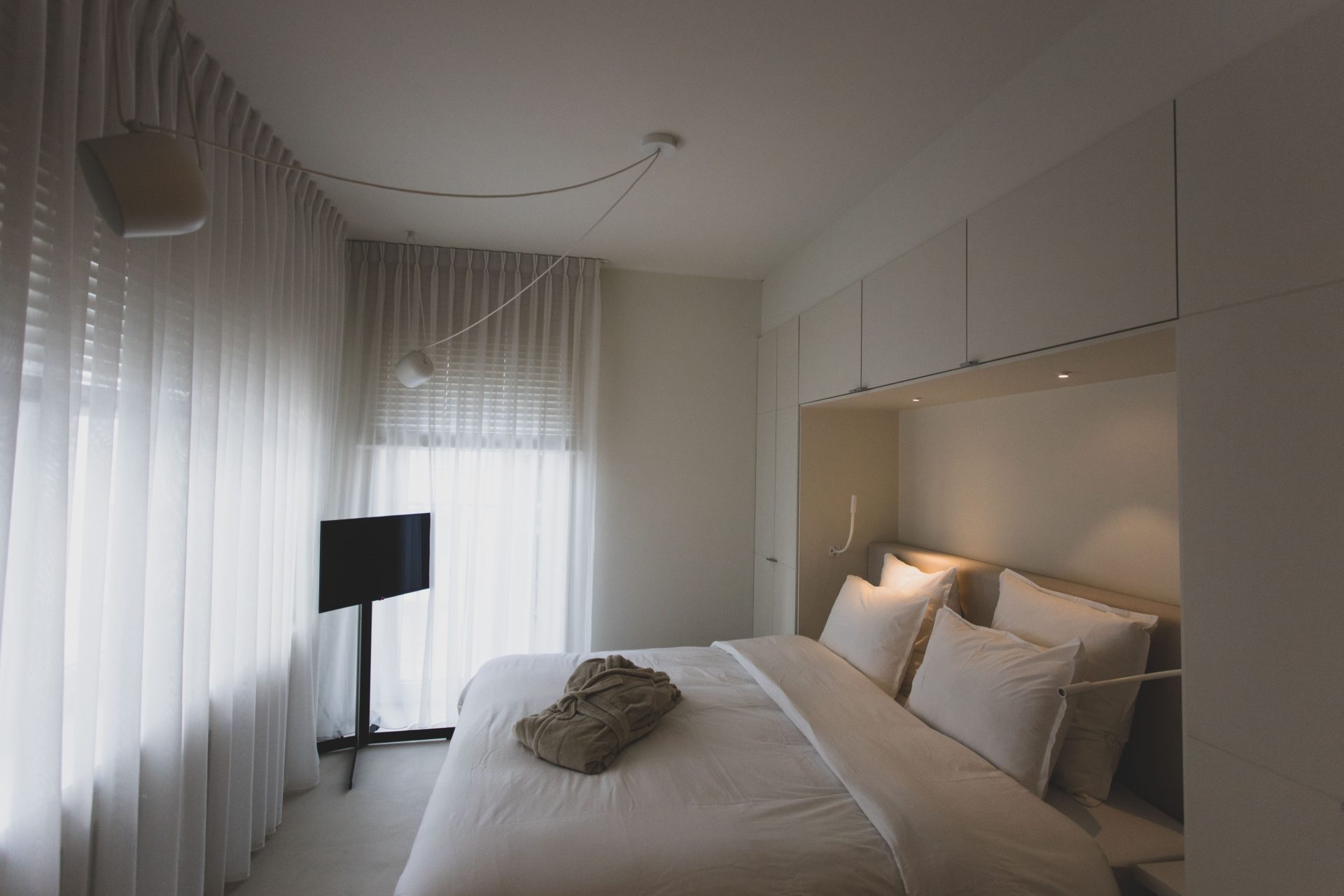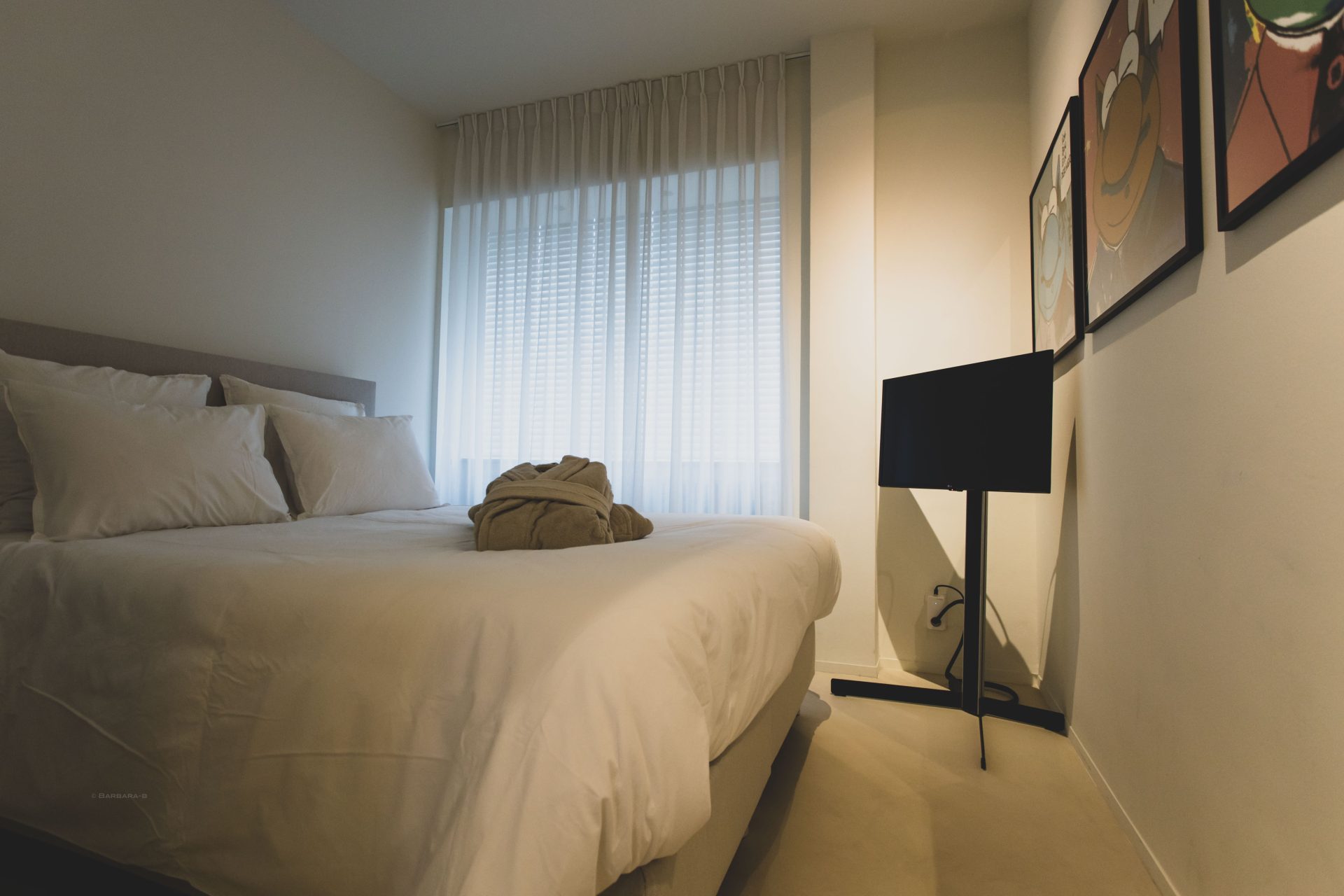 Le revêtement de sol de LiquidFloors© composé d’un enduit minéral y contribue particulièrement : le Socrete travaillé au sol sur les 93 m2 de l’appartement mais également posé sur un mur du living et dans les 2 salles de douche renforce ce sentiment de pureté, de simplicité et de délicatesse.