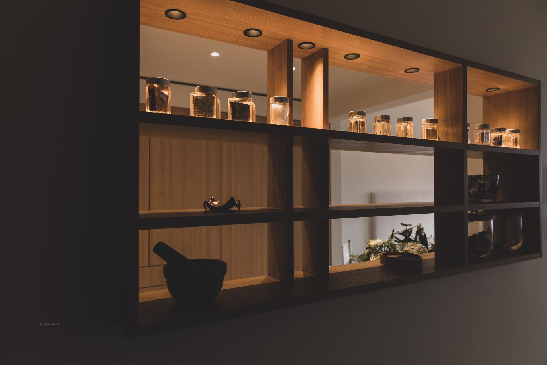 Quelques tablettes murales rétro-éclairées et un claustra en chêne complètent l’aménagement. Canapé Soft NeoWall de Living Divani…