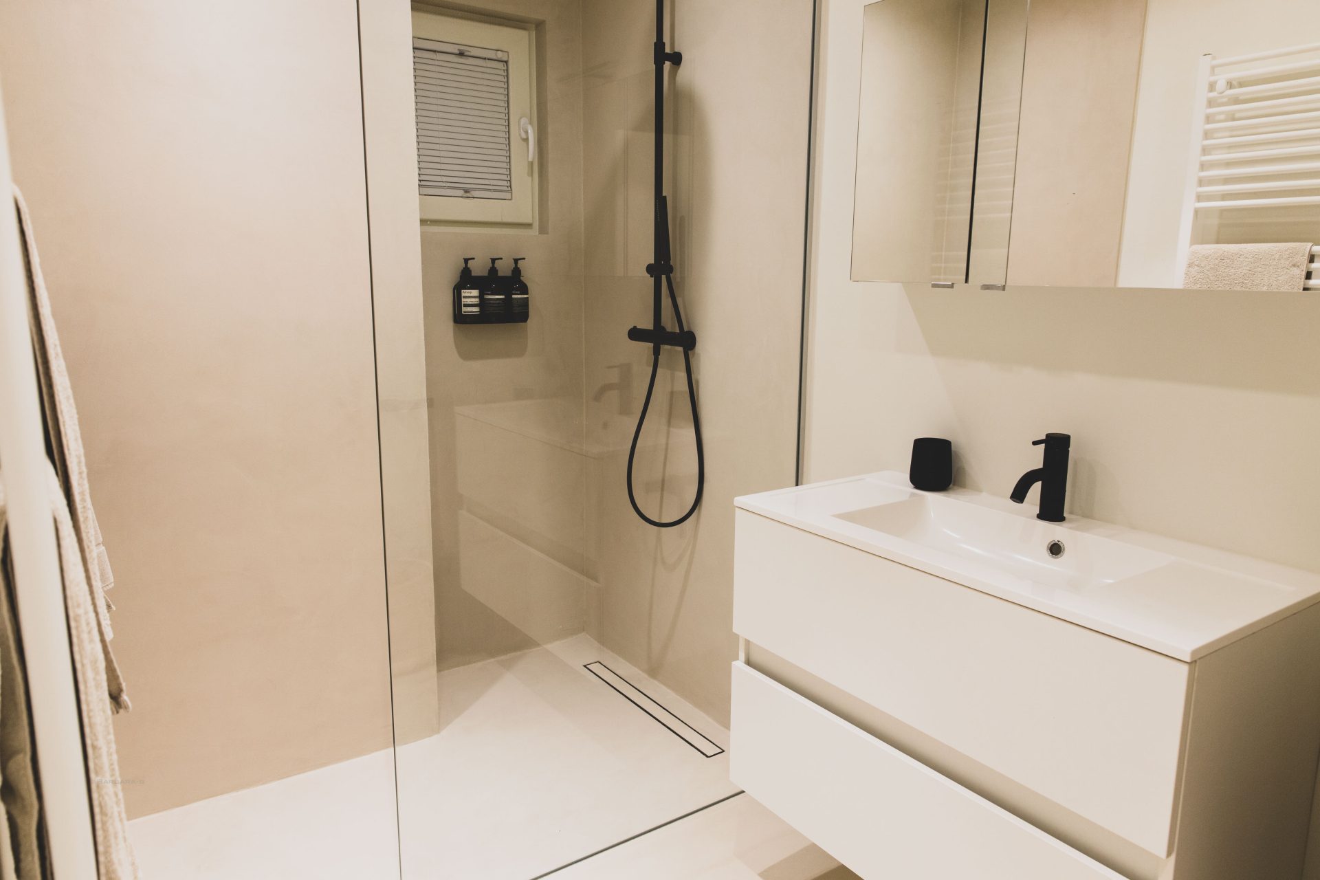 Notez la belle finition des salles de douche : revêtement de sol et habillage mural sans joint, vitrage posé dans un rail invisible, robinetterie noire pour mettre en valeur la beauté naturelle du Socrete.