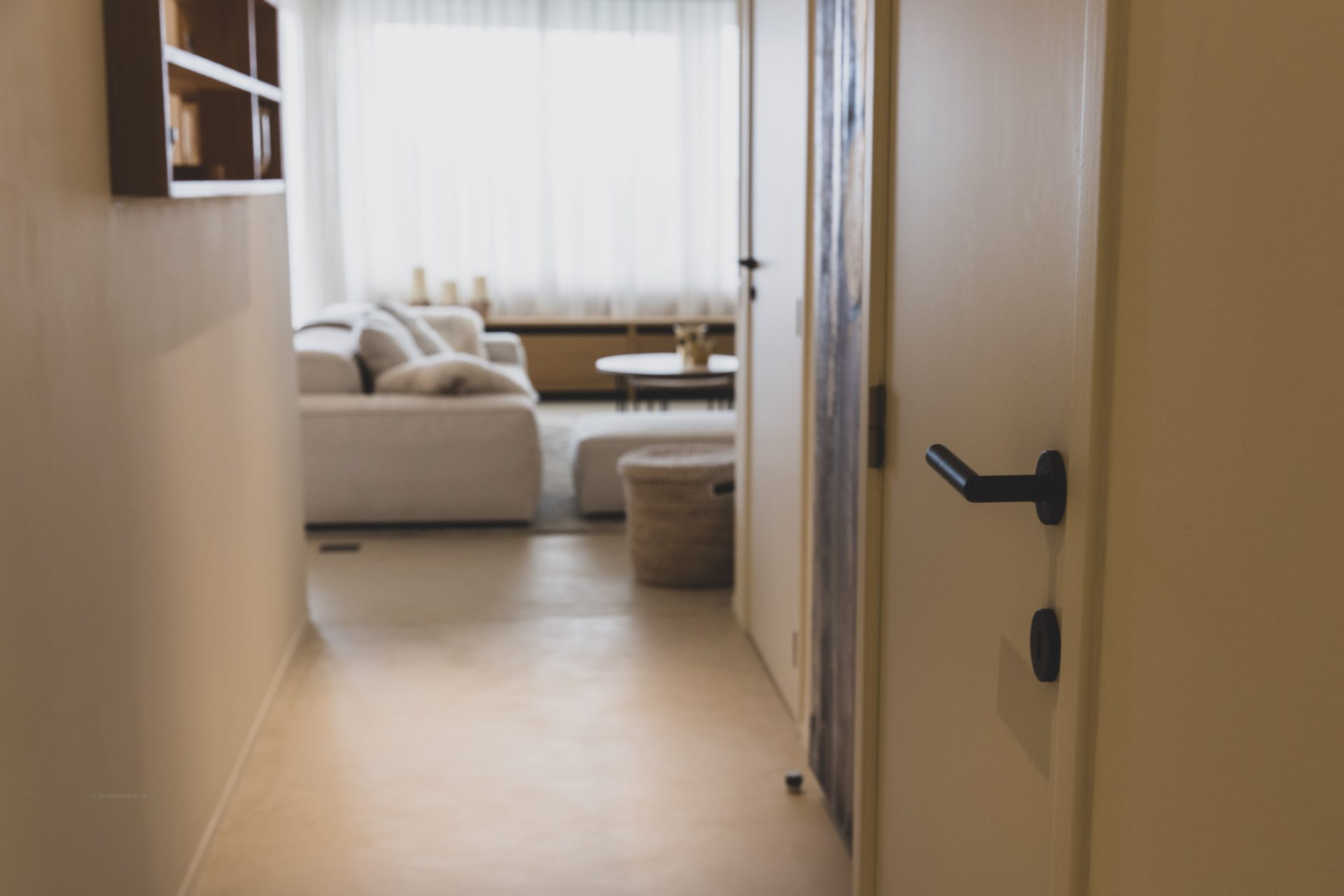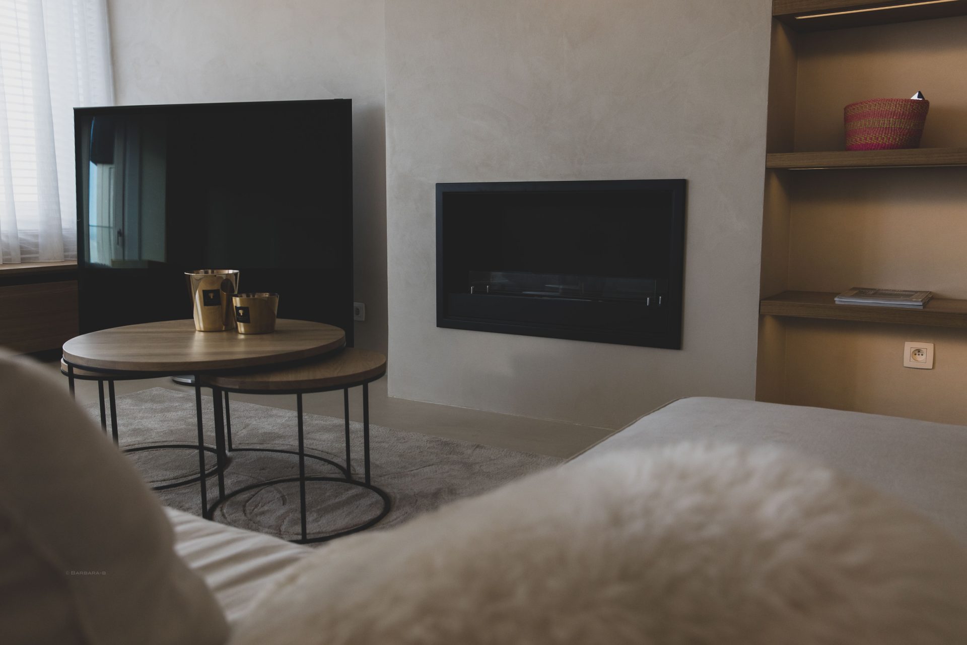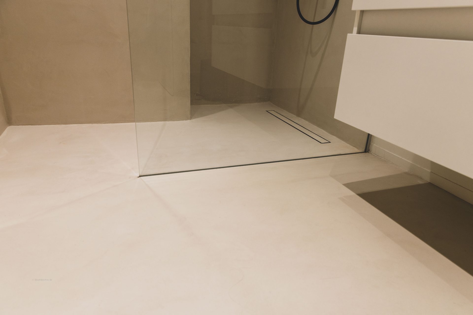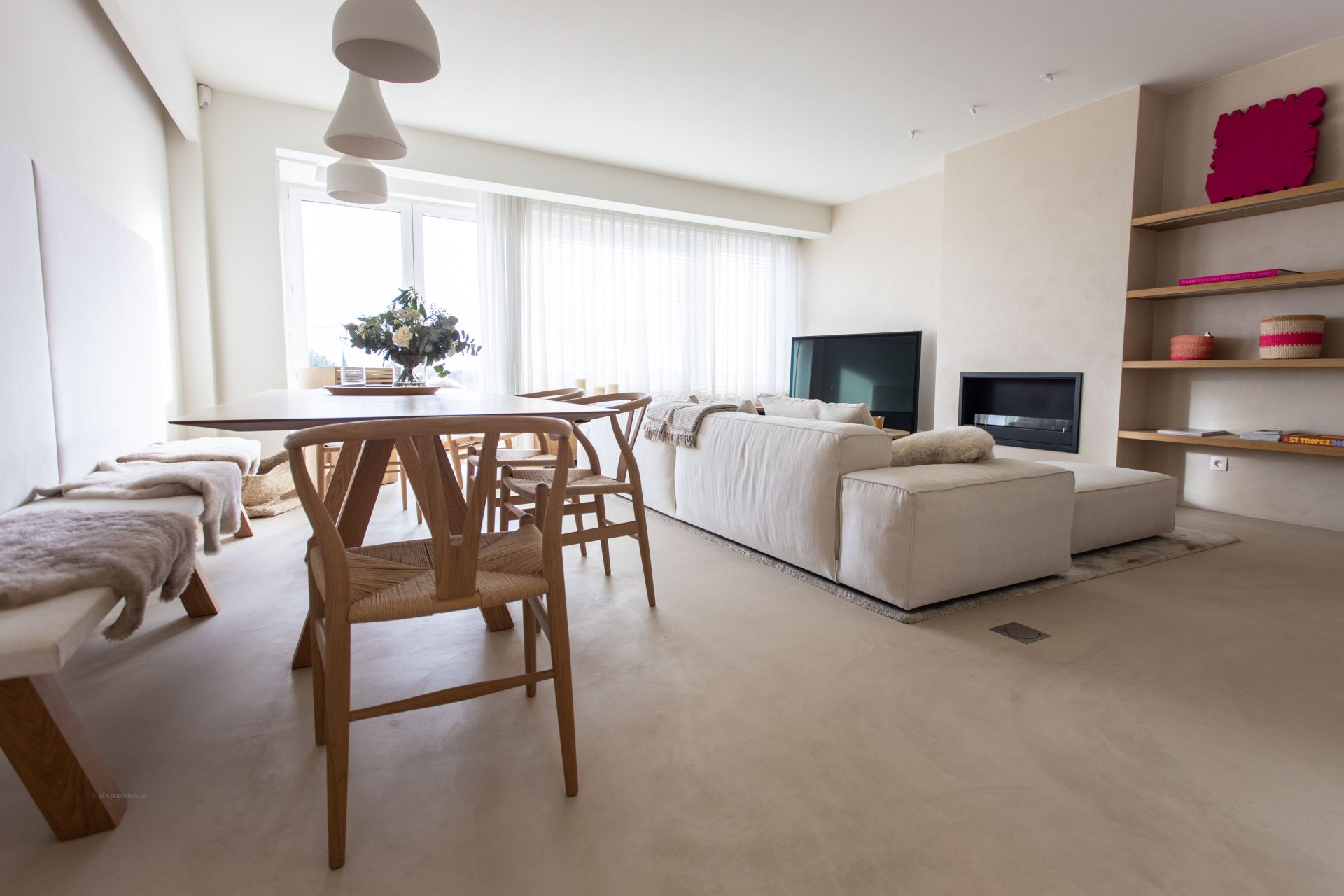 Le revêtement de sol de LiquidFloors© composé d’un enduit minéral y contribue particulièrement : le Socrete travaillé au sol sur les 93 m2 de l’appartement mais également posé sur un mur du living et dans les 2 salles de douche renforce ce sentiment de pureté, de simplicité et de délicatesse.