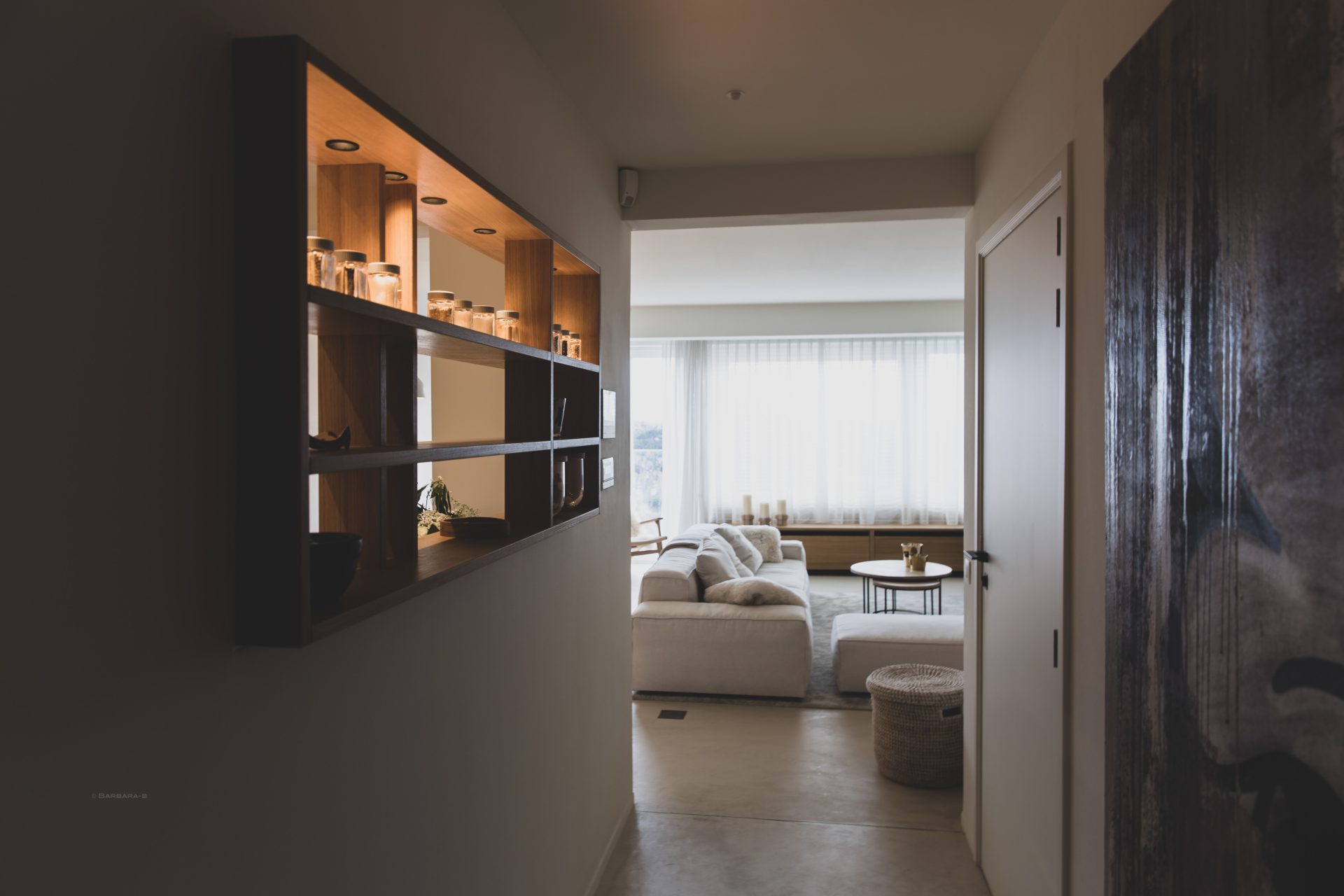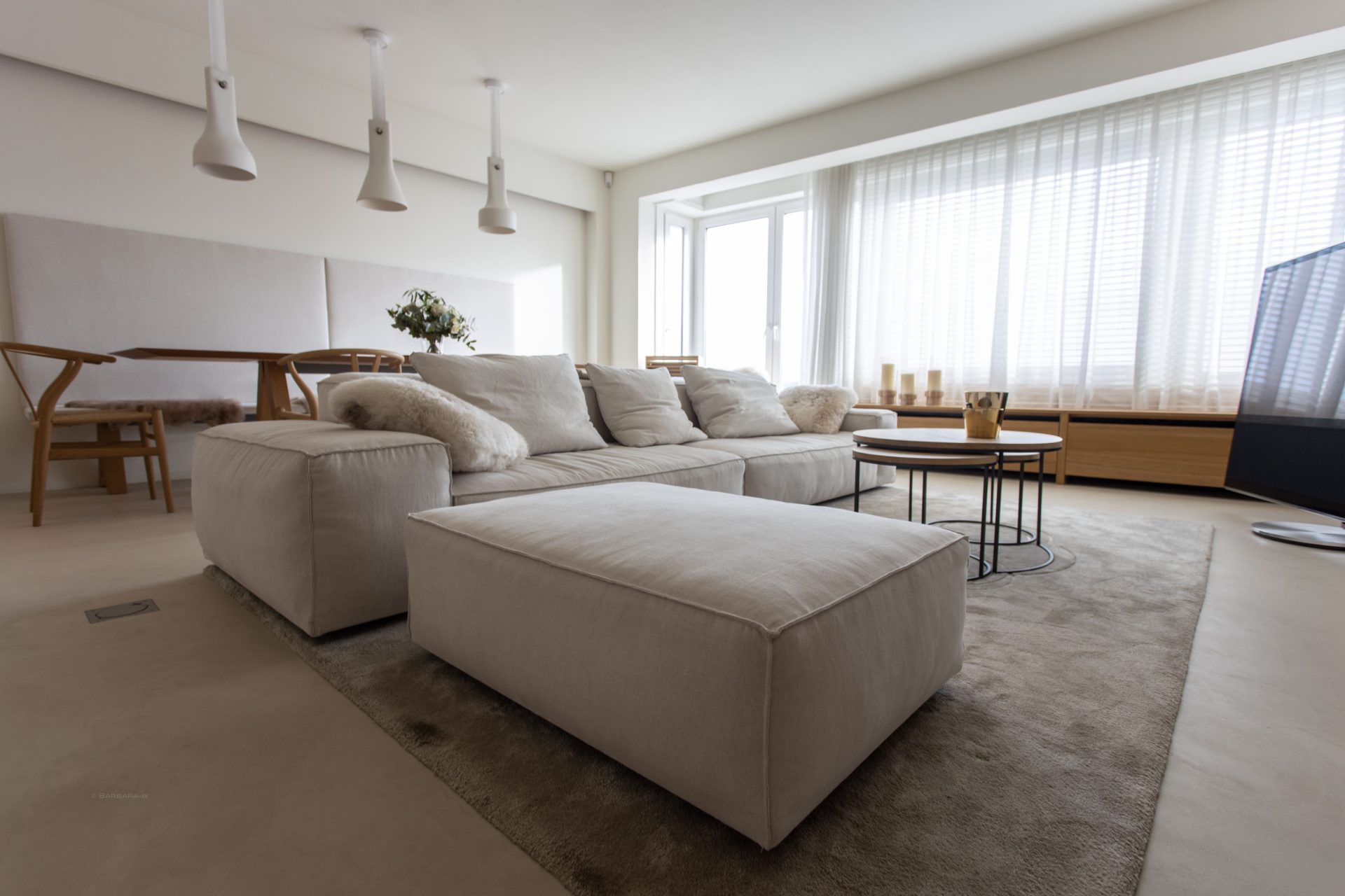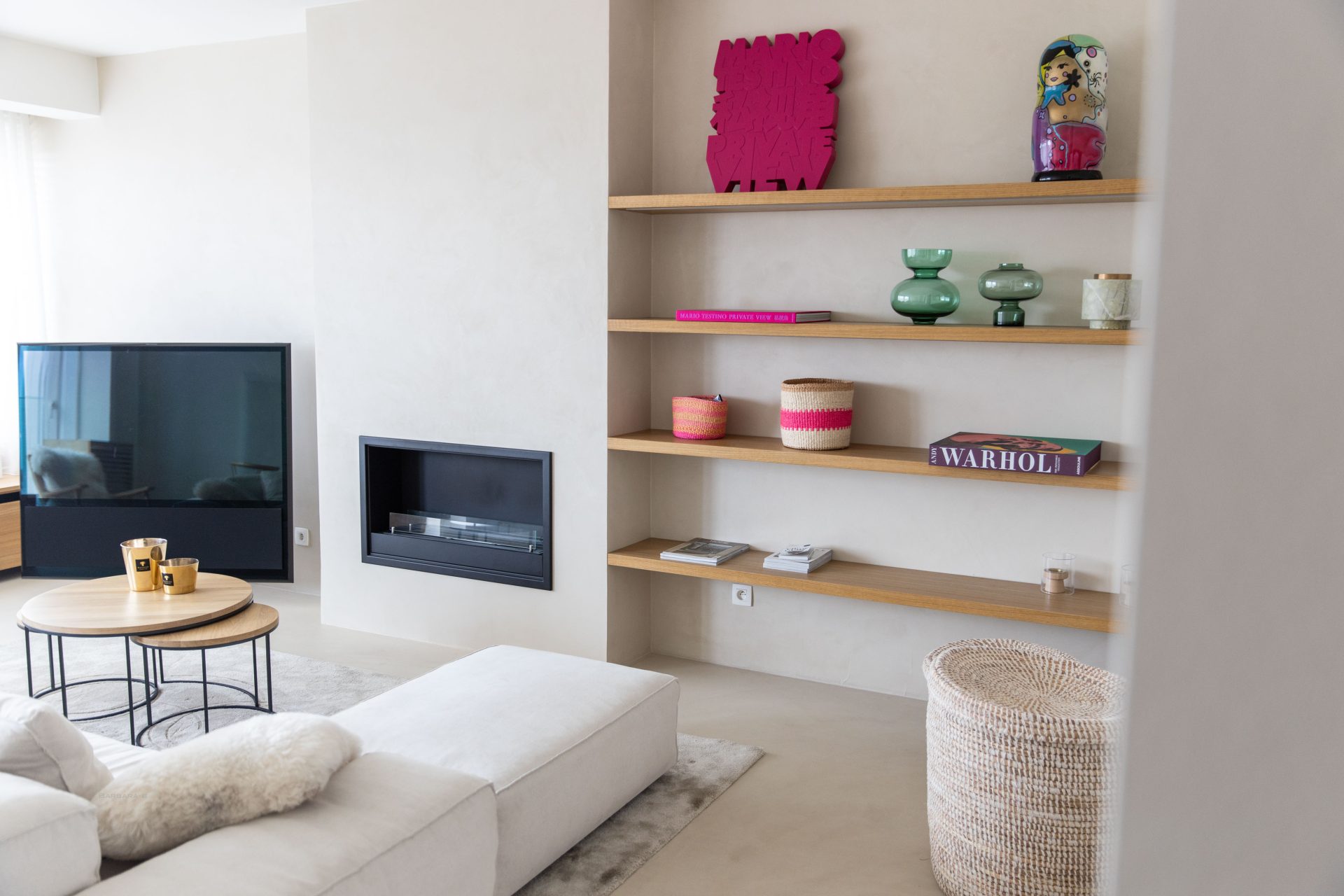 Le revêtement de sol de LiquidFloors© composé d’un enduit minéral y contribue particulièrement : le Socrete travaillé au sol sur les 93 m2 de l’appartement mais également posé sur un mur du living et dans les 2 salles de douche renforce ce sentiment de pureté, de simplicité et de délicatesse.