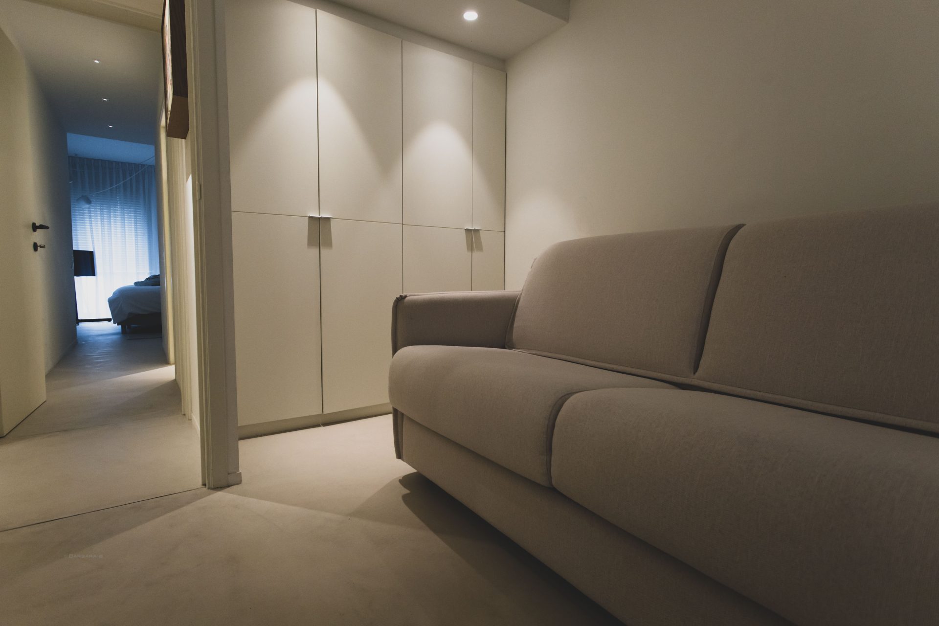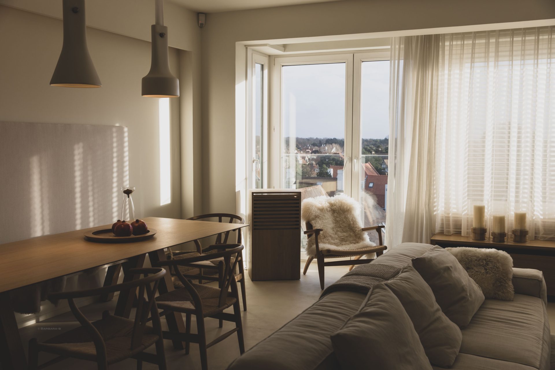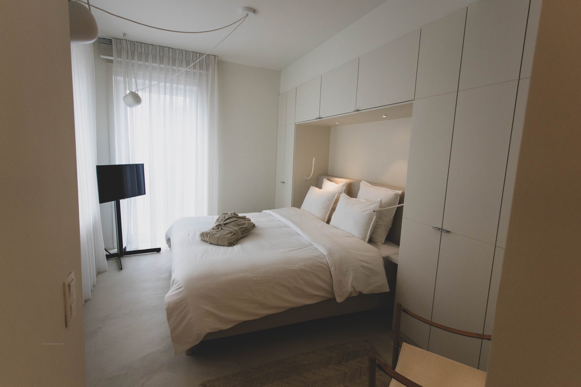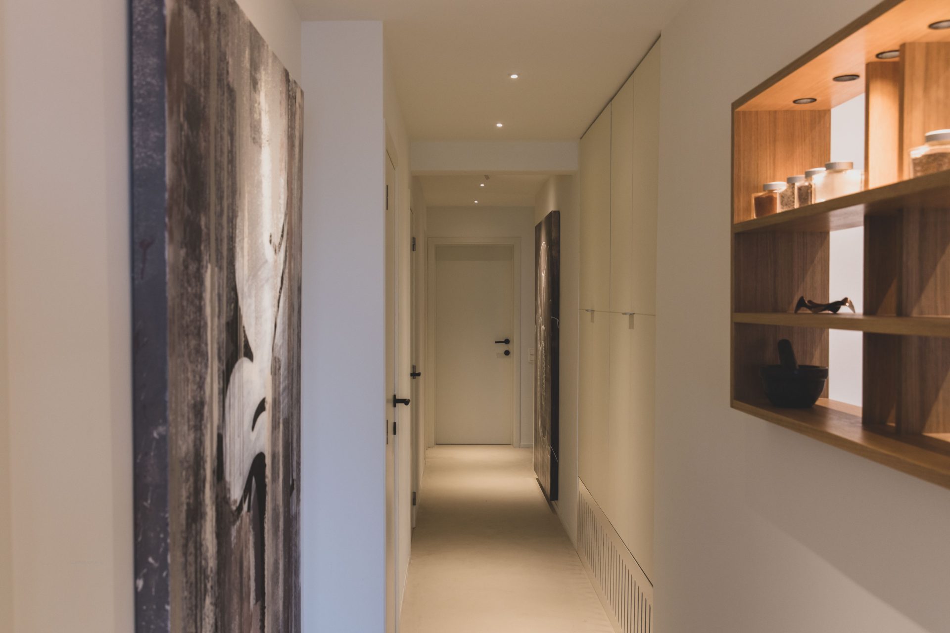 Le revêtement de sol de LiquidFloors© composé d’un enduit minéral y contribue particulièrement : le Socrete travaillé au sol sur les 93 m2 de l’appartement mais également posé sur un mur du living et dans les 2 salles de douche renforce ce sentiment de pureté, de simplicité et de délicatesse.