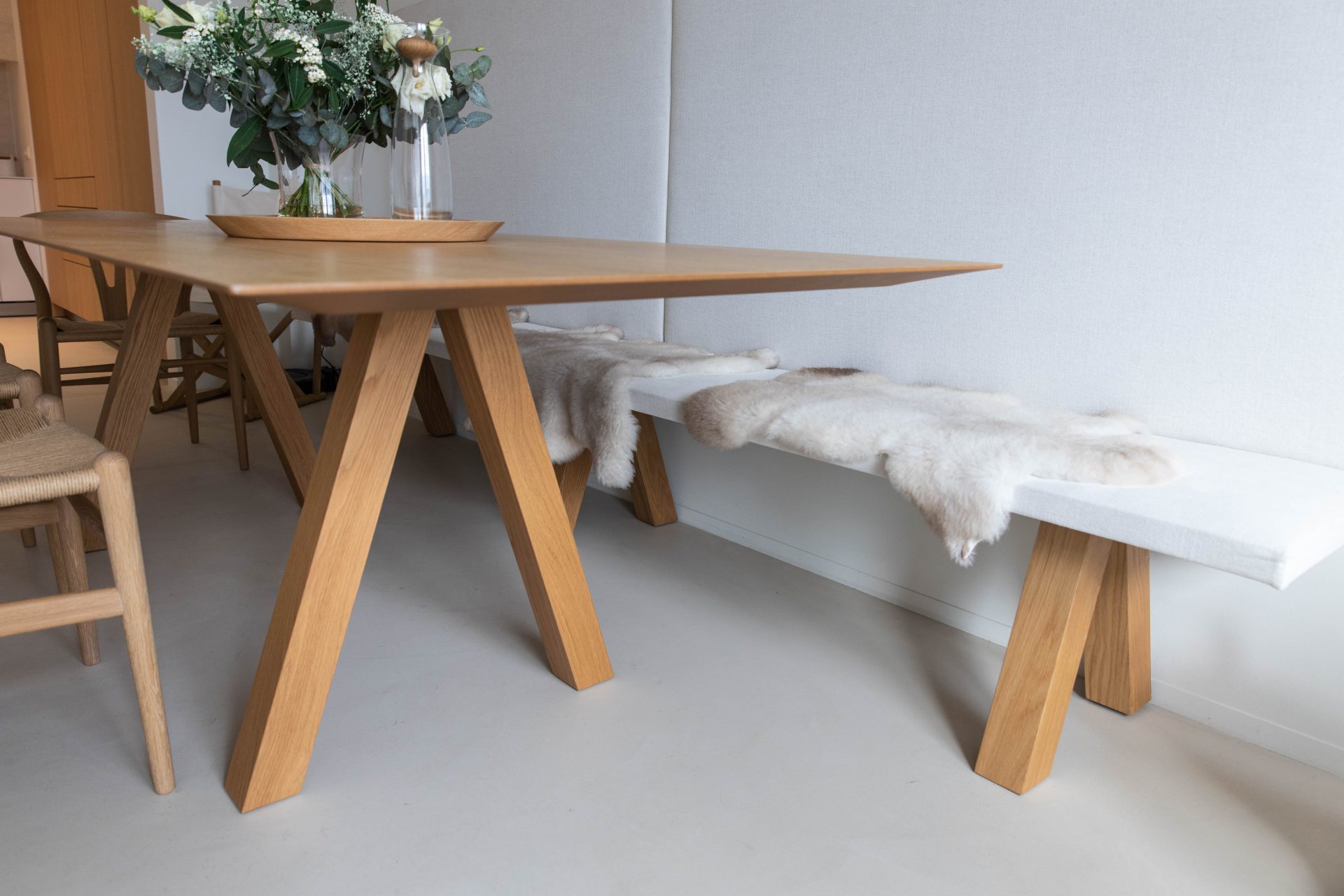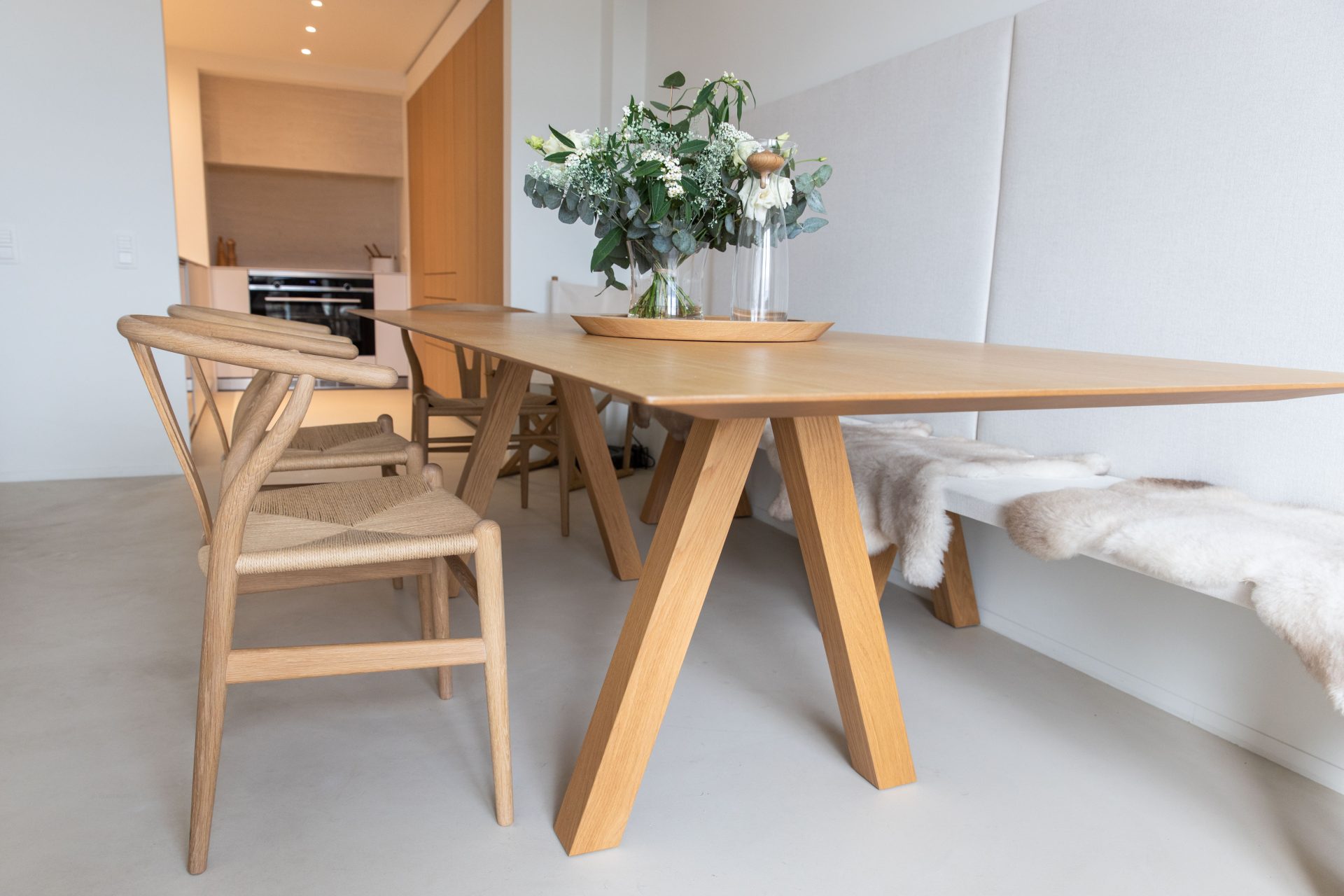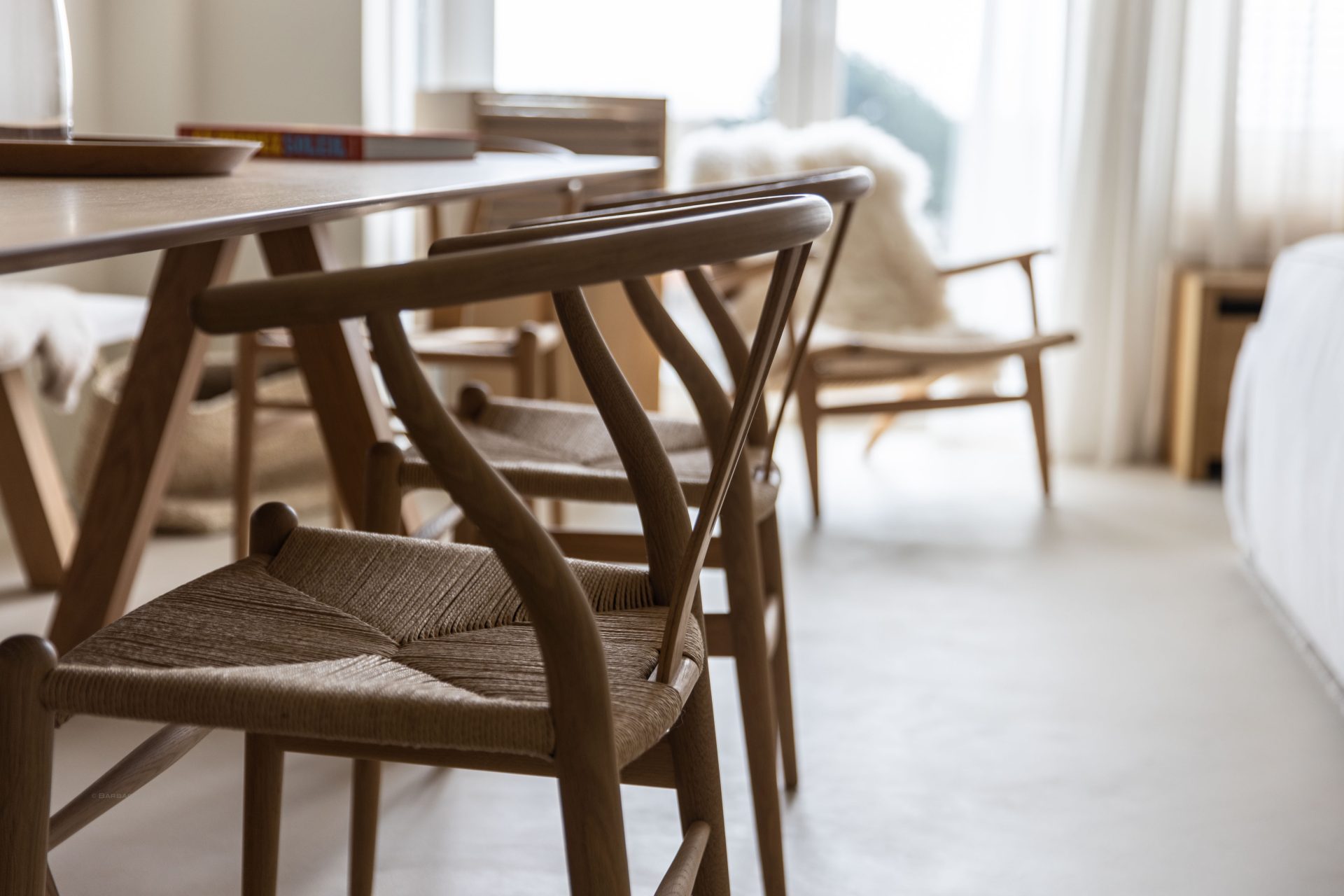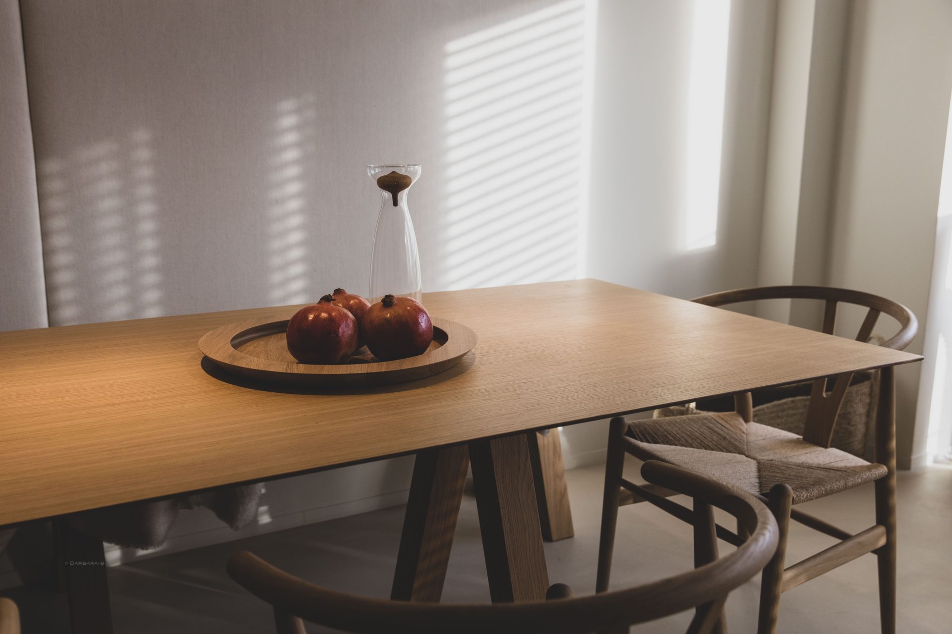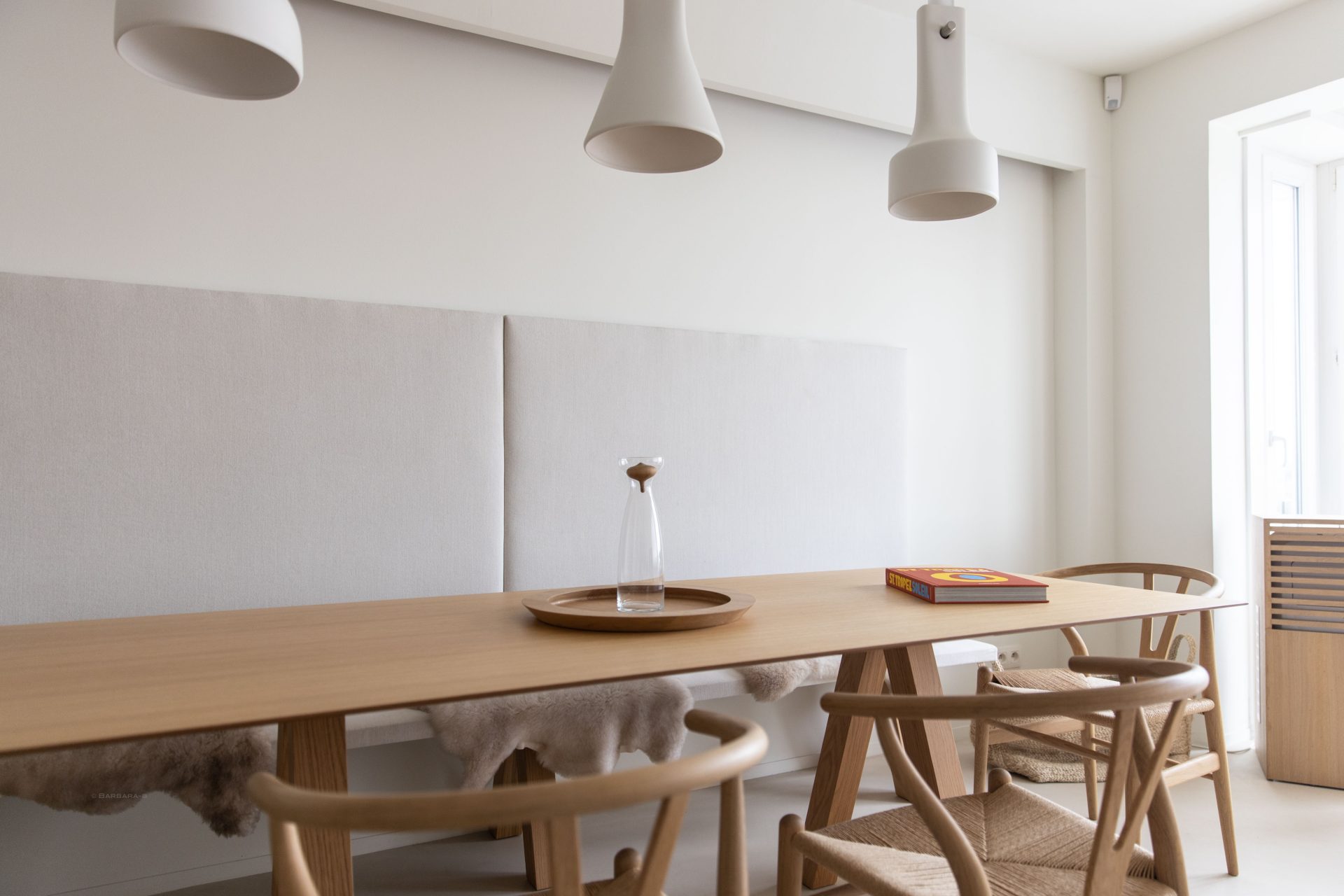 Le mobilier en chêne massif de la salle à manger [ de Viccarbe et Karl Hansen ] se marie parfaitement à cet intérieur baigné d’une douce lumière.