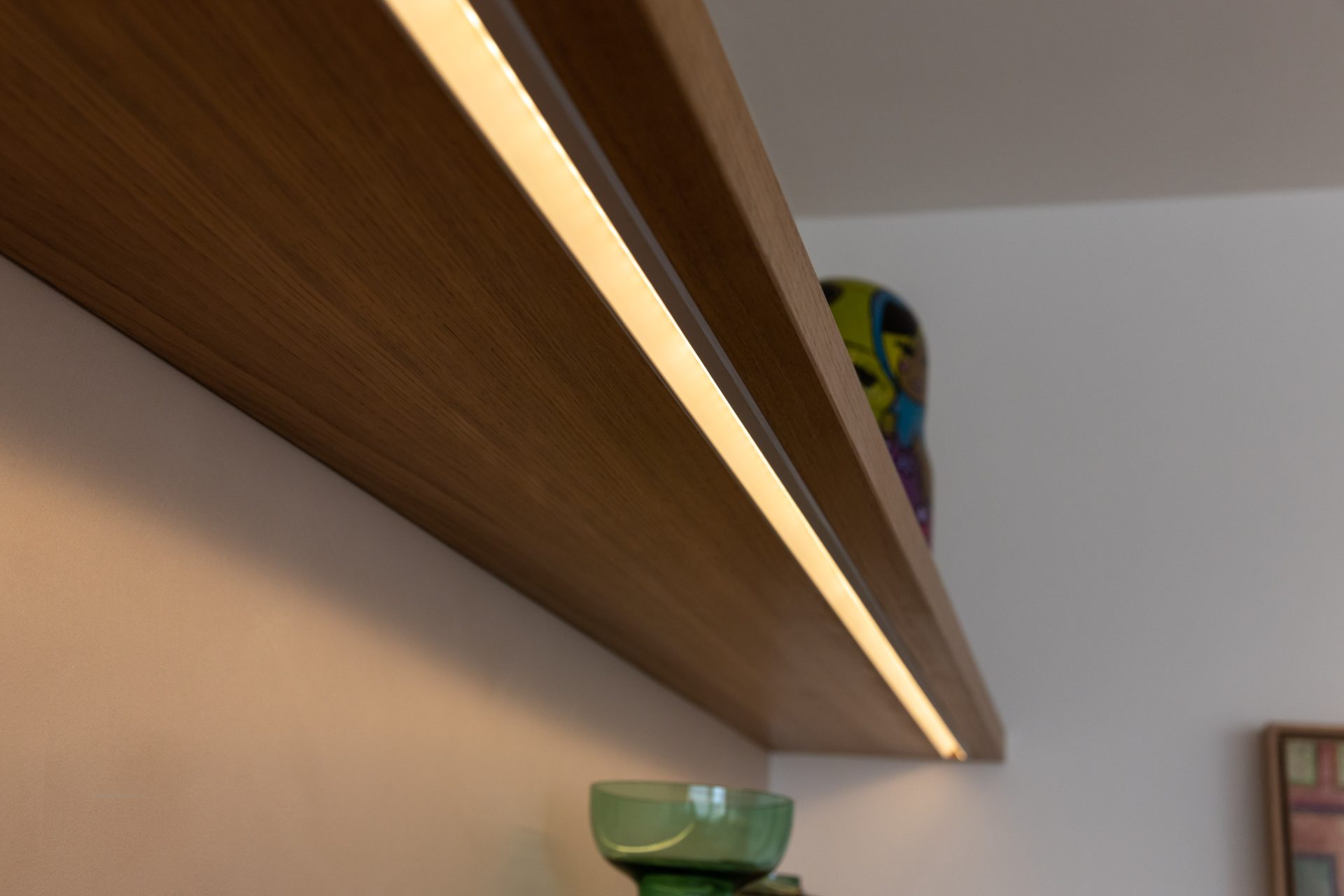 Quelques tablettes murales rétro-éclairées et un claustra en chêne complètent l’aménagement. Canapé Soft NeoWall de Living Divani…