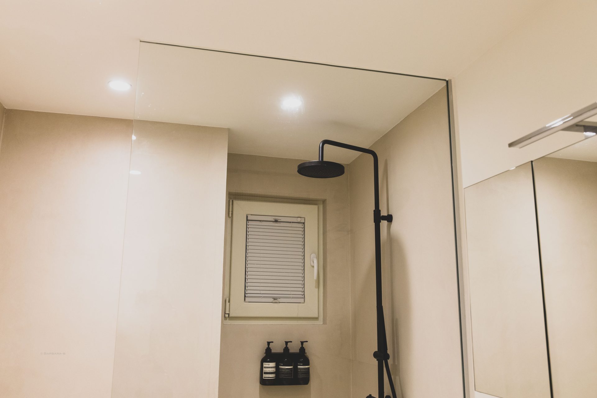 Notez la belle finition des salles de douche : revêtement de sol et habillage mural sans joint, vitrage posé dans un rail invisible, robinetterie noire pour mettre en valeur la beauté naturelle du Socrete.