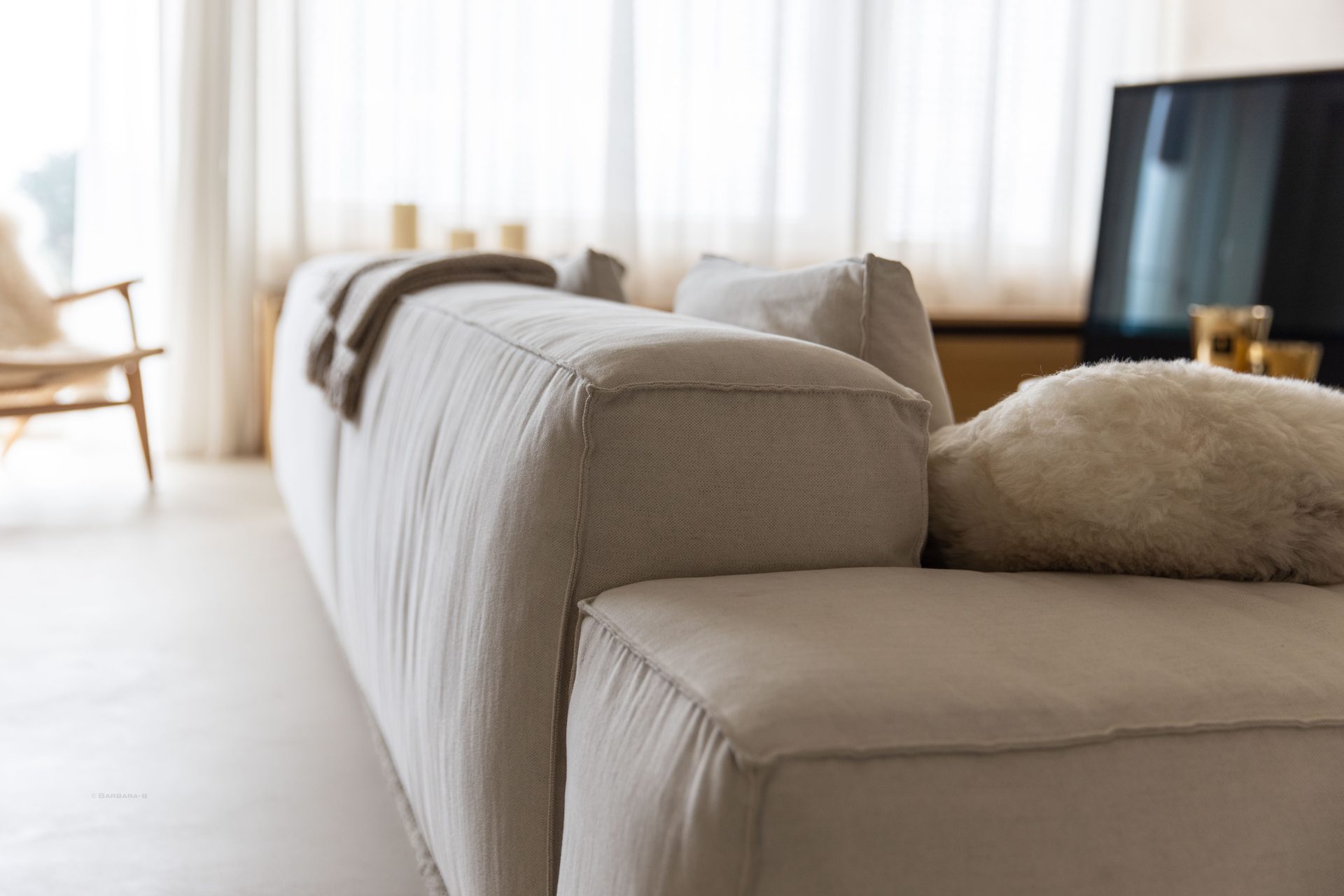 Dans ce projet, nous avons opté pour un ton sur ton ultra-chic : du blanc cassé, du beige, des teintes douces au fini velouté et très naturel nous ont permis de créer cet effet « cocon ».