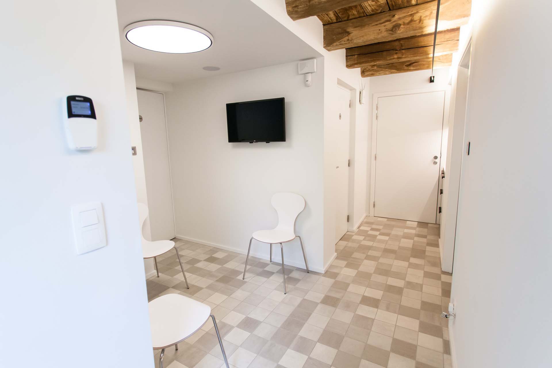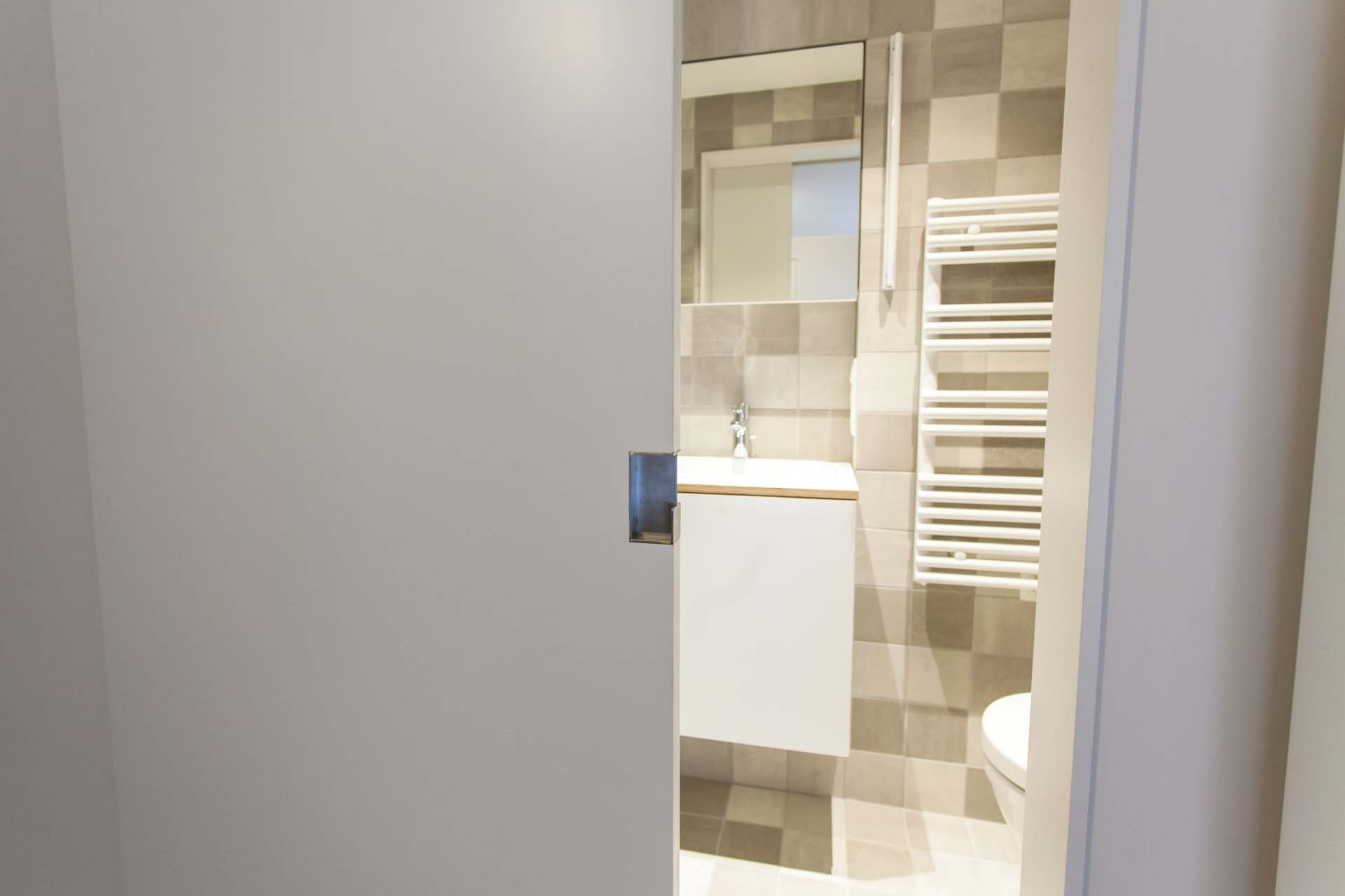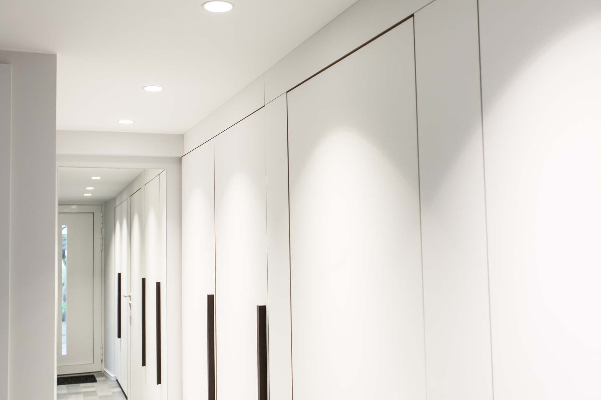 Cette mission n’a pas été simple : le bâtiment était anciennement une étable, les murs rejetaient encore les traces de la vie du bétail, les pièces étaient petites et les plafonds bas. C’est dans les situations les plus difficiles que notre créativité trouve écho. De sombre, les pièces sont devenues lumineuses, bien agencées et bien structurées autour du métier de podothérapeute. Le mobilier de la partie professionnelle a été conçu sur mesure sur base des besoins et des attentes de Monsieur Van Ooteghem. Les éclairages ont particulièrement été bien étudiés pour répondre aux exigences et à la précision des soins à apporter aux patients. Les accès eux aussi sont adaptés : ouvertures suffisamment larges pour les PRM.