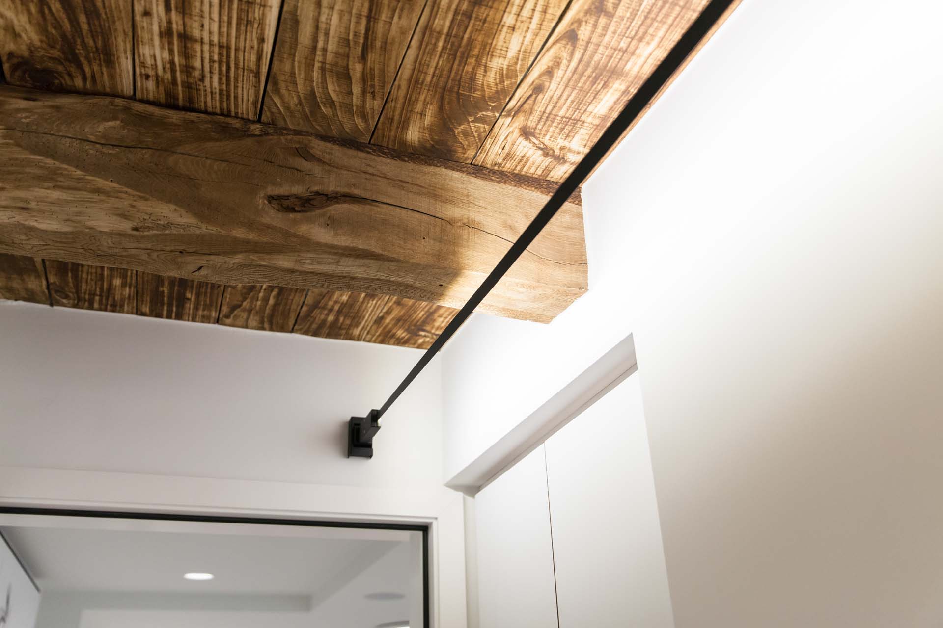 Lors des travaux de démolition, un ancien plafond en bois a été mis à jour et nous avons décidé — en accord avec nos clients — de le garder dans le hall d’accès professionnel… Le résultat est top : la présence du bois rend ses lettres de noblesse à l’ensemble et apporte une douce chaleur, superbement soulignée par un rail lumineux d’une extrême finesse de Davide Groppi. L’ambiance générale à l’espace Gravitéo est douce, réconfortante, soignée, rassurante mais aussi moderne, technique et nette, tous ces qualificatifs qui décrivent si bien le métier du Maître d’Œuvre.