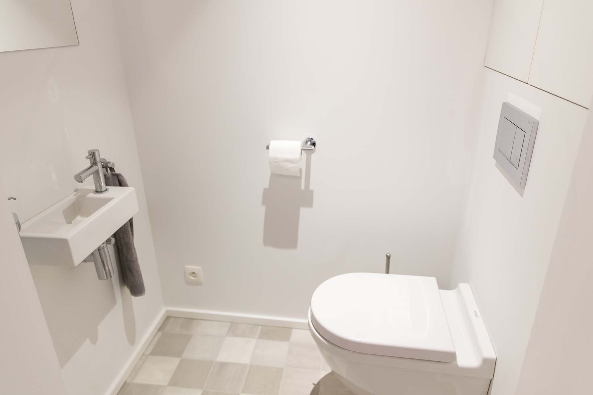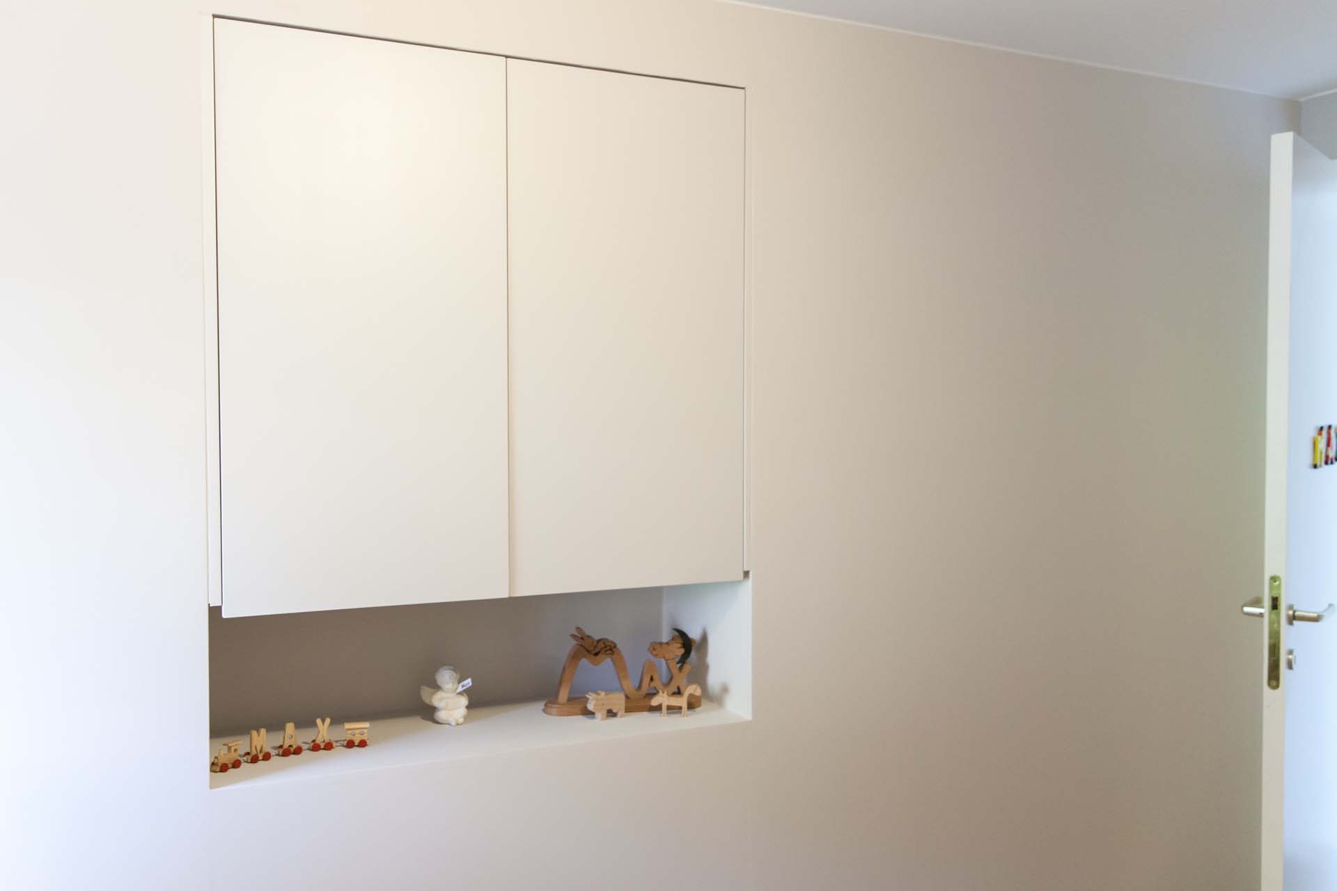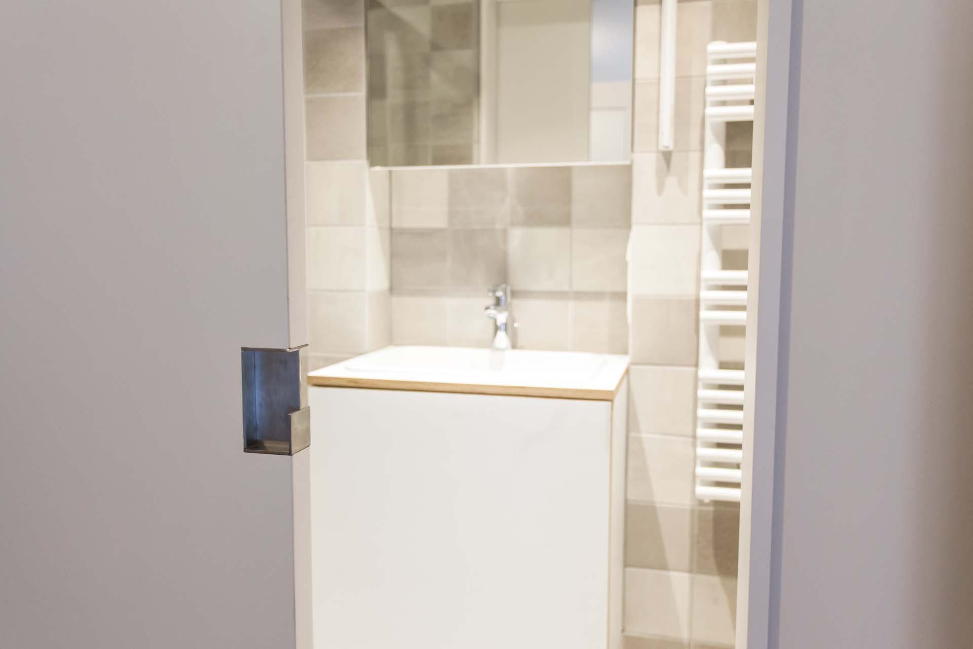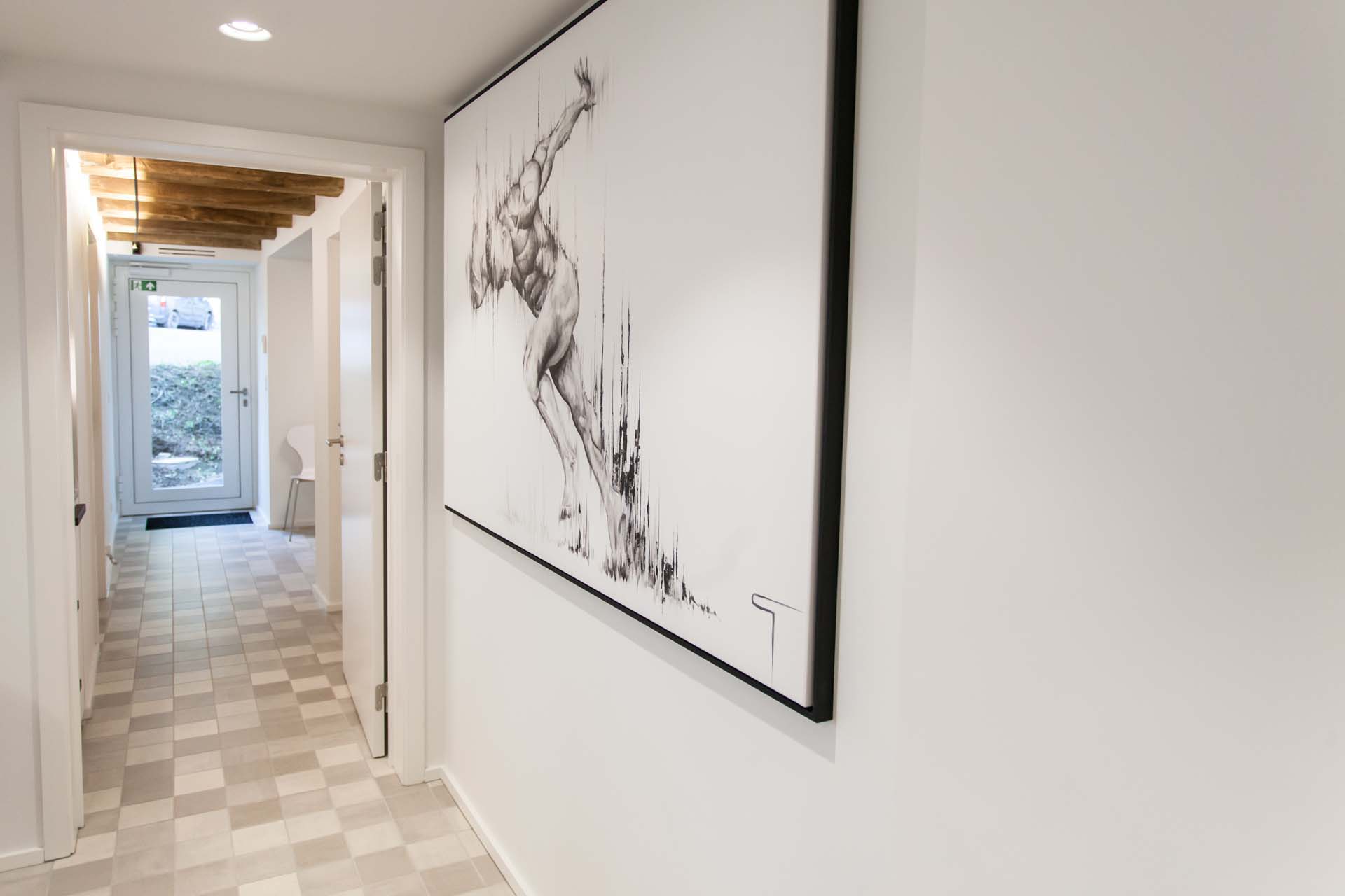 Cette mission n’a pas été simple : le bâtiment était anciennement une étable, les murs rejetaient encore les traces de la vie du bétail, les pièces étaient petites et les plafonds bas. C’est dans les situations les plus difficiles que notre créativité trouve écho. De sombre, les pièces sont devenues lumineuses, bien agencées et bien structurées autour du métier de podothérapeute. Le mobilier de la partie professionnelle a été conçu sur mesure sur base des besoins et des attentes de Monsieur Van Ooteghem. Les éclairages ont particulièrement été bien étudiés pour répondre aux exigences et à la précision des soins à apporter aux patients. Les accès eux aussi sont adaptés : ouvertures suffisamment larges pour les PRM.