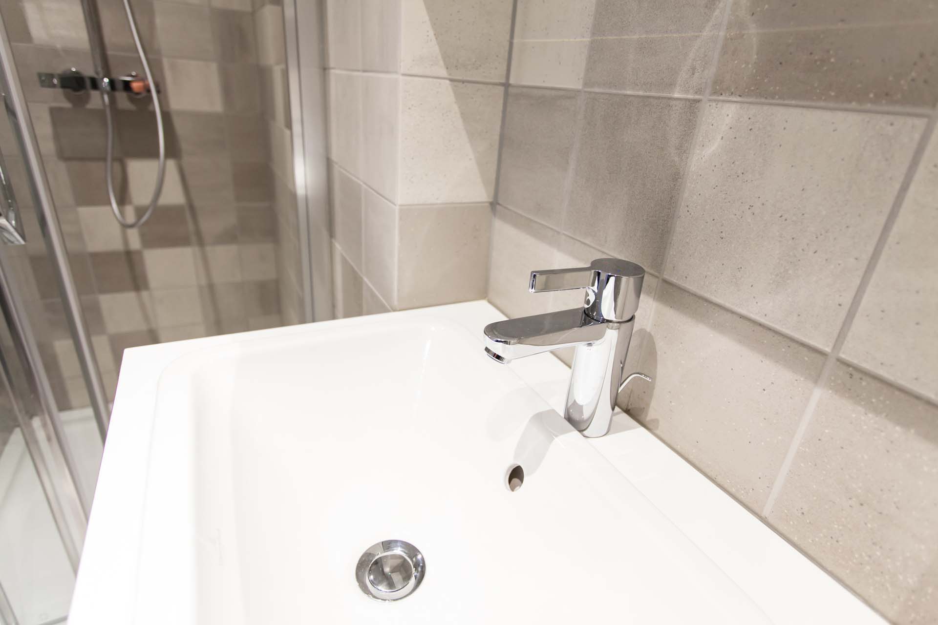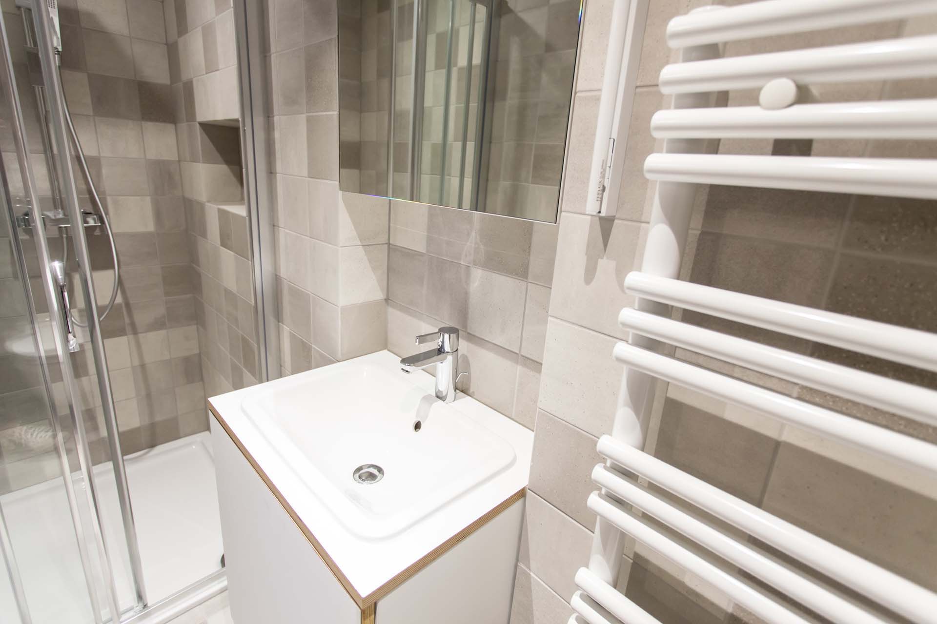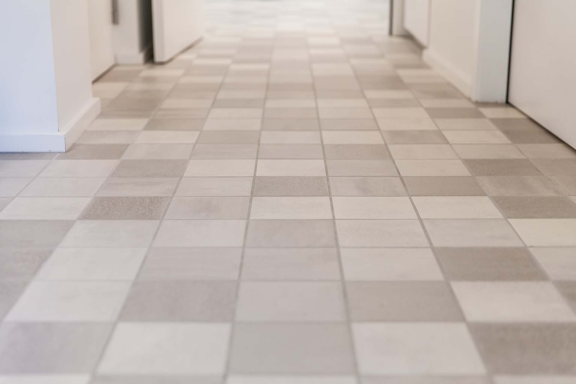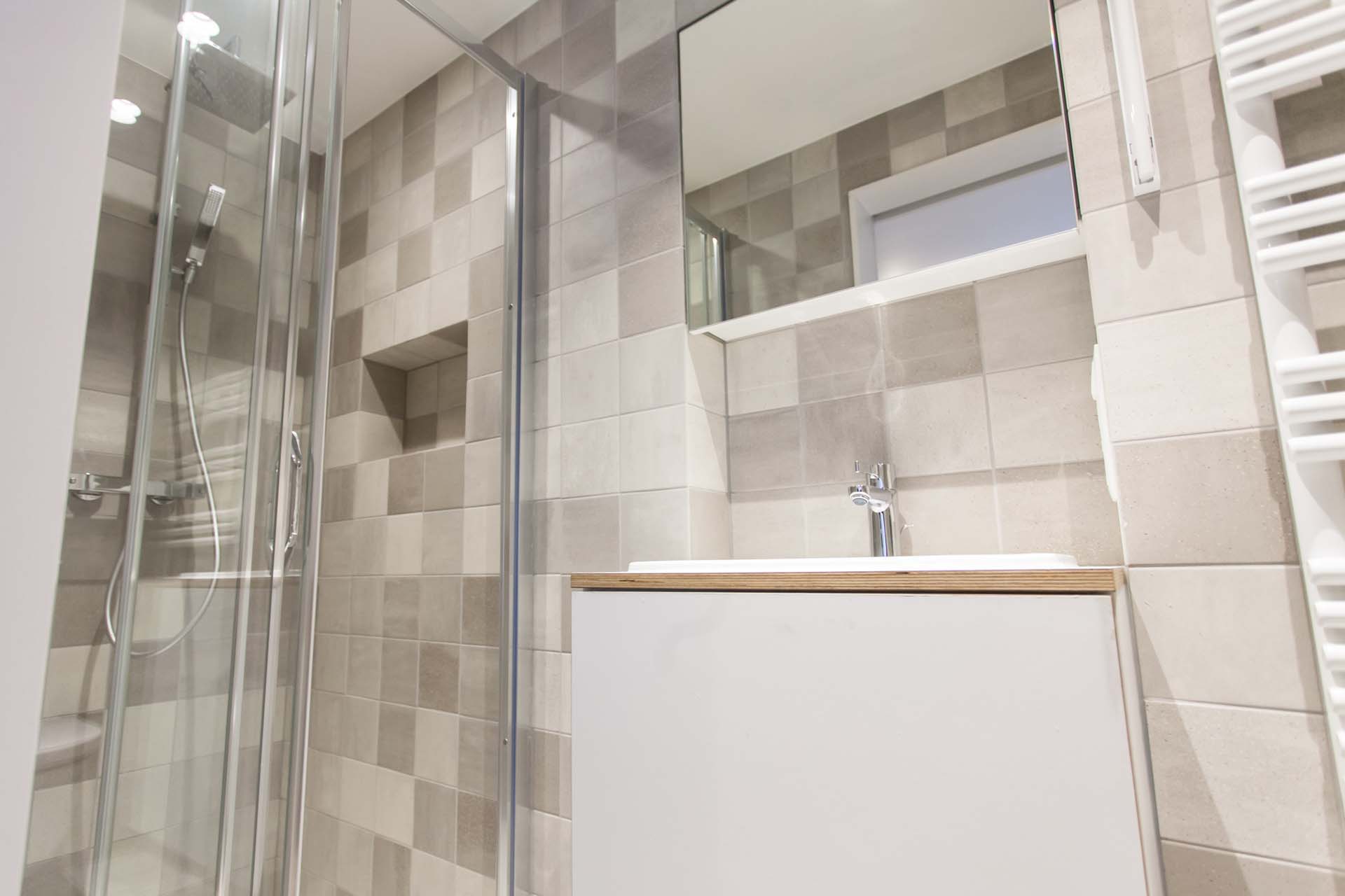 Le sol est composé d’une mosaïque ton sur ton en dégradé de beiges de carreaux Mosa, qui confère à l’ensemble une belle légèreté et une belle dynamique.