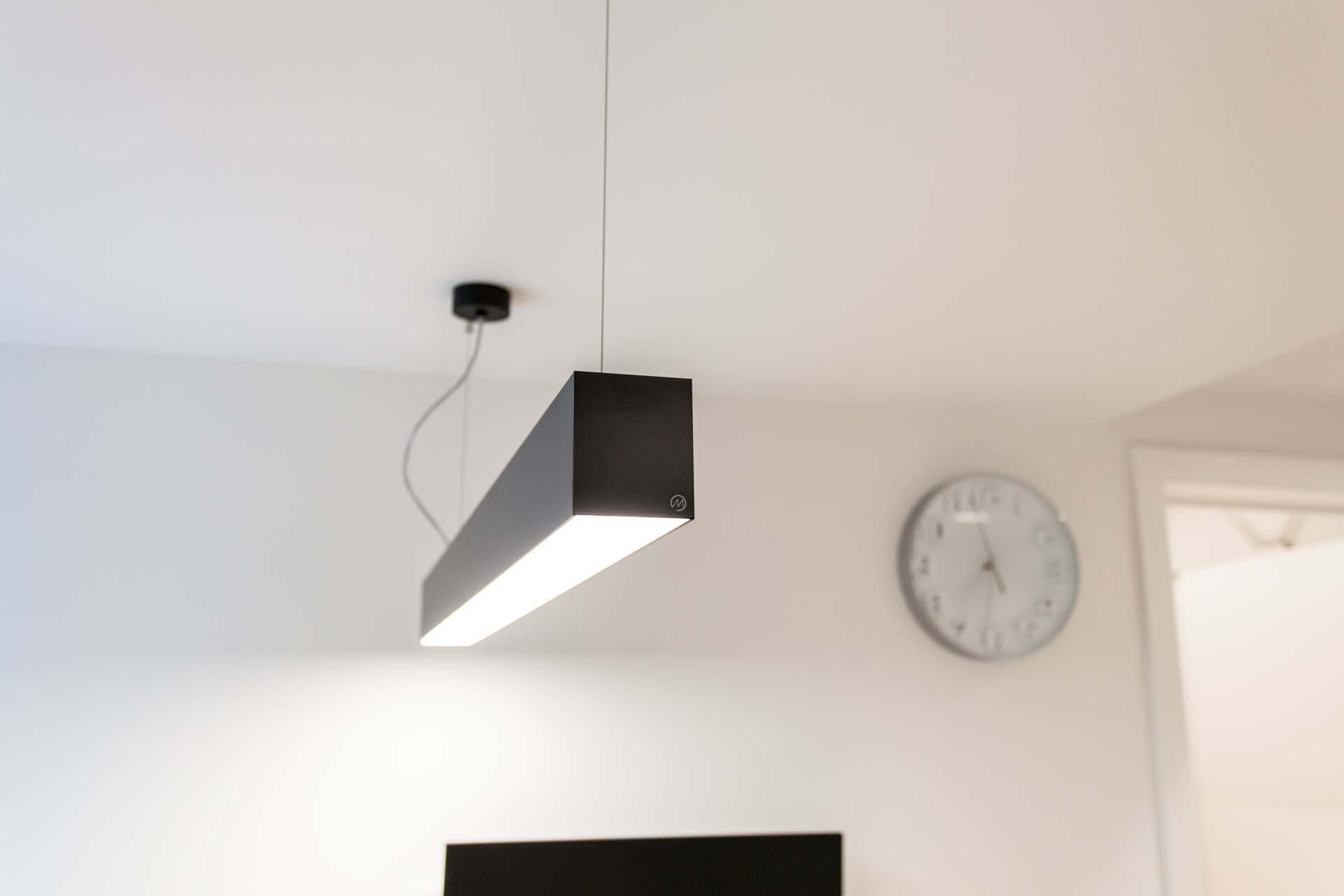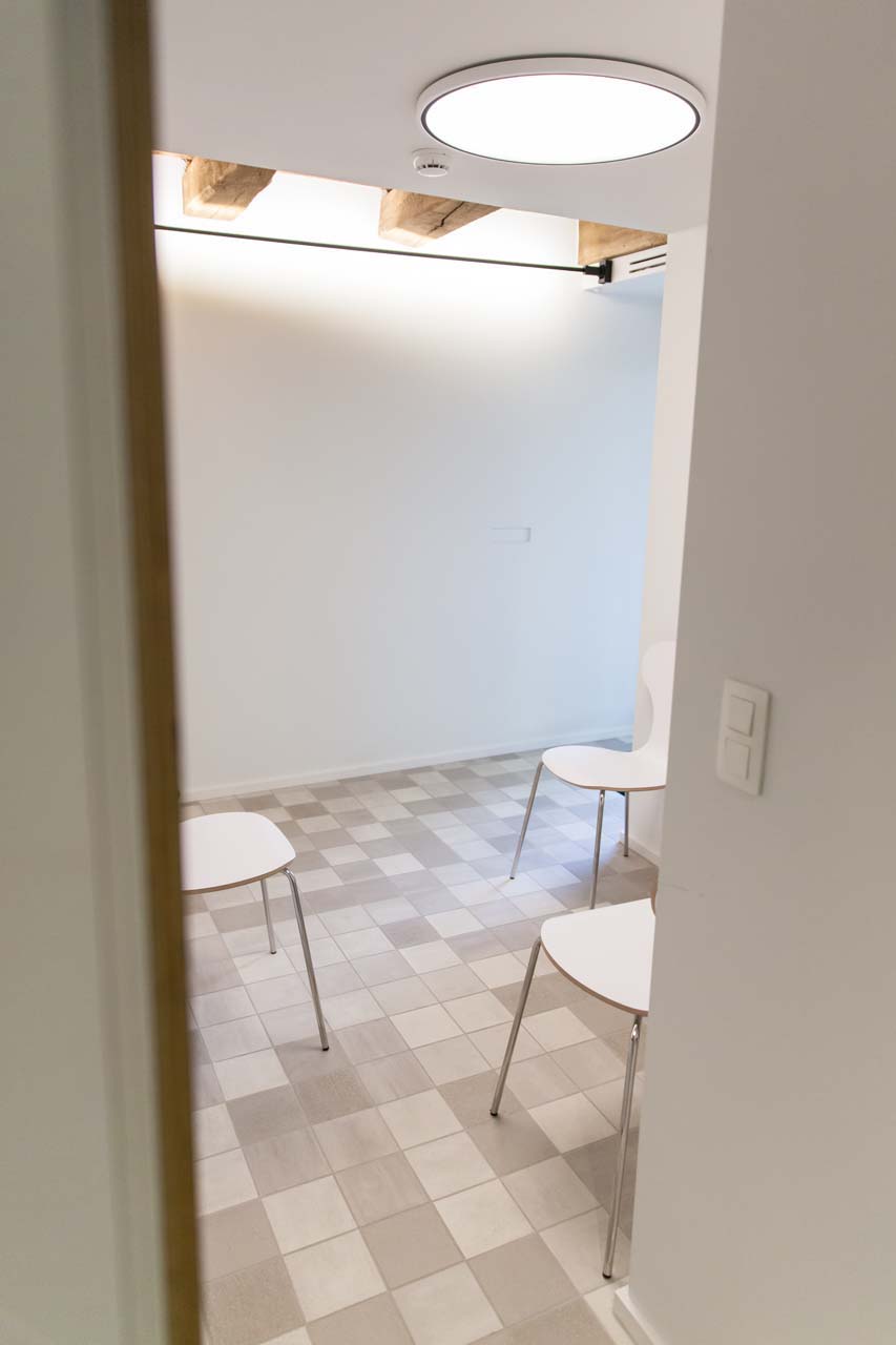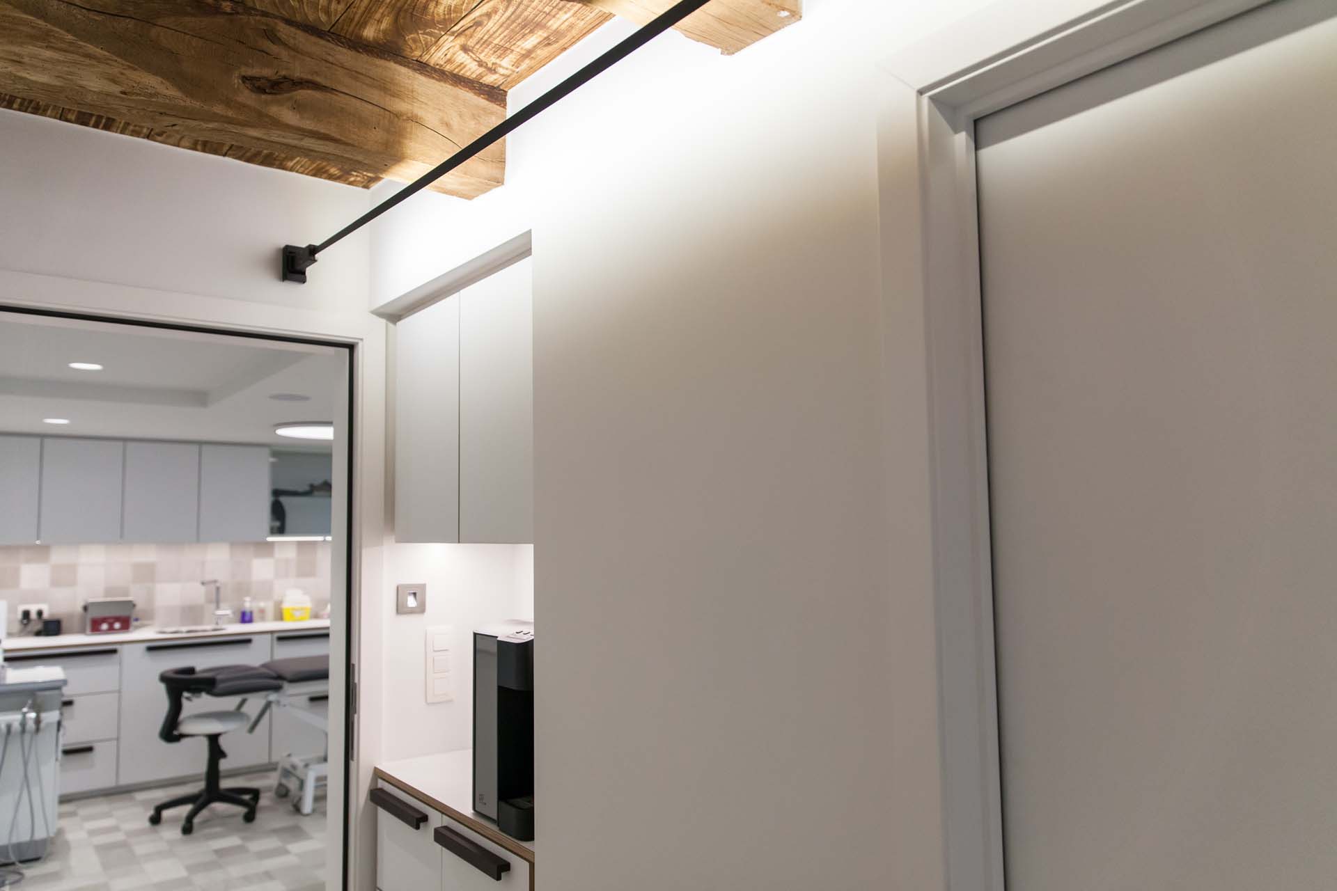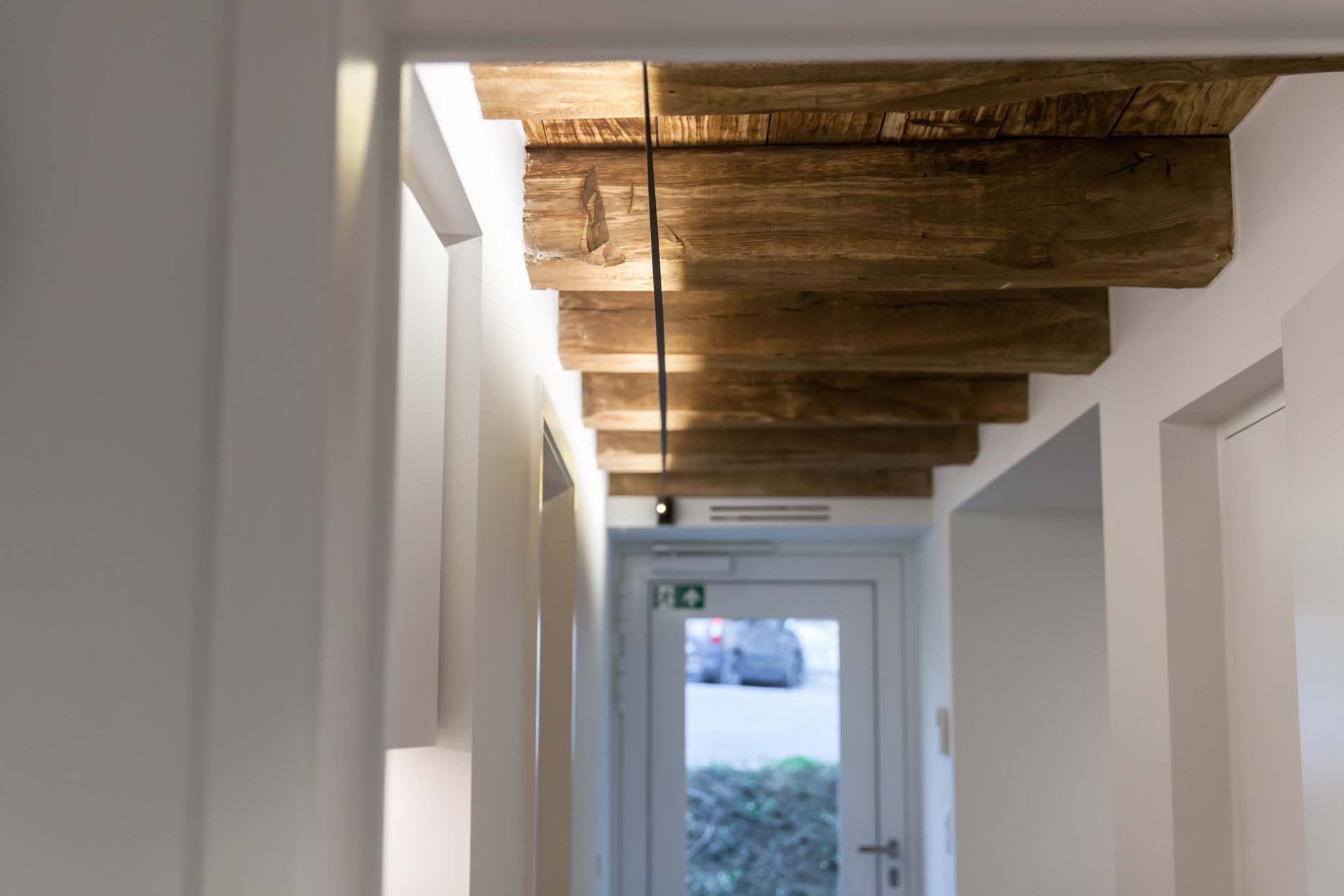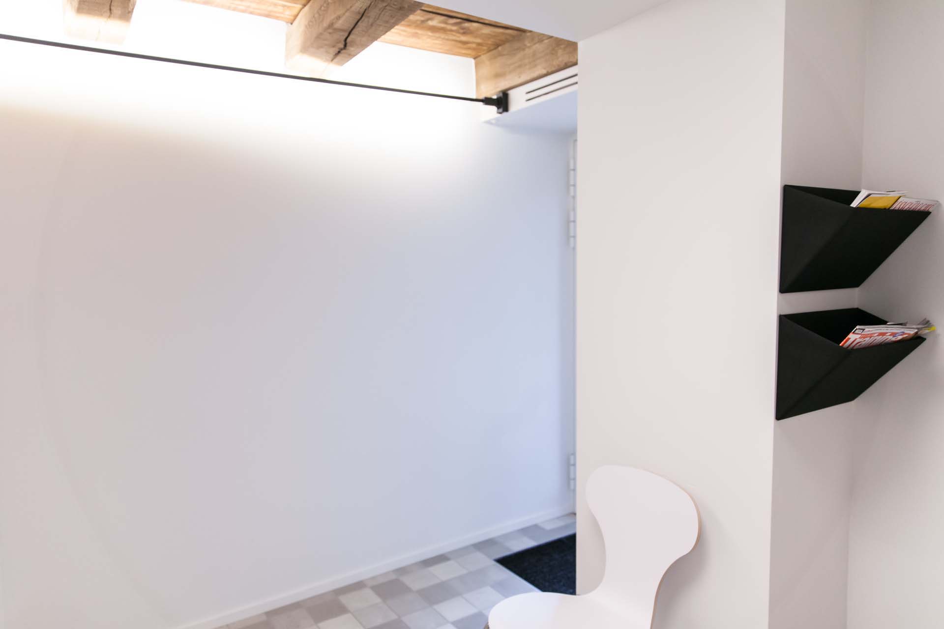 Lors des travaux de démolition, un ancien plafond en bois a été mis à jour et nous avons décidé — en accord avec nos clients — de le garder dans le hall d’accès professionnel… Le résultat est top : la présence du bois rend ses lettres de noblesse à l’ensemble et apporte une douce chaleur, superbement soulignée par un rail lumineux d’une extrême finesse de Davide Groppi. L’ambiance générale à l’espace Gravitéo est douce, réconfortante, soignée, rassurante mais aussi moderne, technique et nette, tous ces qualificatifs qui décrivent si bien le métier du Maître d’Œuvre.