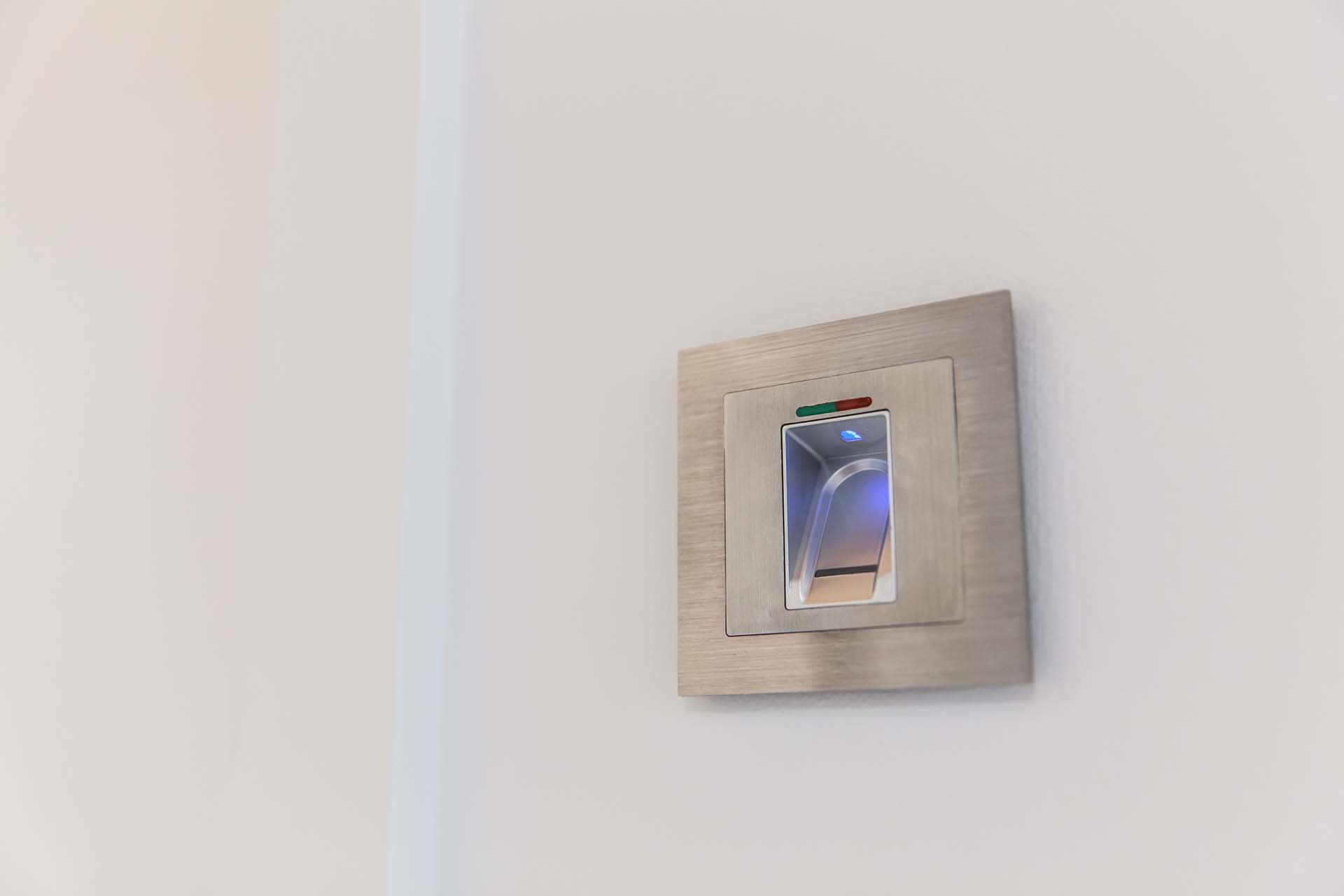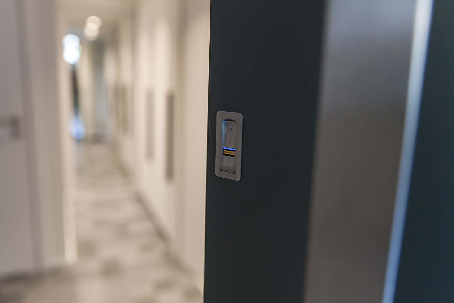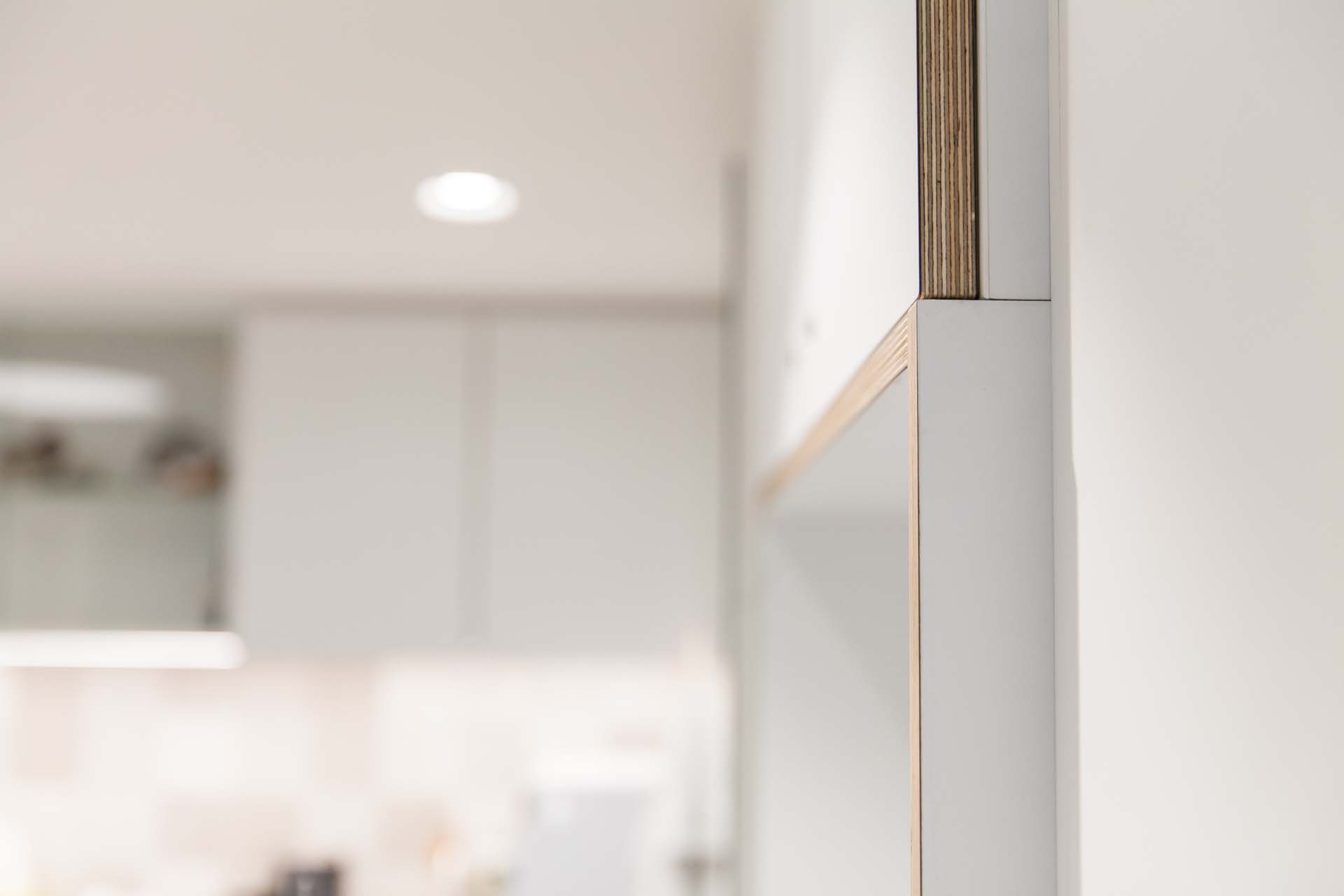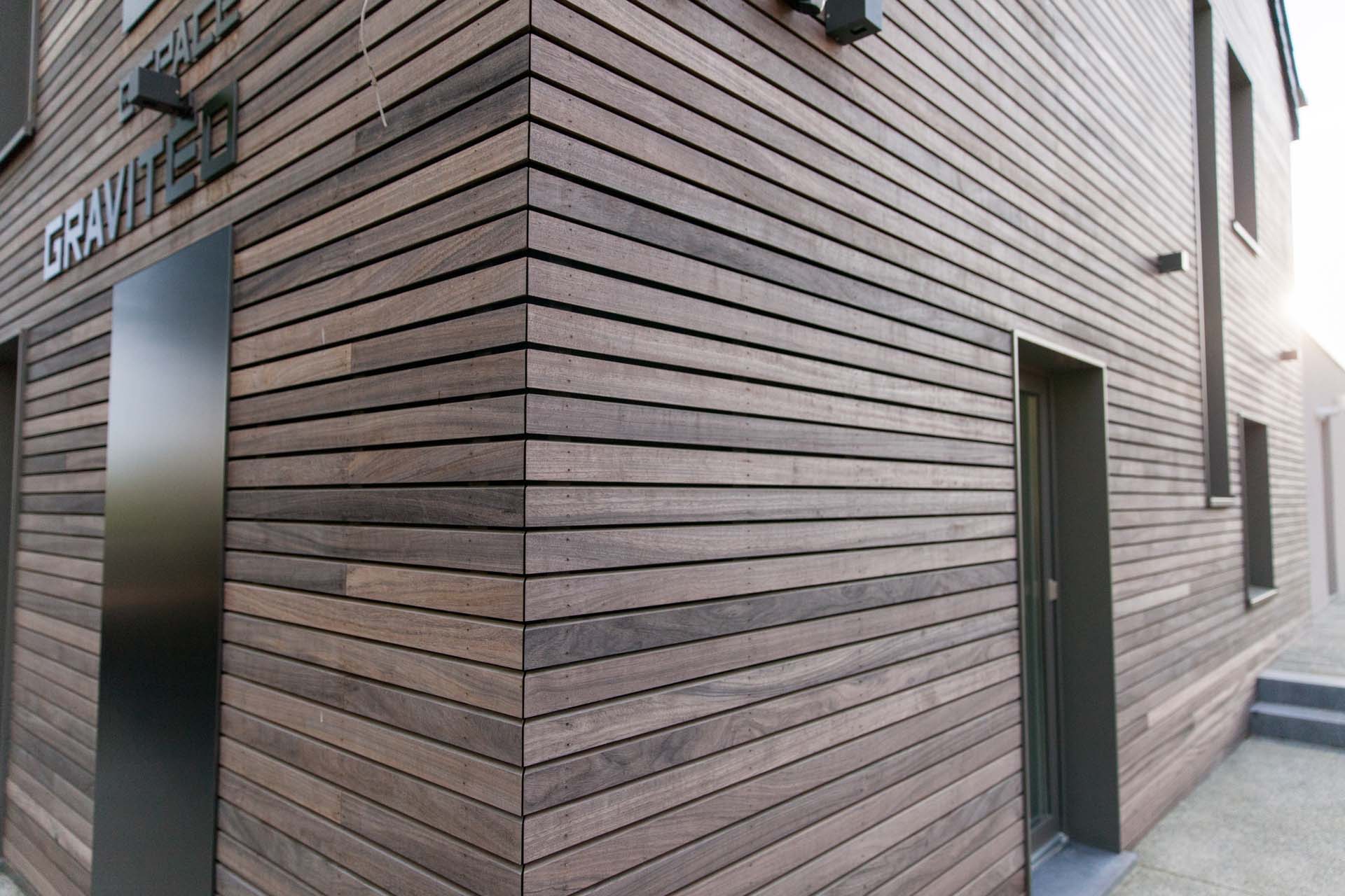 Lors des travaux de démolition, un ancien plafond en bois a été mis à jour et nous avons décidé — en accord avec nos clients — de le garder dans le hall d’accès professionnel… Le résultat est top : la présence du bois rend ses lettres de noblesse à l’ensemble et apporte une douce chaleur, superbement soulignée par un rail lumineux d’une extrême finesse de Davide Groppi. L’ambiance générale à l’espace Gravitéo est douce, réconfortante, soignée, rassurante mais aussi moderne, technique et nette, tous ces qualificatifs qui décrivent si bien le métier du Maître d’Œuvre.