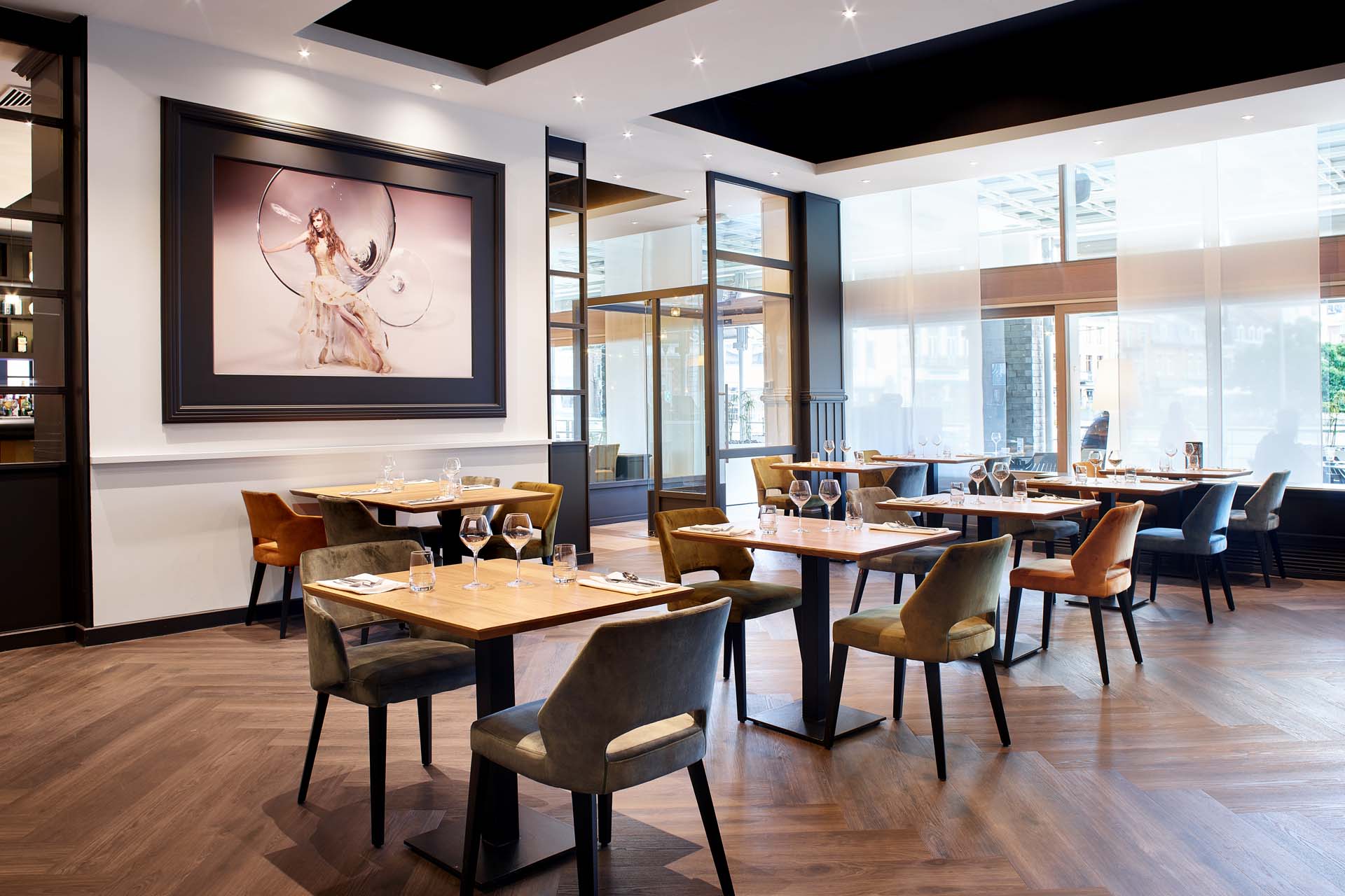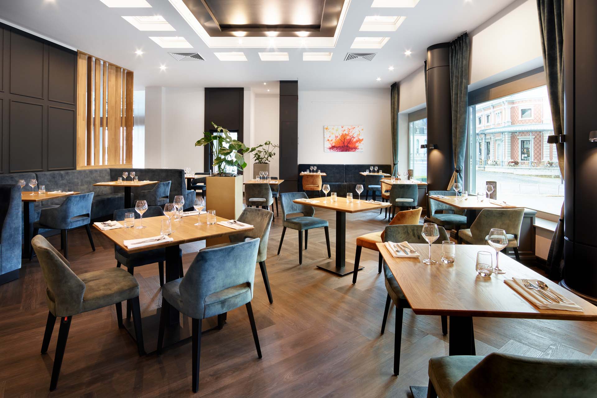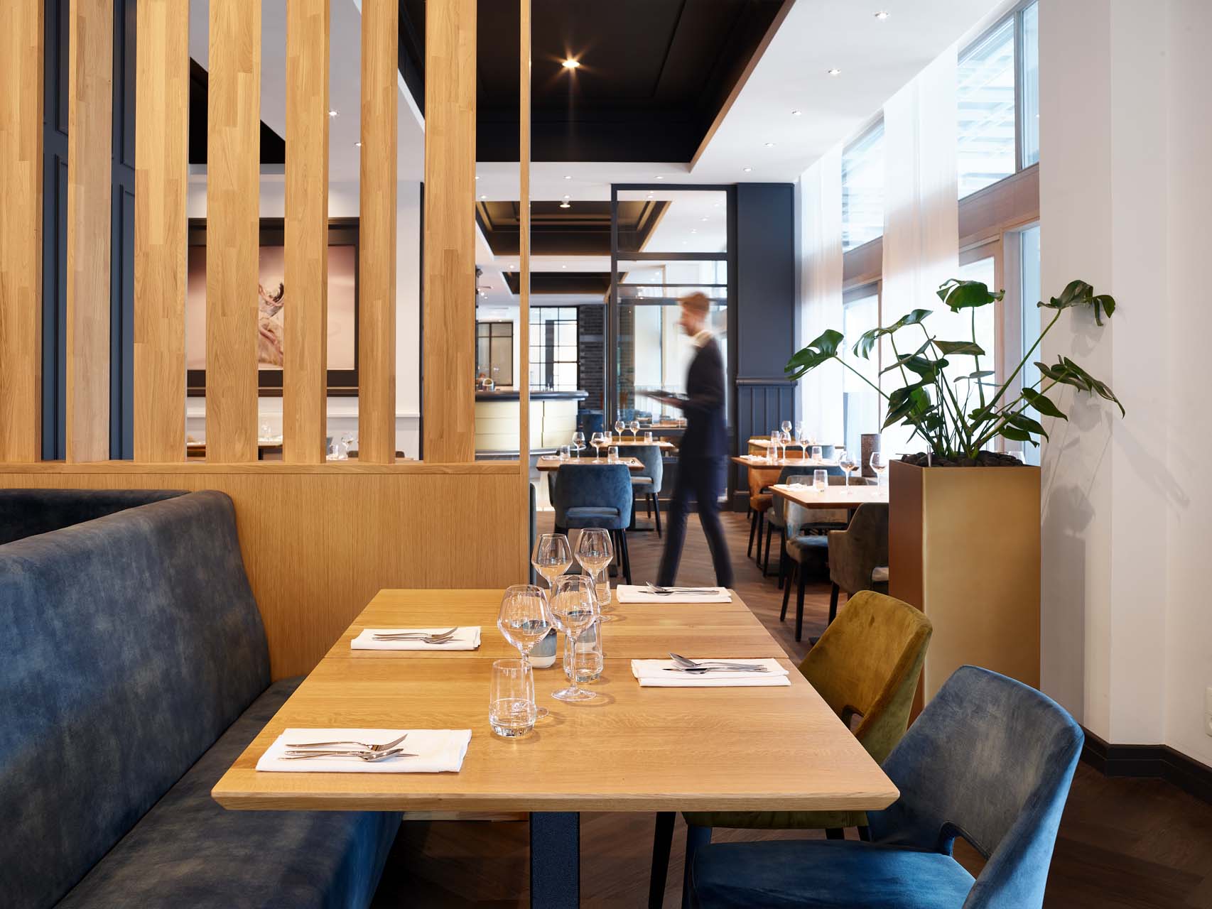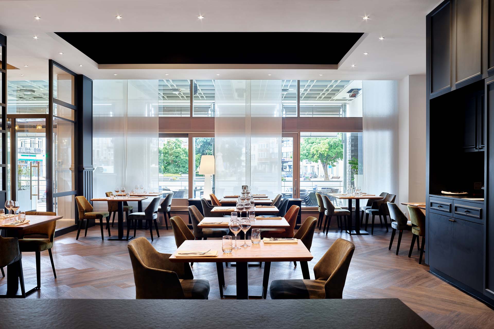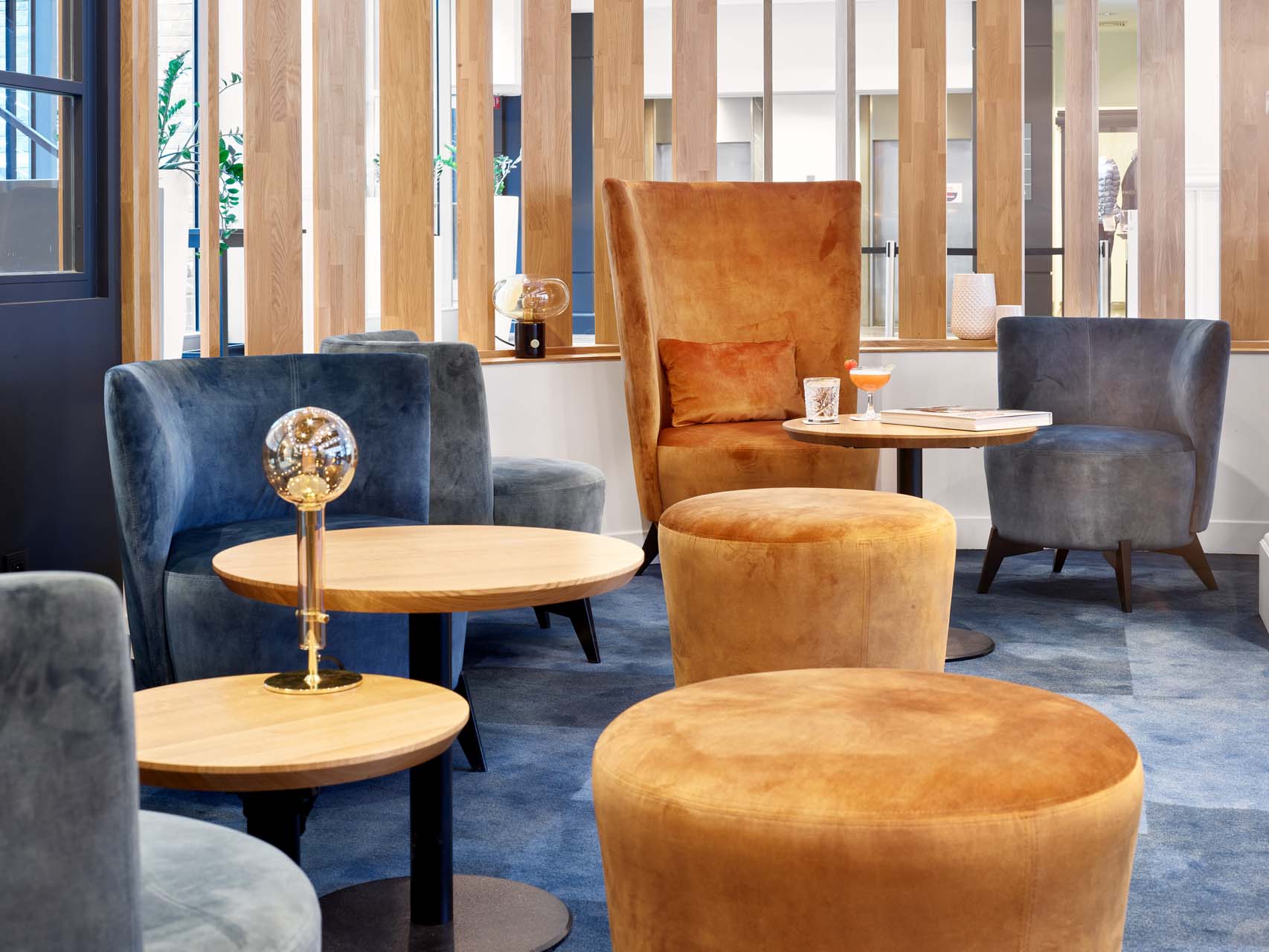 Aménagement réalisé sur mesure en chêne massif et stratifié. Plans de travail bar en céramique. Mobilier du restaurant : chaises LENA de Mobitec, tissu velours de la collection Genova. Mobilier Lounge bar : tabourets hauts Lena de Mobitec et fauteuils 1 ou 2 personnes + pouf de la collection BOLERO de Mobitec, tissus velours de la collection Genova. Sol du lobby : moquette EGE. Sol du restaurant : parquet Tarkett ID Supernature. Eclairage : LED-C4. Mobilier terrasse : Vondom, collection Spritz