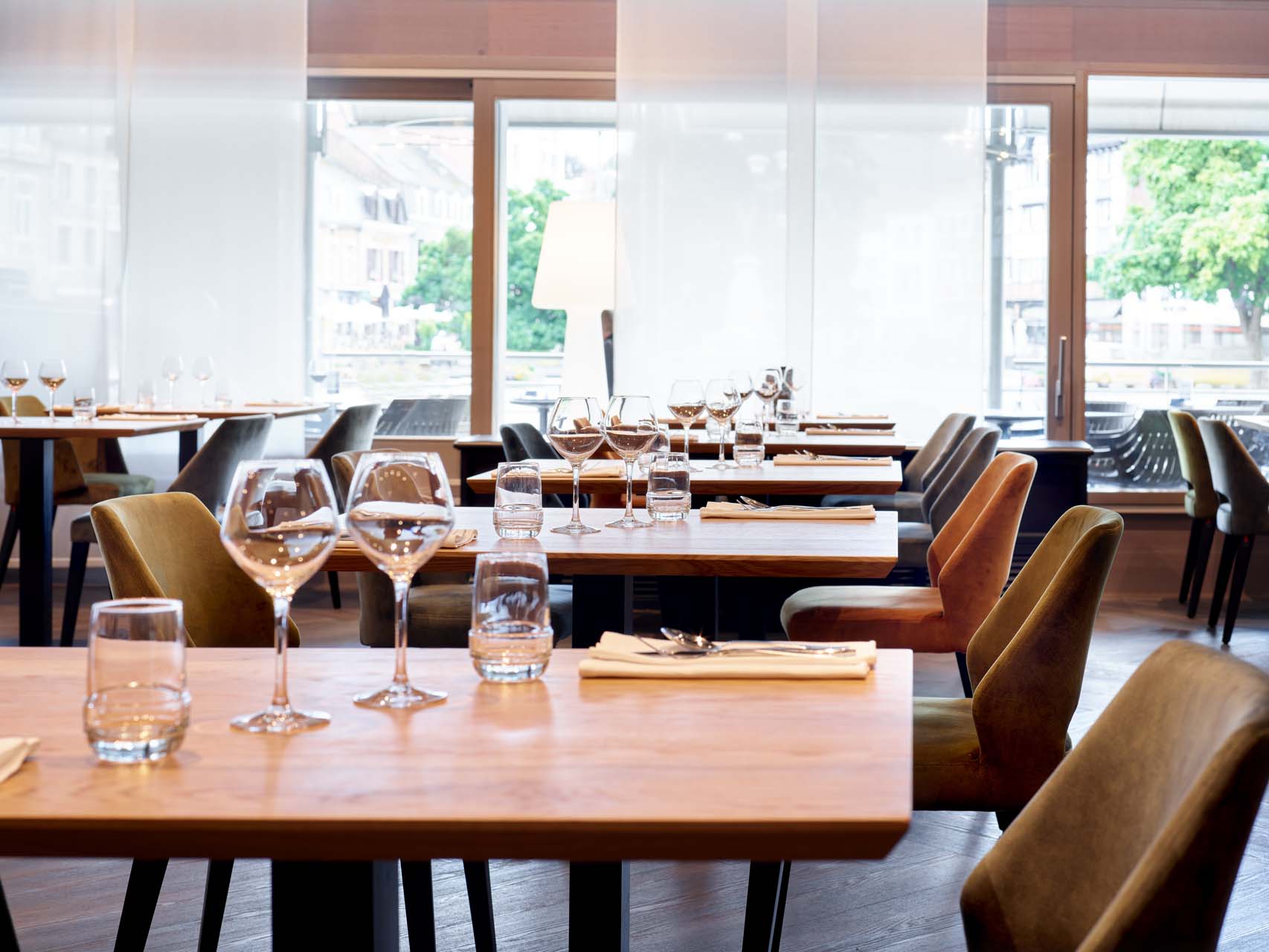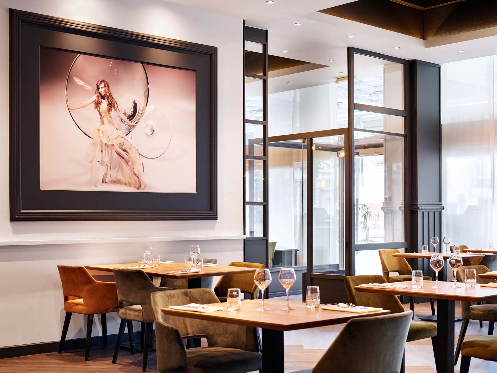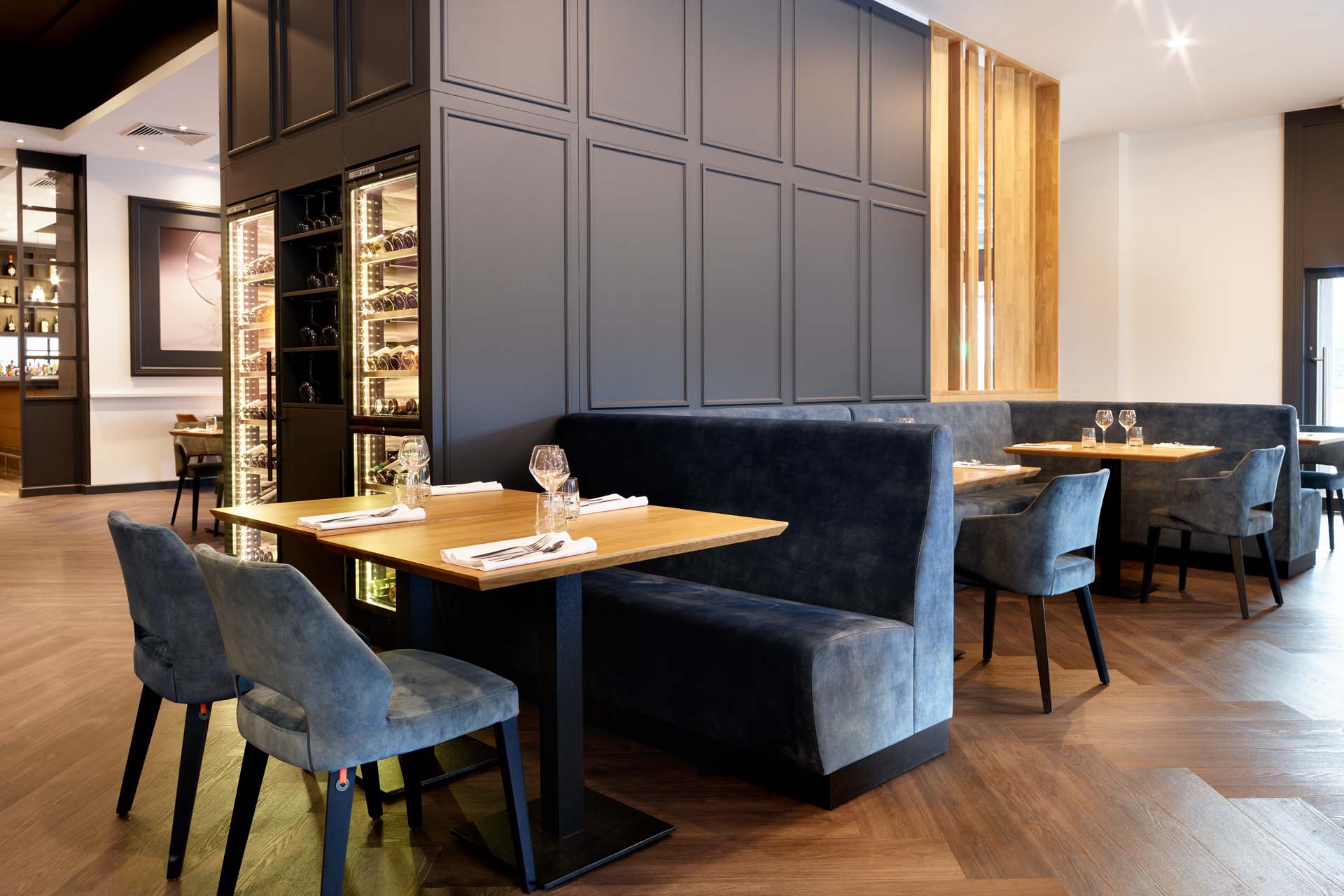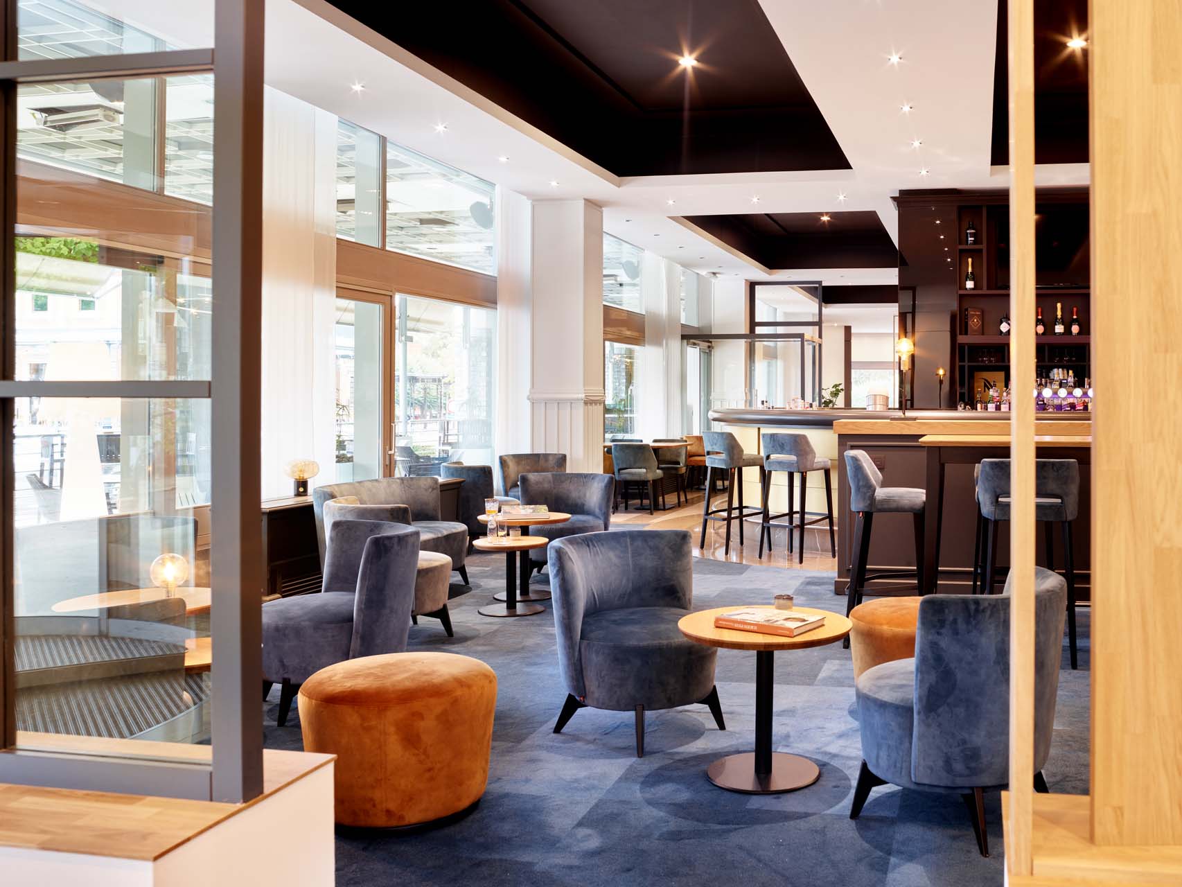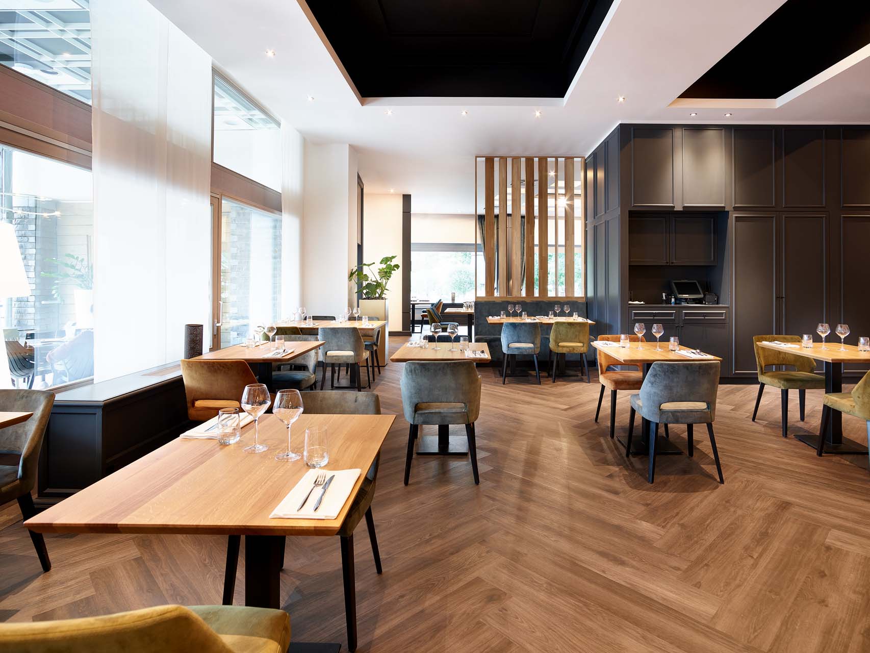 Aménagement réalisé sur mesure en chêne massif et stratifié. Plans de travail bar en céramique. Mobilier du restaurant : chaises LENA de Mobitec, tissu velours de la collection Genova. Mobilier Lounge bar : tabourets hauts Lena de Mobitec et fauteuils 1 ou 2 personnes + pouf de la collection BOLERO de Mobitec, tissus velours de la collection Genova. Sol du lobby : moquette EGE. Sol du restaurant : parquet Tarkett ID Supernature. Eclairage : LED-C4. Mobilier terrasse : Vondom, collection Spritz